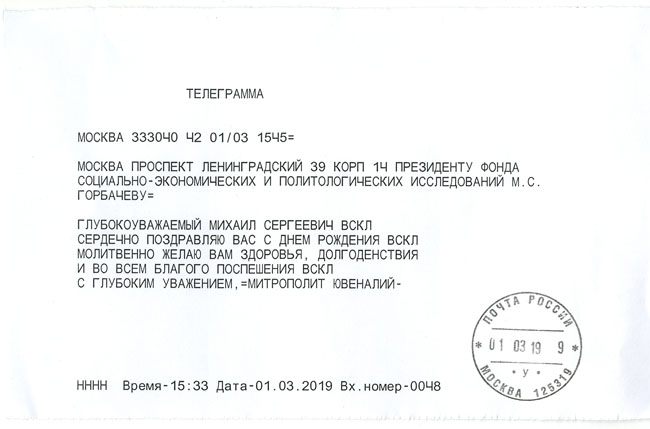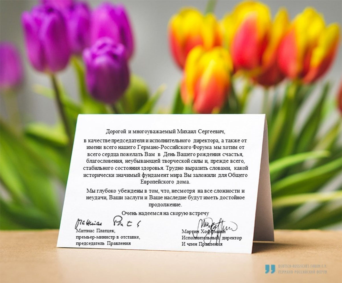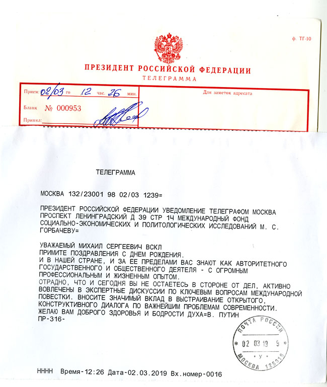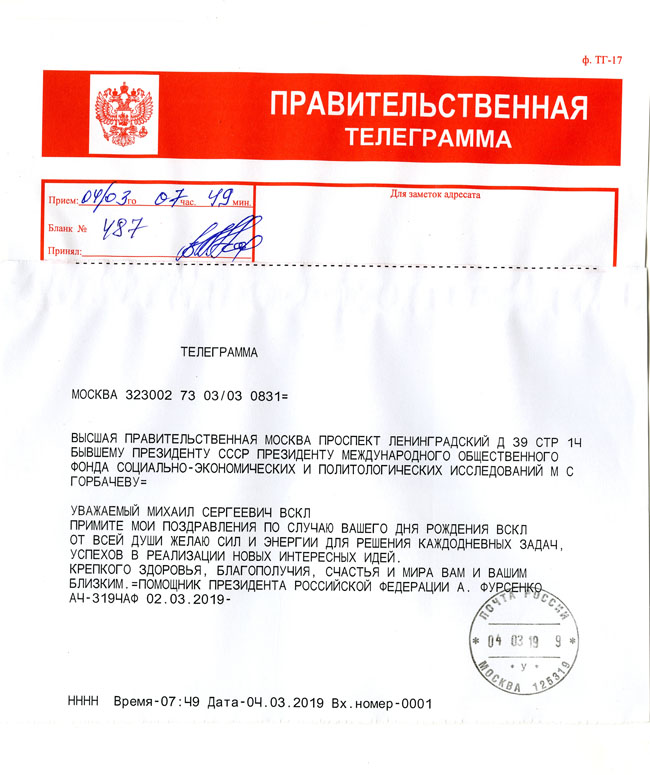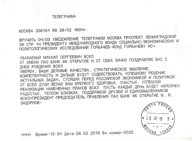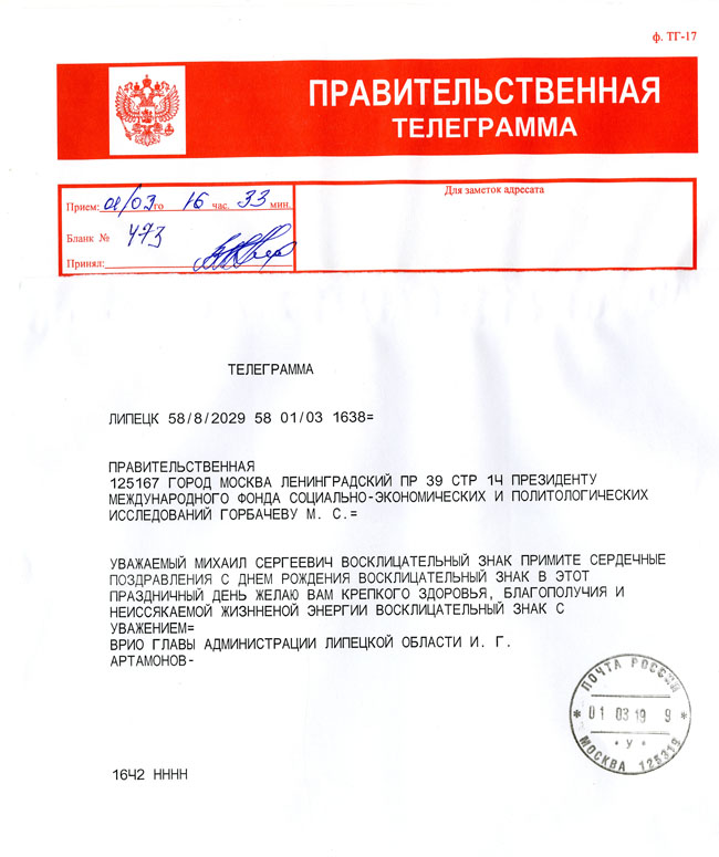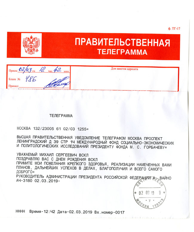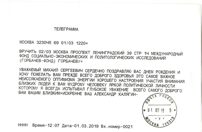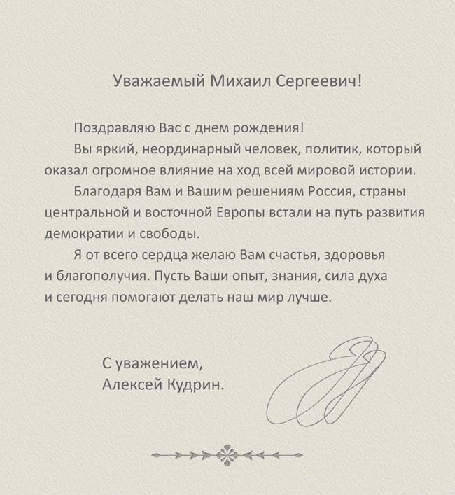 Глубокоуважаемого Михаила Сергеевича Горбачева от всей души поздравляю с днем рожденья и сердечно благодарю - вчера, сегодня, завтра, и ныне, и присно!..