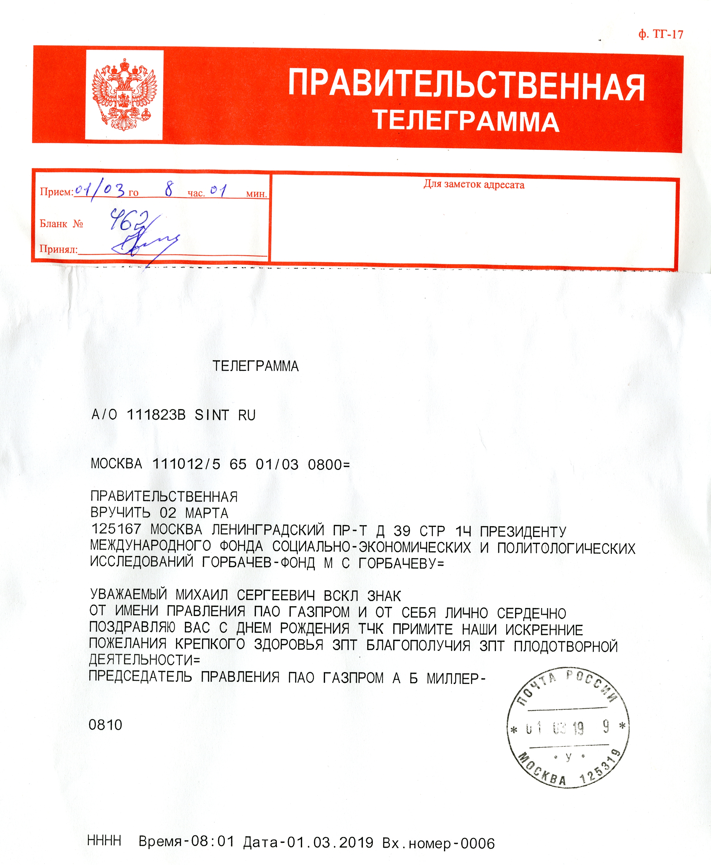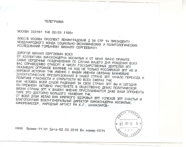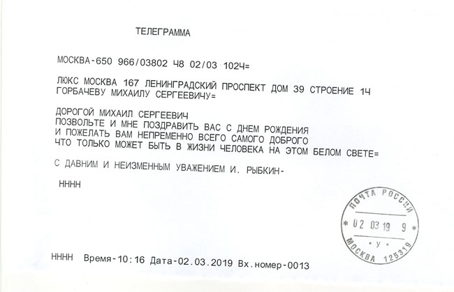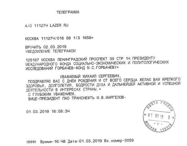 Прошу Вас передать мою признательность и засвидетельствовать М.С. Горбачеву моё искреннее почтение.