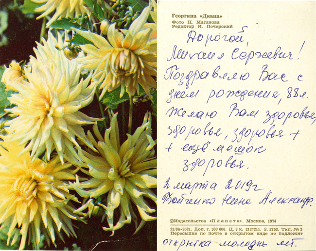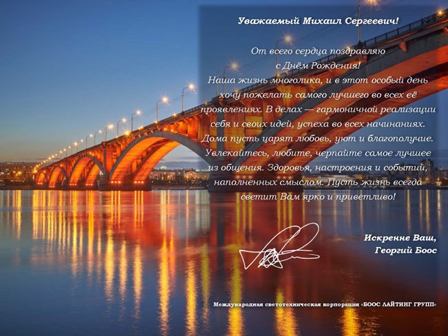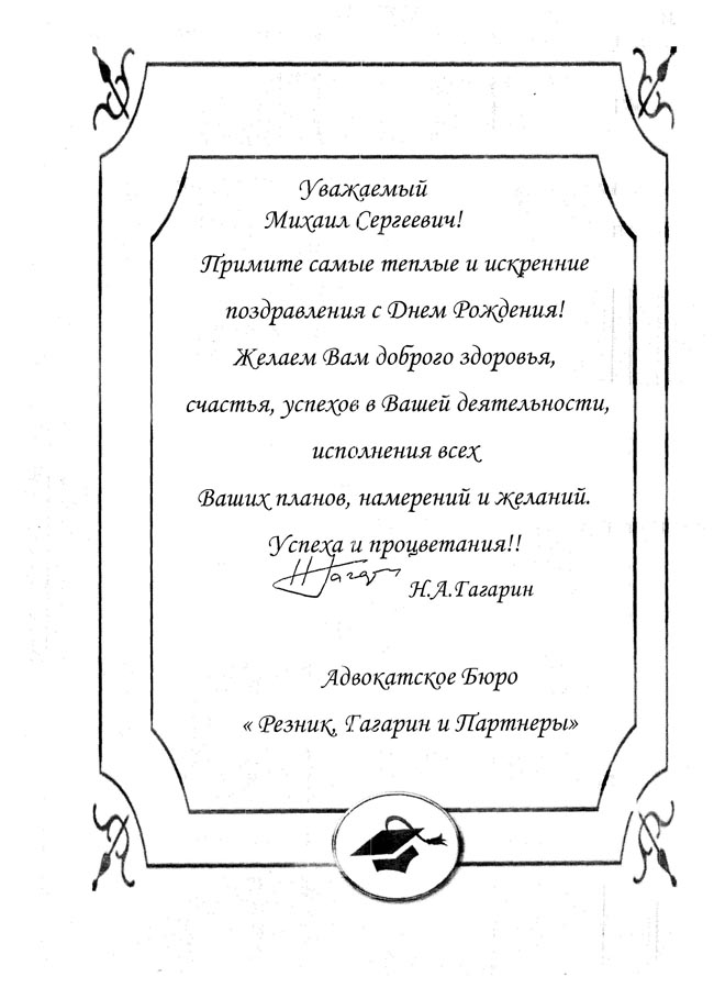 Уважаемый Михаил Сергеевич! С днем рождения! Здоровья вам, хорошего настроения и успехов! С уважением, Федор, Татьяна, Иван Устюговы, Владивосток