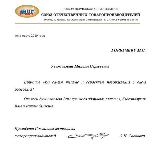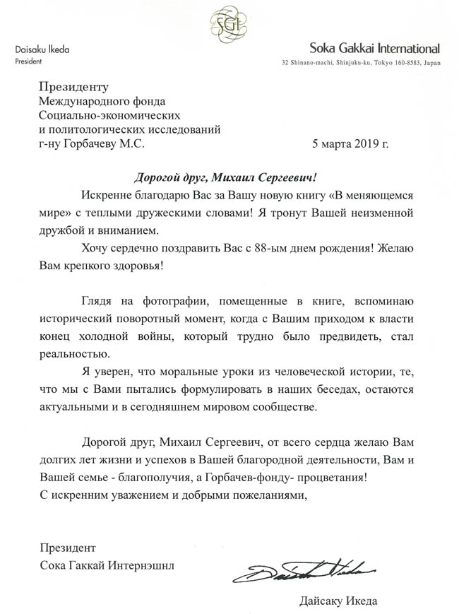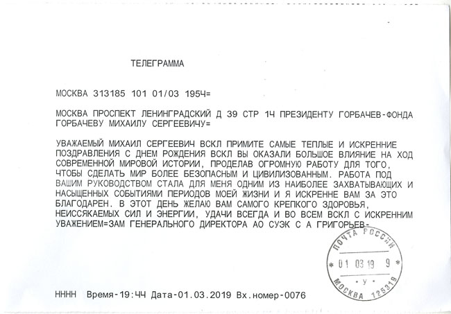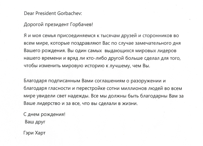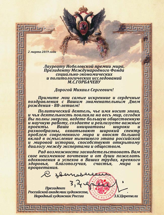 На историю всегда накладывают печать великие личности. Вы, глубокоуважаемый Михаил Сергеевич, являете собой достойный восхищения образец человека, посвятившего себя политике мира. Мы высоко ценим Вас как выдающегося государственного деятеля.
