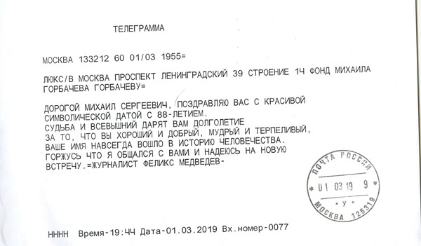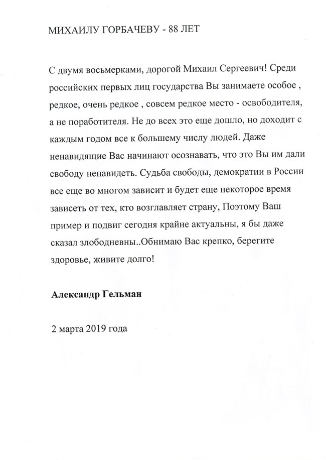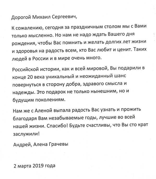 Уважаемый Михаил Сергеевич! Я простой гражданин РФ, мне 52 года. Разрешите от чистого сердца поздравить Вас, с Днем рождения - 88 летием. Я всегда уважал, уважаю и буду уважать Вас, как личность, как политика, как человека, благодаря решению \звонку\ которого, в 1988 году, в Харьковской области была дана вторая жизнь моему умирающему племяннику, возраст которого тогда был менее 1 года. Не каждый Глава государства занялся бы конкретным человеком. Вы исключение и это запомниться нашей семье навсегда. Спасибо Вам за всё и долгих лет жизни.
