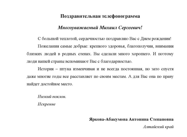 ...Буду верить, что мое поздравление кто-нибудь умный докатит до Михаила Сергевича... Я с ним даже знакома!..