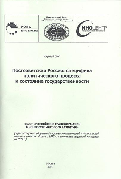Постсоветская Россия: специфика политического процесса и состояние государственности: Круглый стол "Экспертиза" (27 сентября 2008). Горбачев-Фонд; Ино-Центр; Фонд «Новая Евразия». – М.; 2008. - 125 с.
