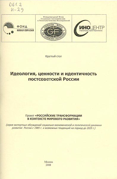 Идеология, ценности и идентичность постсоветской России: Круглый стол "Экспертиза" (21 ноября 2008). Горбачев-Фонд; Ино-Центр; Фонд «Новая Евразия». – М.; 2008. - 80 с.