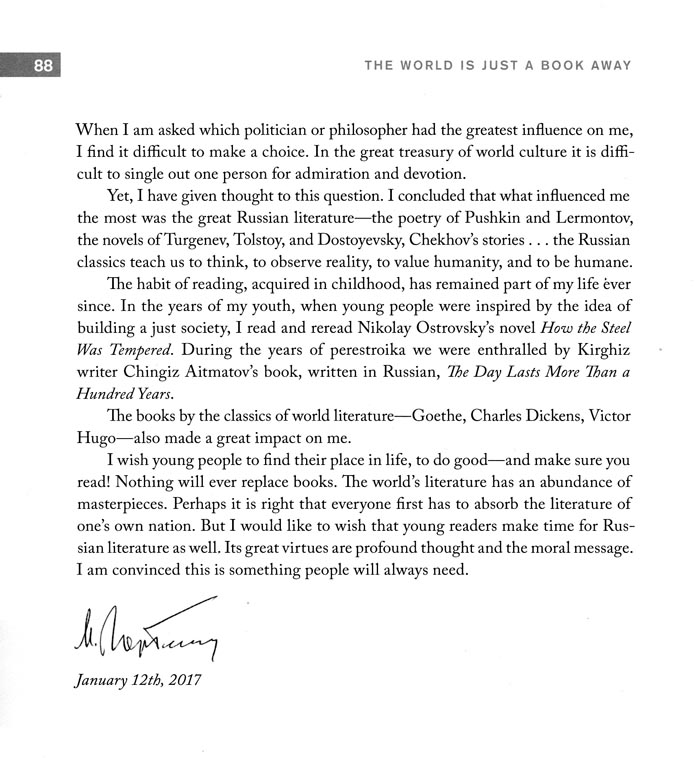 Mikhail Gorbachev contributed to "The World is Just a Book Away" Project"The Russian classics teach us to think, to observe reality, to value humanity, and to be humane." - President Mikhail Gorbachev