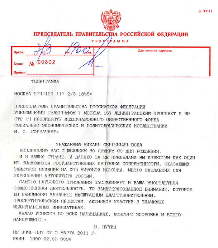 Лауреату Нобелевской премии мира, президенту Международного фонда социально-экономических и политологических исследований М.С.Горбачеву.