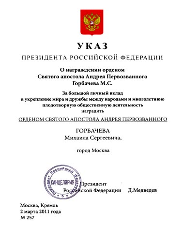 Заявление М.С.Горбачева при вручении ему ордена Святого апостола Андрея Первозванного