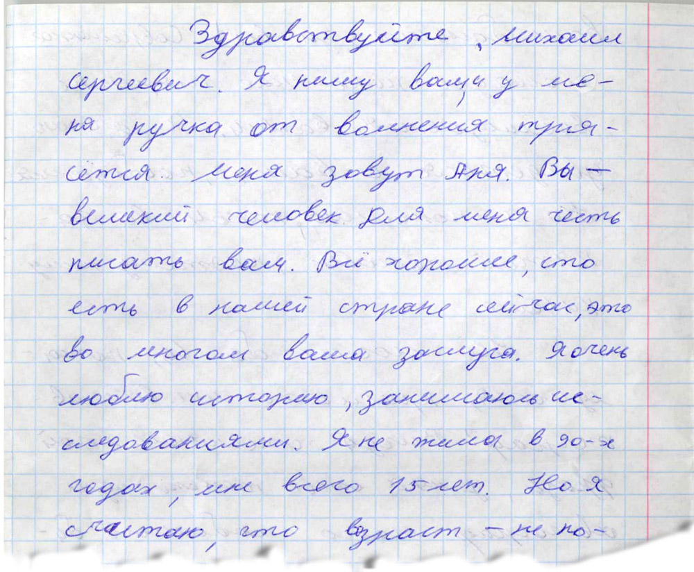 Здравствуйте, Михаил Сергеевич! Я пишу вам, у меня ручка от волнения трясется. Меня зовут Аня. Вы – великий человек. Для меня честь писать вам. Все хорошее, что есть в нашей стране сейчас, это во многом Ваша заслуга. Я очень люблю историю, занимаюсь исследованиями. Я не жила в 90-х годах, мне всего 15 лет. Но я считаю, что возраст – не показатель знаний. Вы интересовали меня еще класса с 4, теперь уже я читаю ваши книги, изучаю вашу биографию, и знаете… Я прониклась еще большим уважением к Вам. Мои сверстники тоже уважают Вас, Михаил Сергеевич, спасибо Вам большое за все! Современное молодое поколение искренне восхищается Вами. Я мечтаю увидеться с Вами, пообщаться. Но я понимаю, какой Вы занятой человек, поэтому пишу письмо. Не могли бы Вы, пожалуйста, прислать мне Ваш автограф? Всегда стесняюсь этой фразы, у меня есть только один автограф моего любимого биатлониста. Прости, если что, пожалуйста. Я конверт и фото вложила. И сувенирчик из Нижнего Новгорода. Я желаю Вам крепкого здоровья, счастья, удачи, радости и всего самого лучшего. P.S. Не хочу вас спрашивать о политике, думаю, вы и так часто слышите такие вопросы. Мне бы очень хотелось узнать, какой ваш любимый вид спорта? Смотрите ли вы его вообще или уже не хватает времени? Например, ваш однофамилец Евгений Горбачев пятикратный чемпион мира похоккею с мячом. Спасибо еще раз! Постникова Анна,