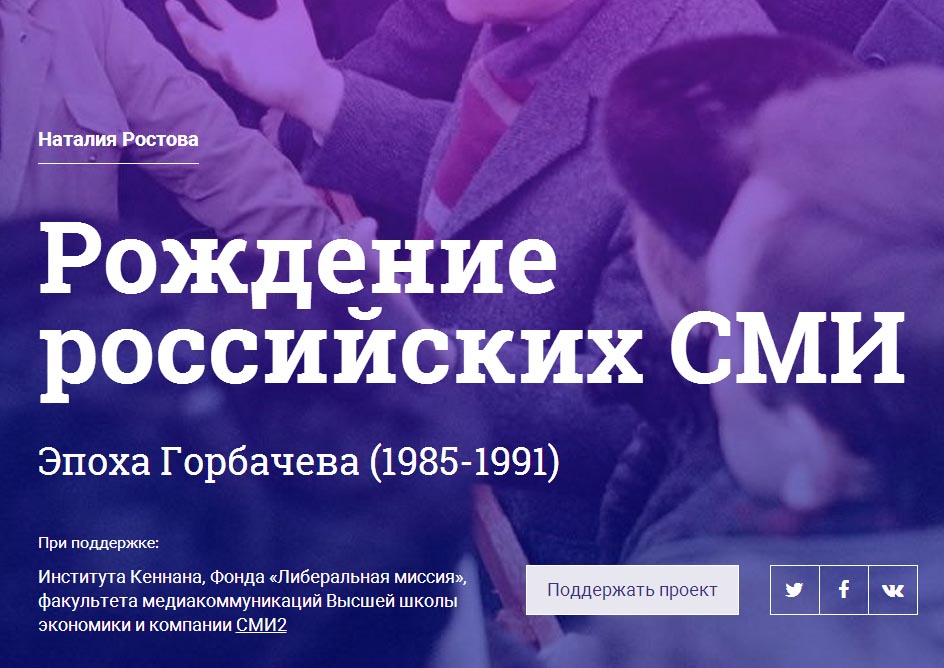 Наталья Ростова: «Горбачев - масштабнейшая историческая фигура, и было бы просто оскорбительно врать на его счет. Не для того он отменил цензуру»ПРЕДСТАВЛЯЕМ НОВЫЙ ИНТЕРНЕТ ПРОЕКТ «РОЖДЕНИЕ РОССИЙСКИХ СМИ» Представляем вниманию посетителей сайта Горбачев-Фонда интернет-проект журналистки Наталии Ростовой "Рождение российских СМИ" (1985-1991), посвященный роли и эволюции средств массовой информации в эпоху Перестройки.Интернет-проект "Рождение российских СМИ" содержит не только ключевые публикации периода Перестройки, но и интервью Наталии Ростовой с главными редакторами и журналистами того времени, что позволяет получить более объемное представление о роли средств массовой информации в перестроечных процессах, меняющихся отношениях между партийно-государственным аппаратом и журналистами и стремительной утрате КПСС монополии на информацию.