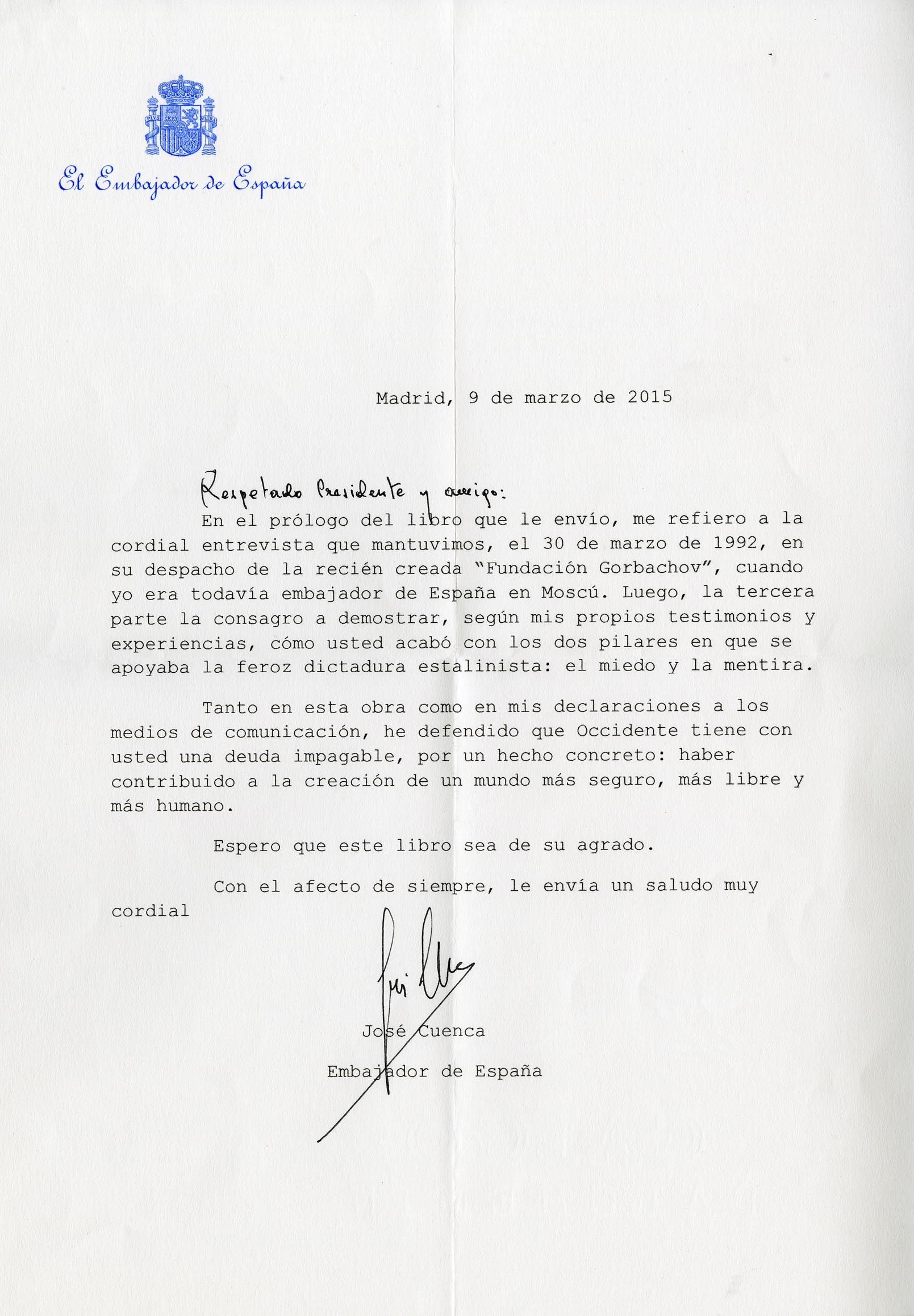 Хосе Куэнка: «Вы положили конец двум устоям, на которых строилась жестокая сталинская диктатура - страх и ложь»В Мадриде прошла презентация книги видного испанского дипломата и писателя Хосе Куэнки - посла Испании в СССР и Российской Федерации (1986-1992 гг.) "От Суареса до Горбачева. Воспоминания и откровения одного Посла". Мы публикуем письмо Посла Испании Хосе Куэнки Президенту Михаилу Горбачеву в оригинале и в переводе на русский язык. Перевод с испанского Мадрид, 9 марта 2015 г. Уважаемый господин Президент и друг!