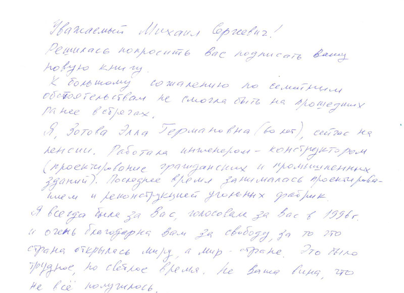 Не сочтите за наглость, что пишу это письмо, но уж больно сильные эмоции захлестнули меня в последние пару дней. Не могу себе представить откуда в людях взялось столько ненависти и злобы по отношению к Михаилу Сергеевичу. Жители нашей страны проклинают Михаила Сергеевича только за то, что он пытался дать им свободу выбора. Свободу слова. Свободу мысли и истинную демократию. Никогда бы не подумал, что люди могут столь сильно заблуждаться и ненавидеть человека только за то, что он являлся последним главой СССР, ведь отнюдь не Михаил Сергеевич подписывал беловежские соглашения! Это событие было, в том числе, и предательством по отношению к нему. Не надеюсь на ответ или хотя бы прочтение данного письма, просто не смог более сдержать своих мыслей по поводу этой беспочвенной ненависти к великому человеку. Желаю дорогому Михаилу Сергеевичу долгих лет жизни, большого здоровья.