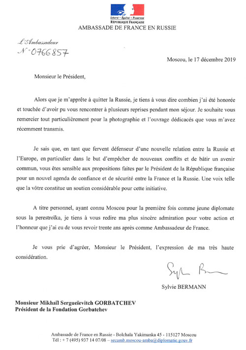 Письмо Михаилу Сергеевичу Горбачёву от Посла Франции Сильви БерманнУважаемый Господин Президент,