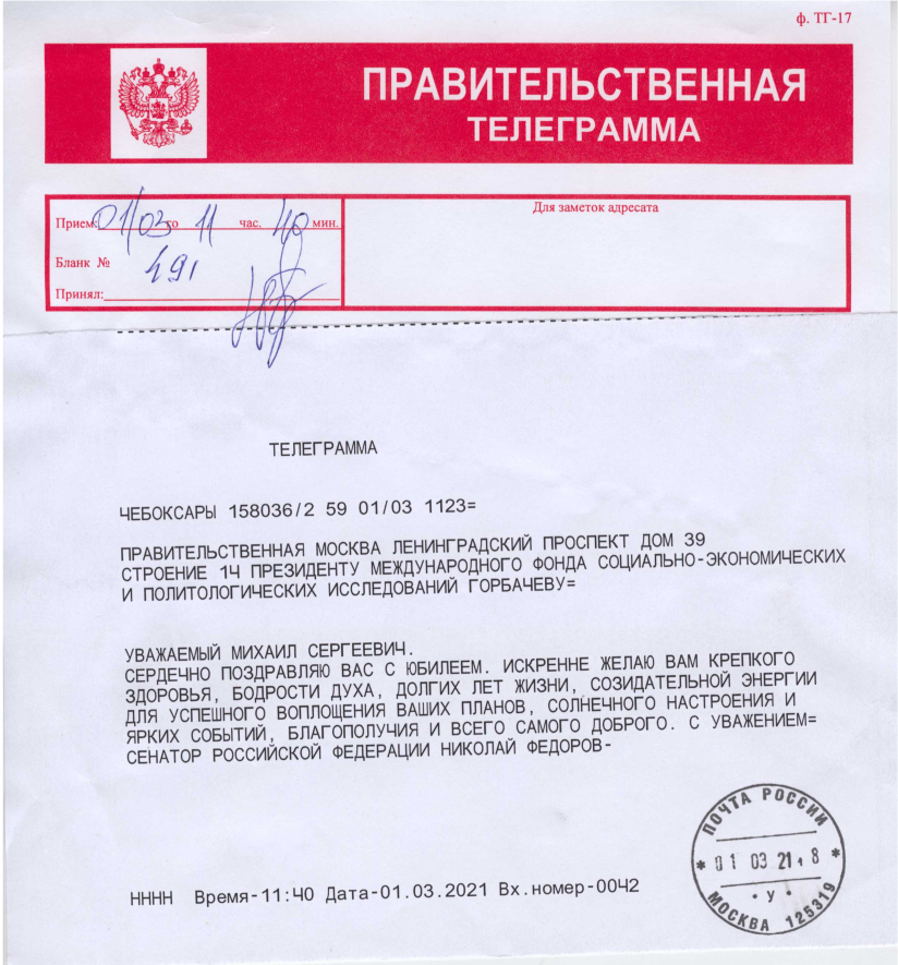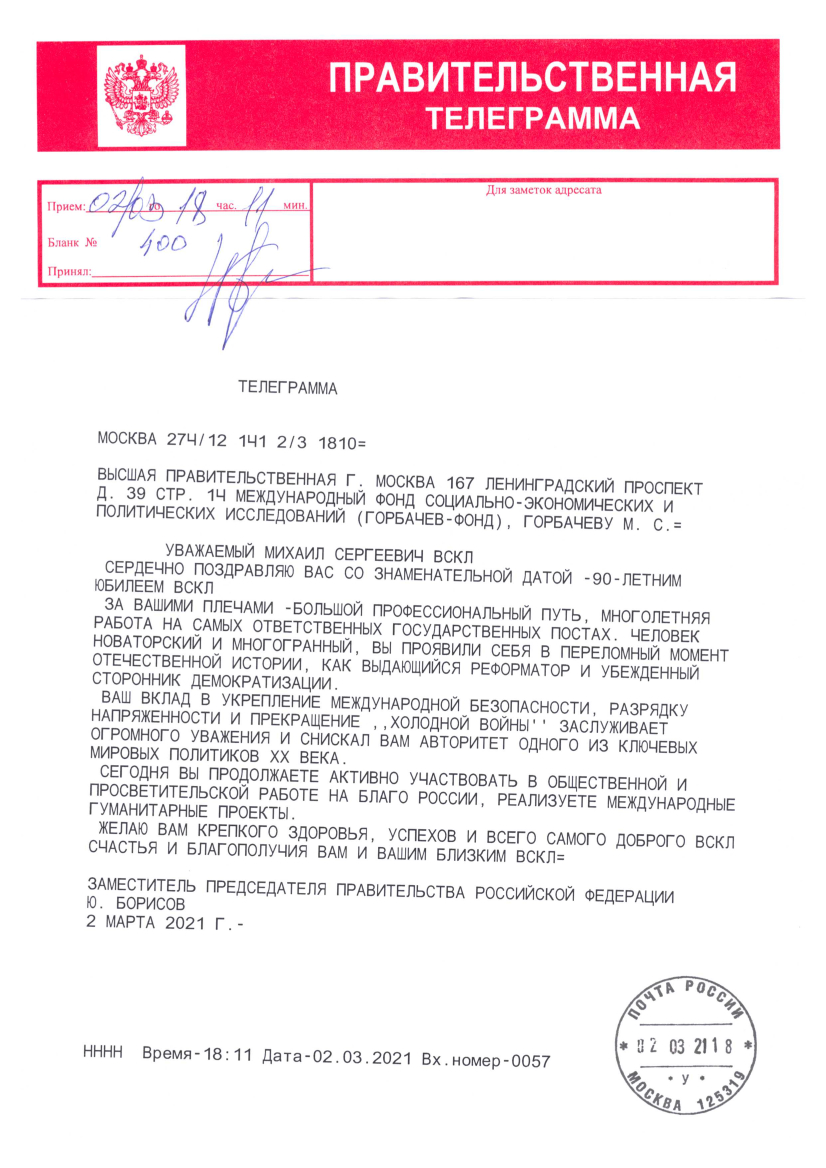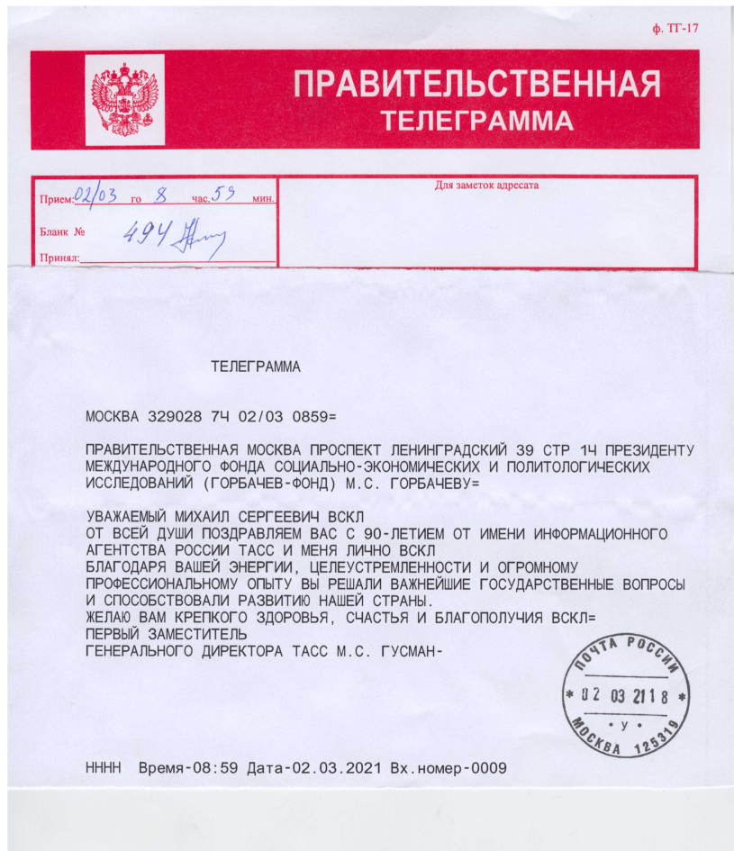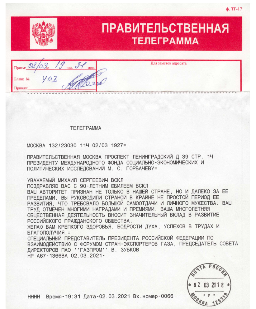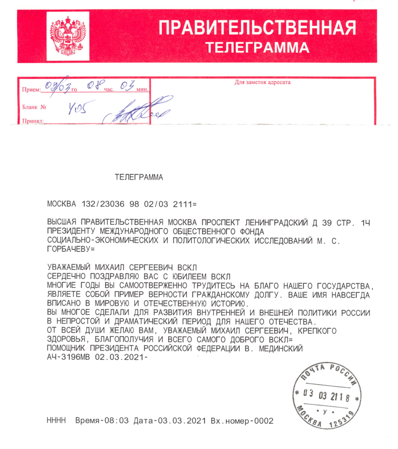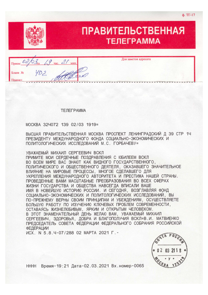 Поздравления М.С. Горабчеву с 90-летиемВ последние дни в Фонд поступает большое количество поздравлений М.С.Горбачеву с 90-летием, а также публикаций в СМИ в связи с этой юбилейной датой. Мы будем постепенно знакомить вас с наиболее интересными телеграммами, письмами и статьями. Пресс-служба 4 марта 2021 года