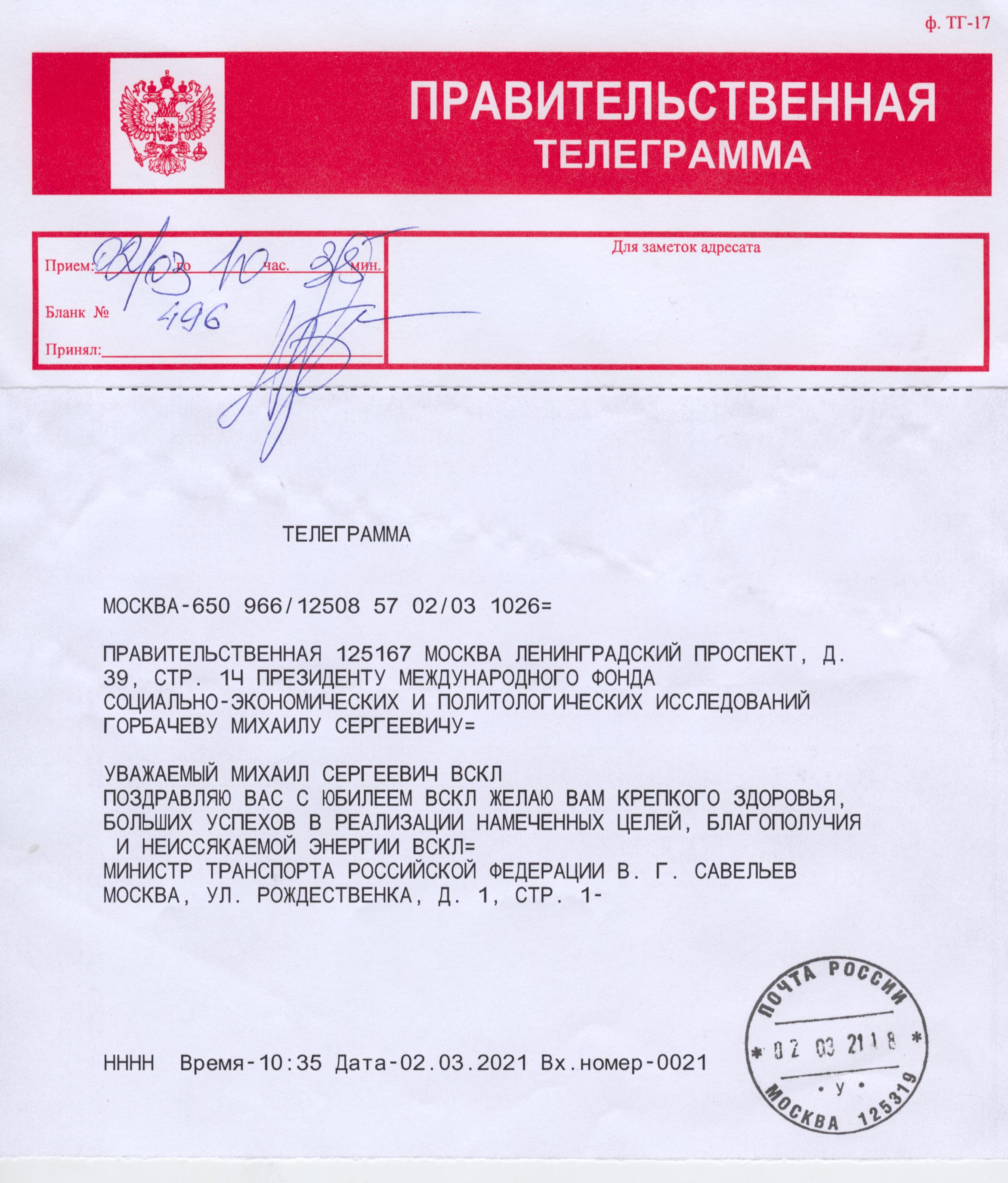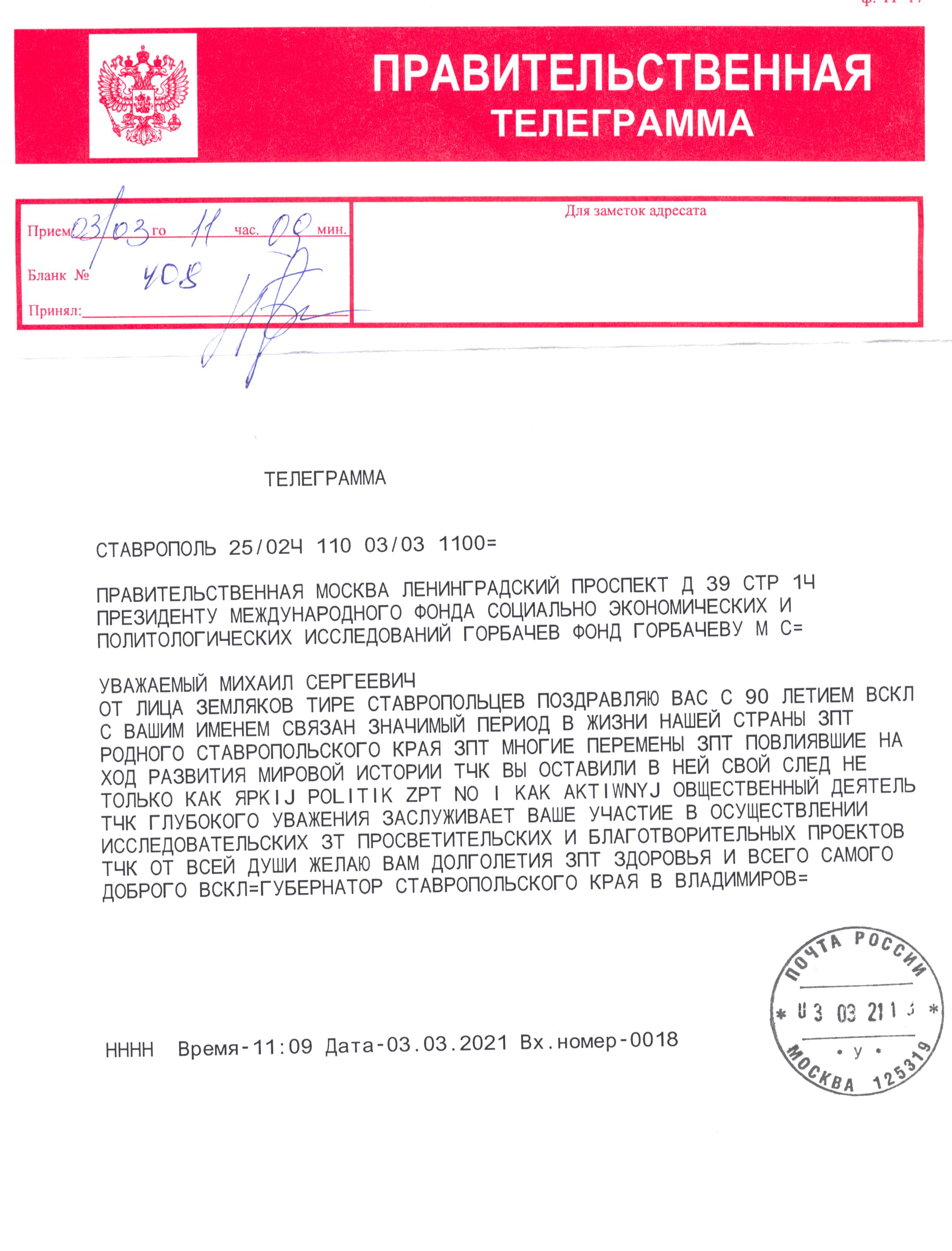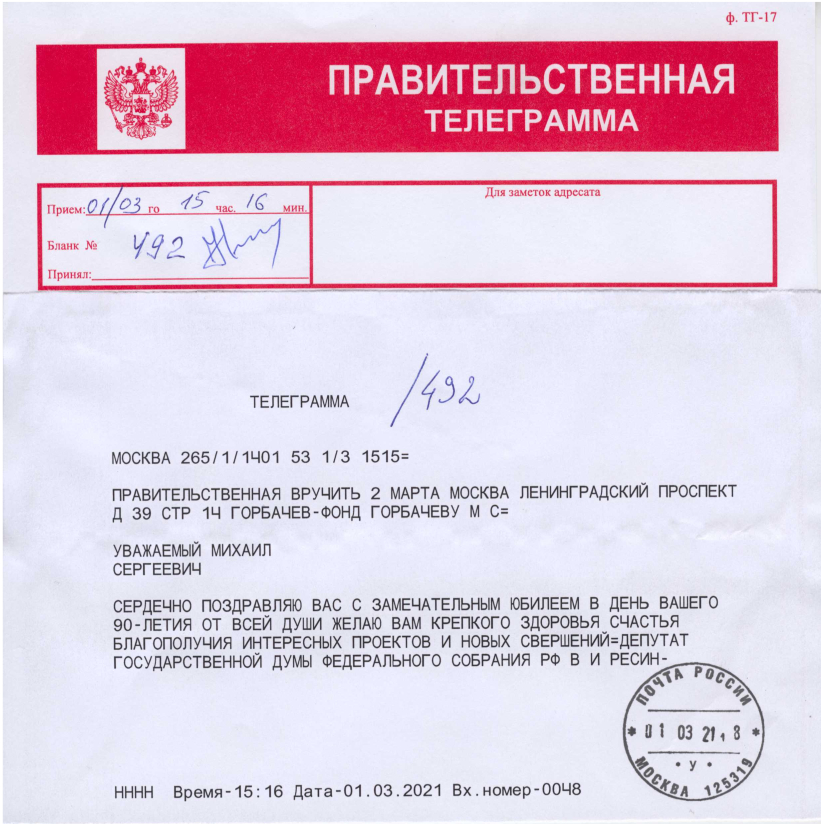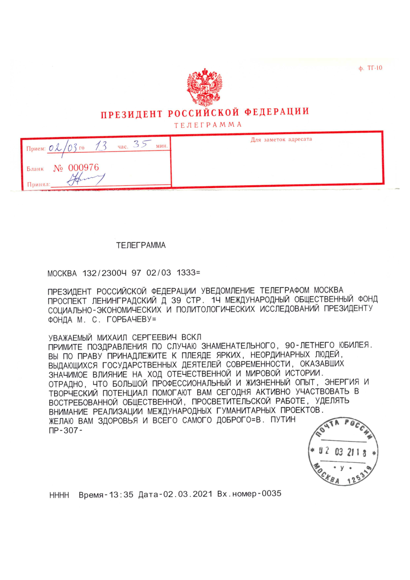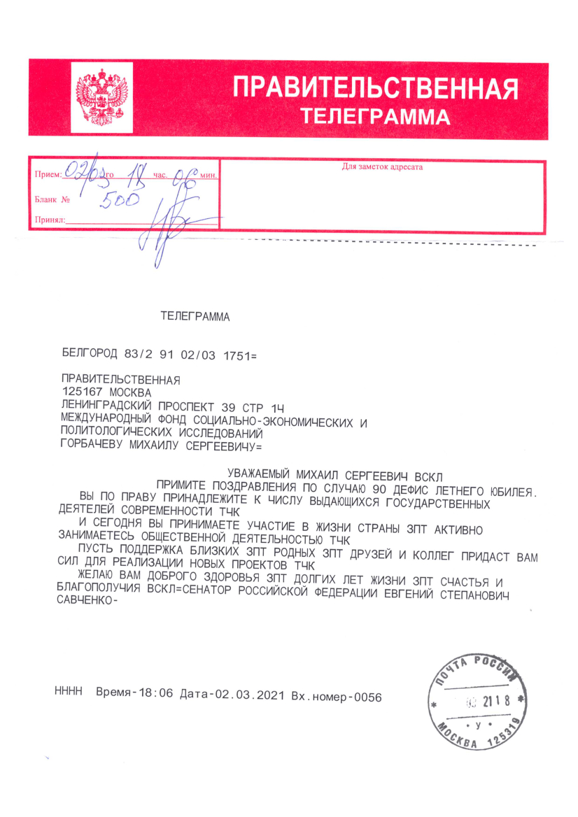 Поздравления М.С. Горабчеву с 90-летиемВ последние дни в Фонд поступает большое количество поздравлений М.С.Горбачеву с 90-летием, а также публикаций в СМИ в связи с этой юбилейной датой. Мы будем постепенно знакомить вас с наиболее интересными телеграммами, письмами и статьями. Пресс-служба 4 марта 2021 года