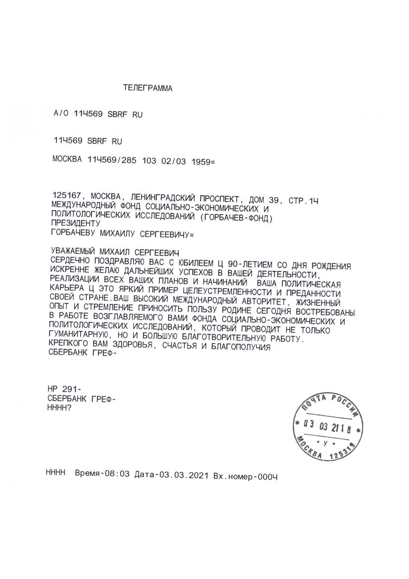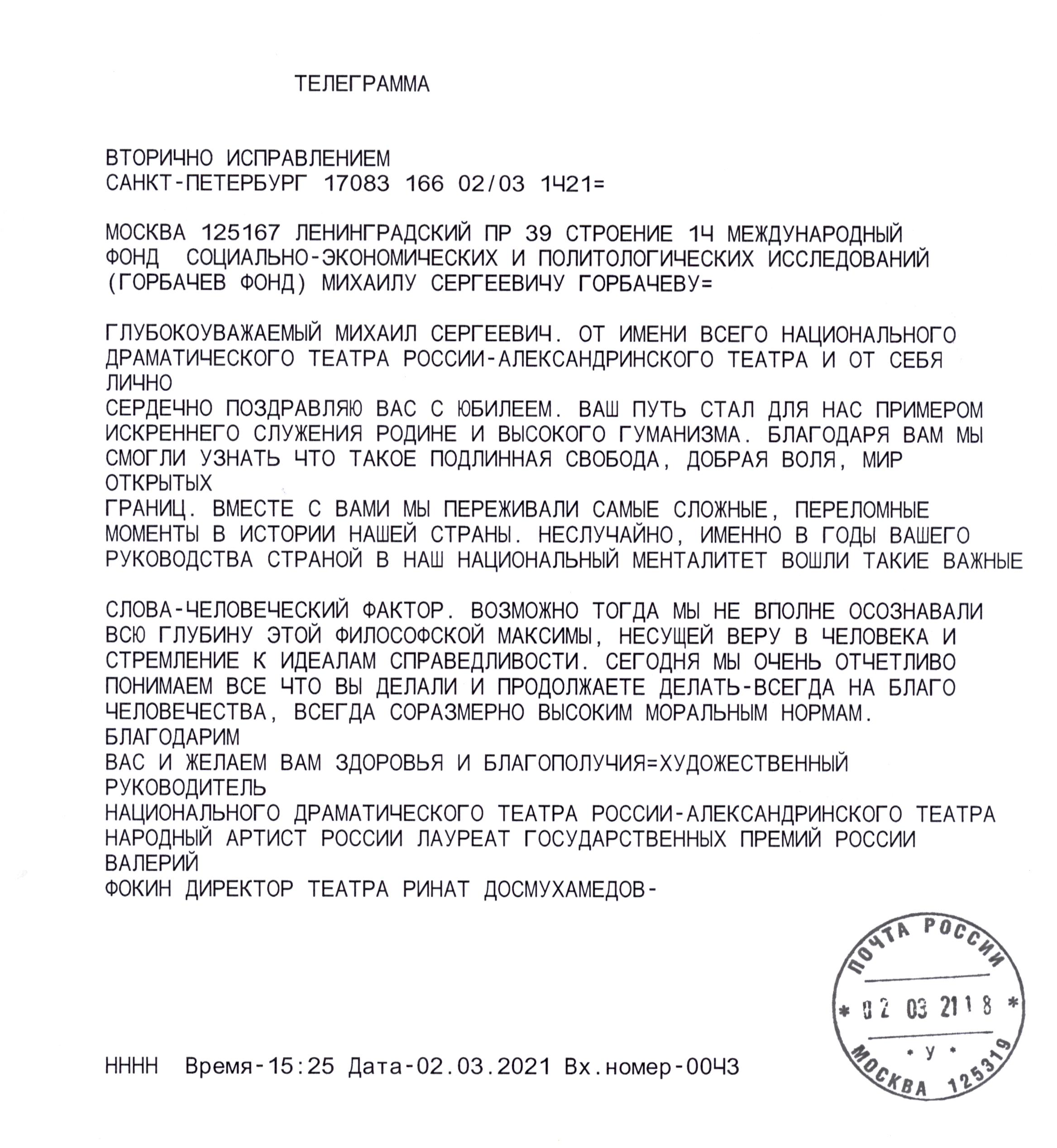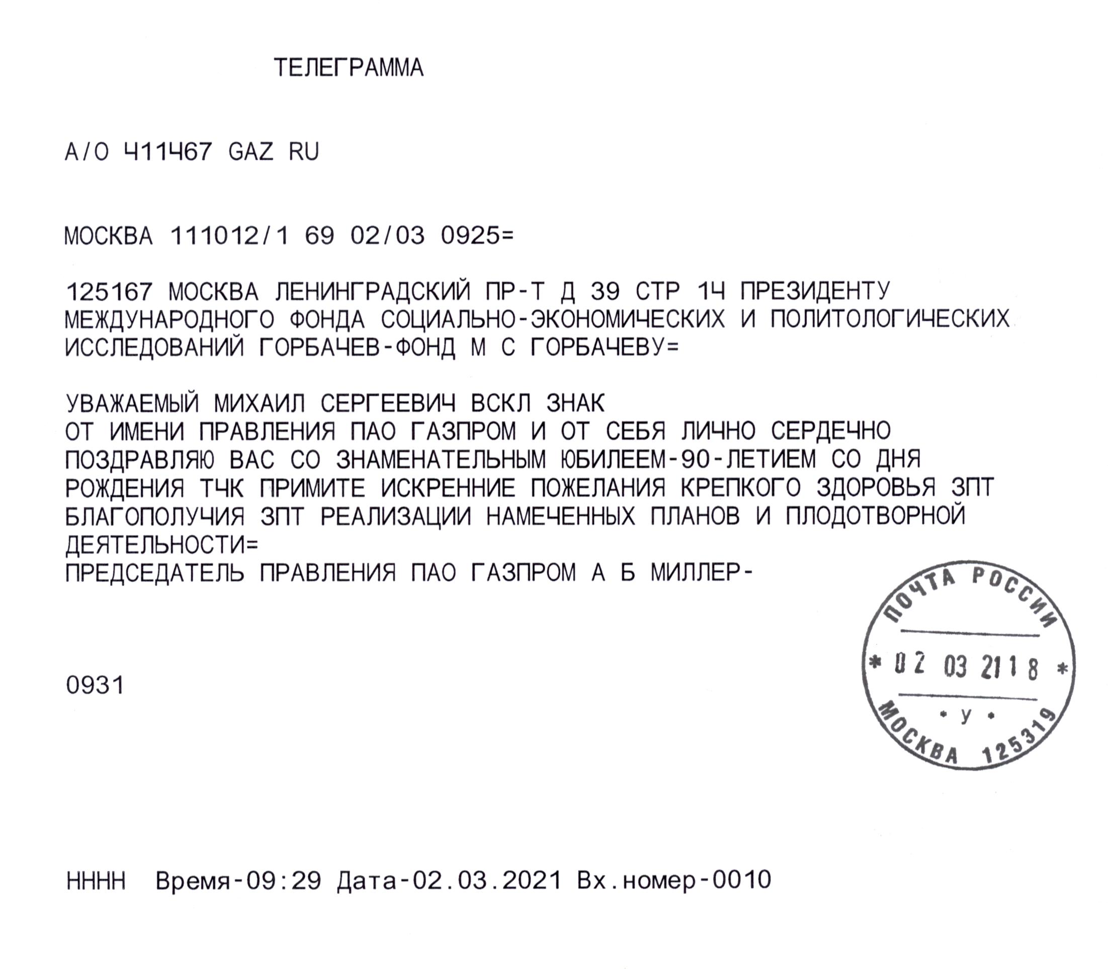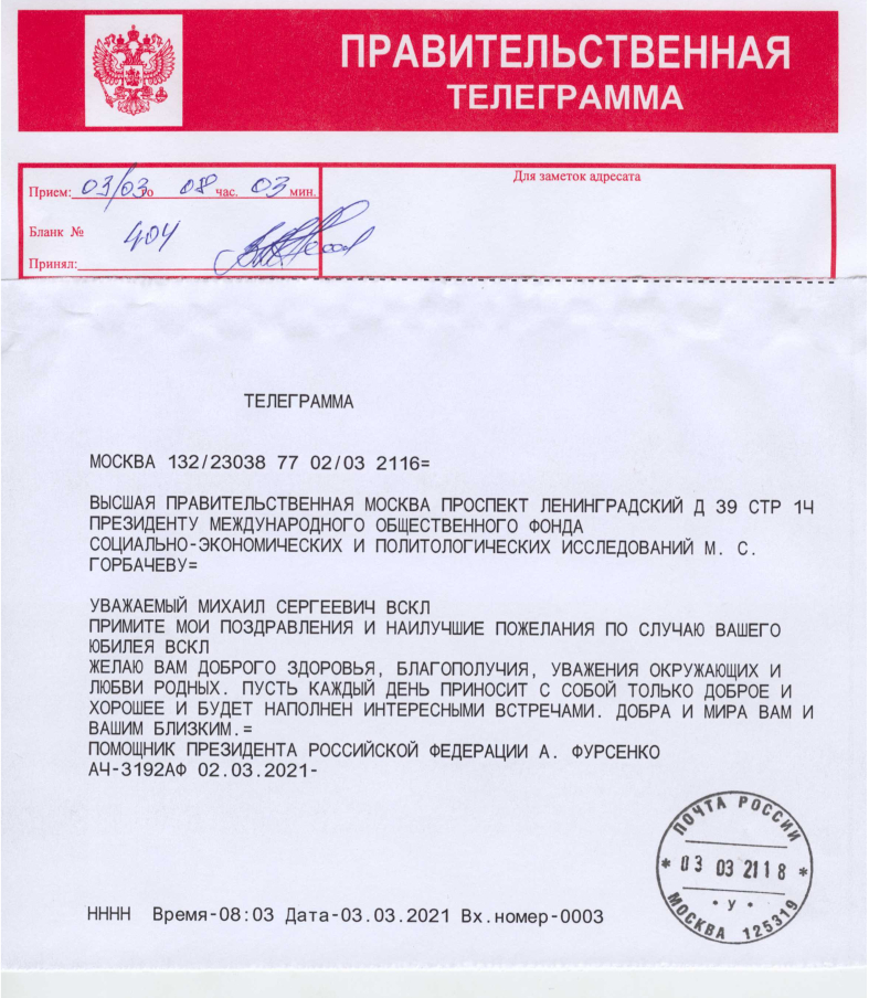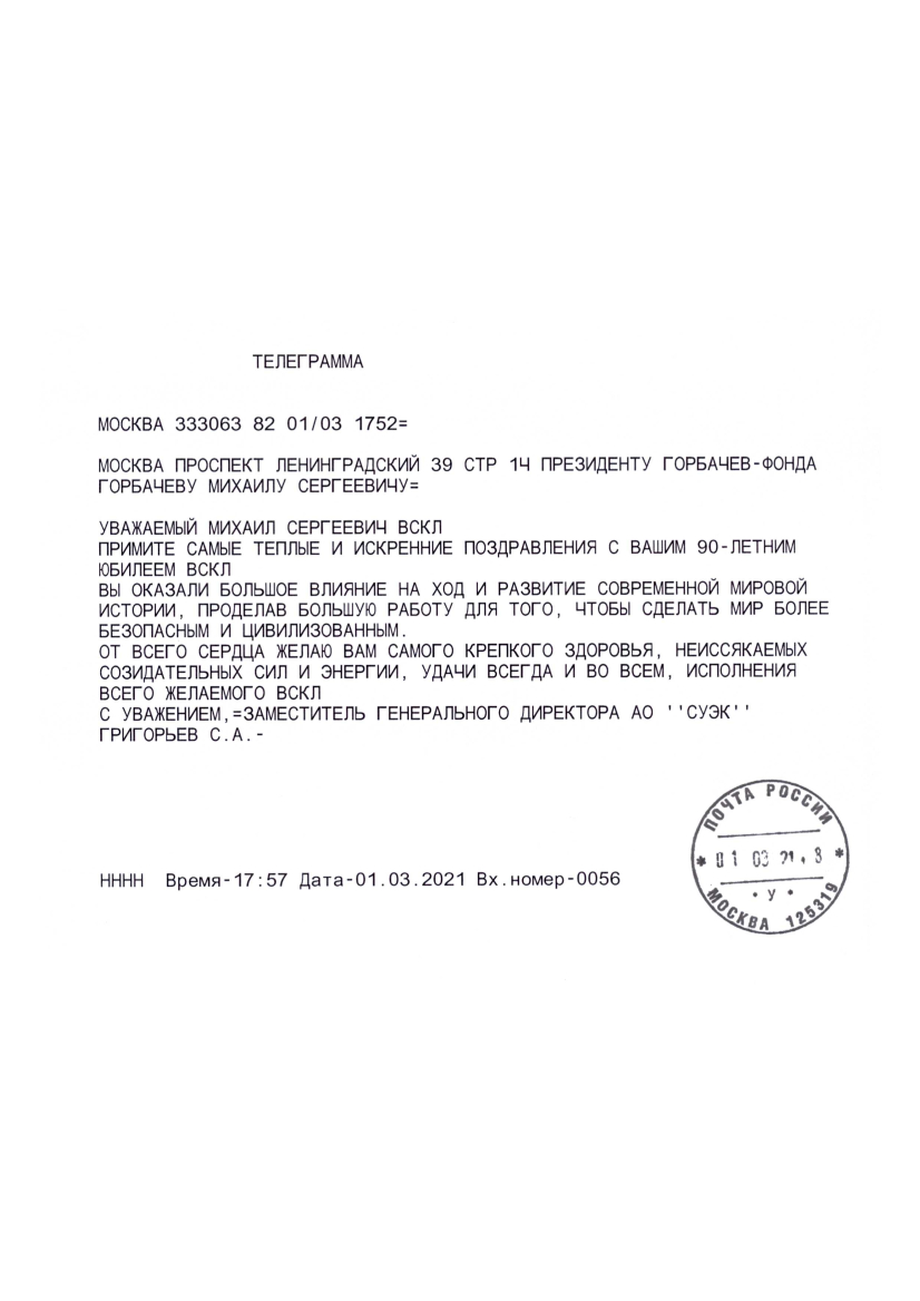 Поздравления М.С. Горабчеву с 90-летиемВ последние дни в Фонд поступает большое количество поздравлений М.С.Горбачеву с 90-летием, а также публикаций в СМИ в связи с этой юбилейной датой. Мы будем постепенно знакомить вас с наиболее интересными телеграммами, письмами и статьями. Пресс-служба 4 марта 2021 года