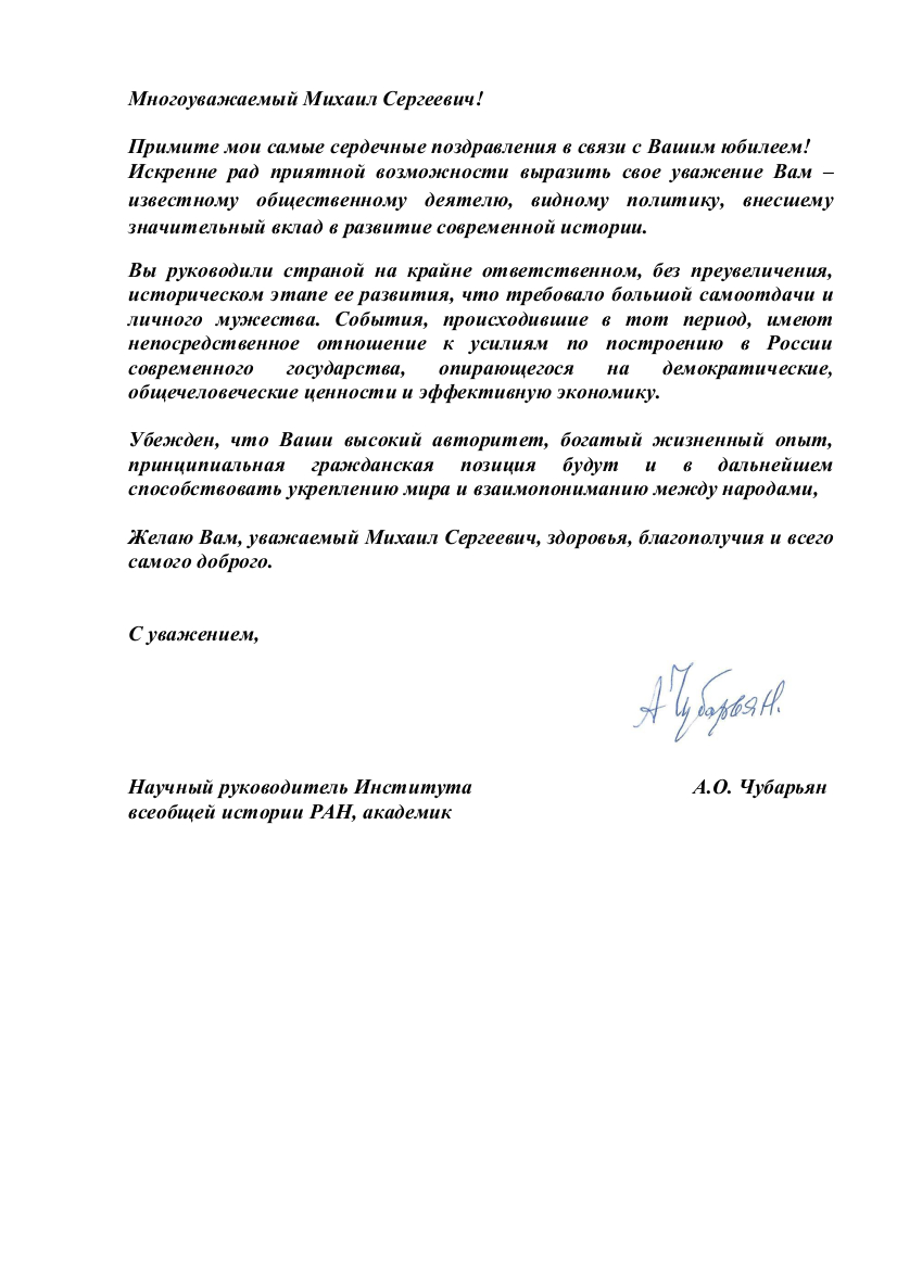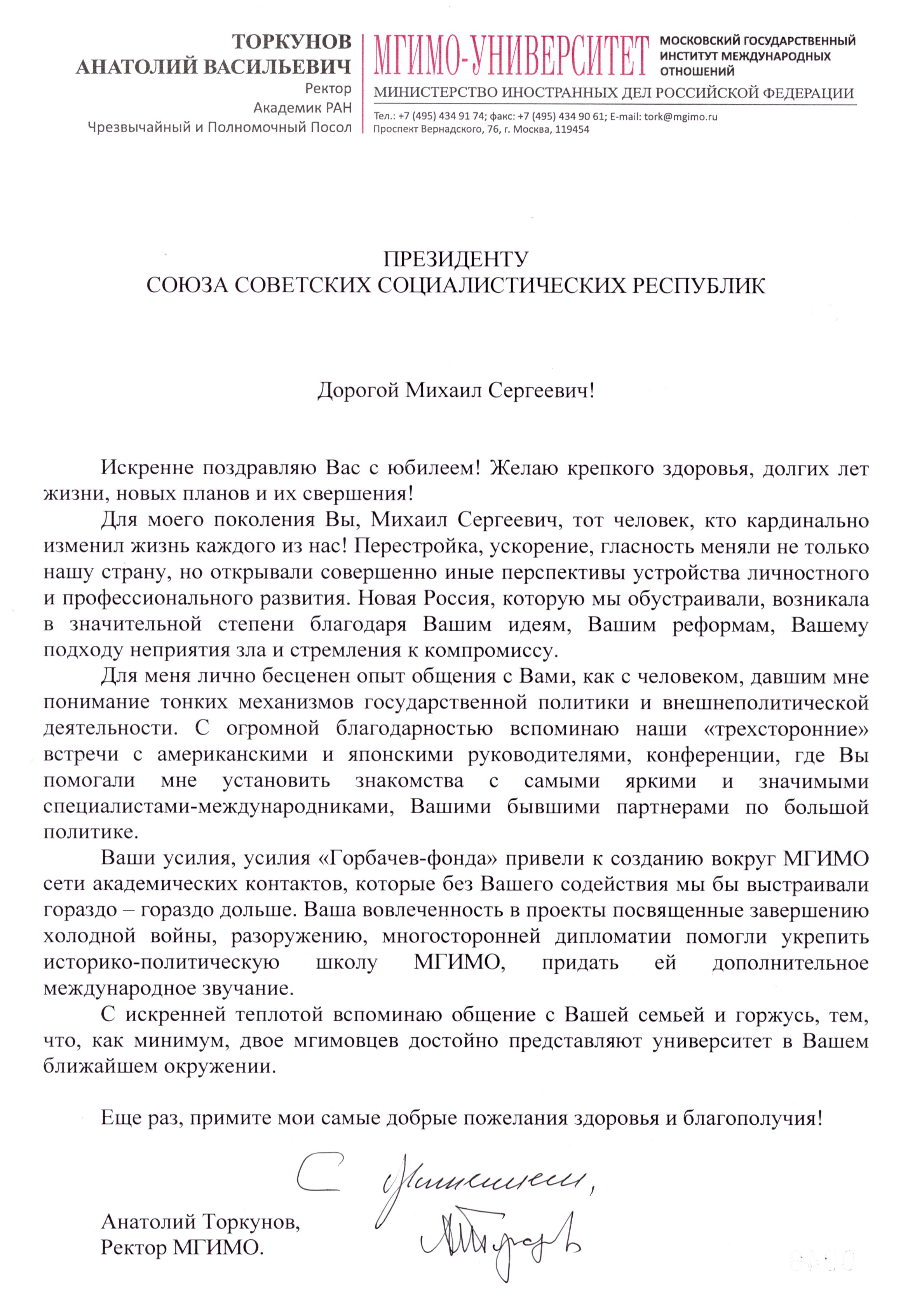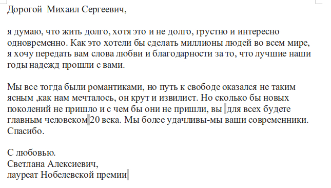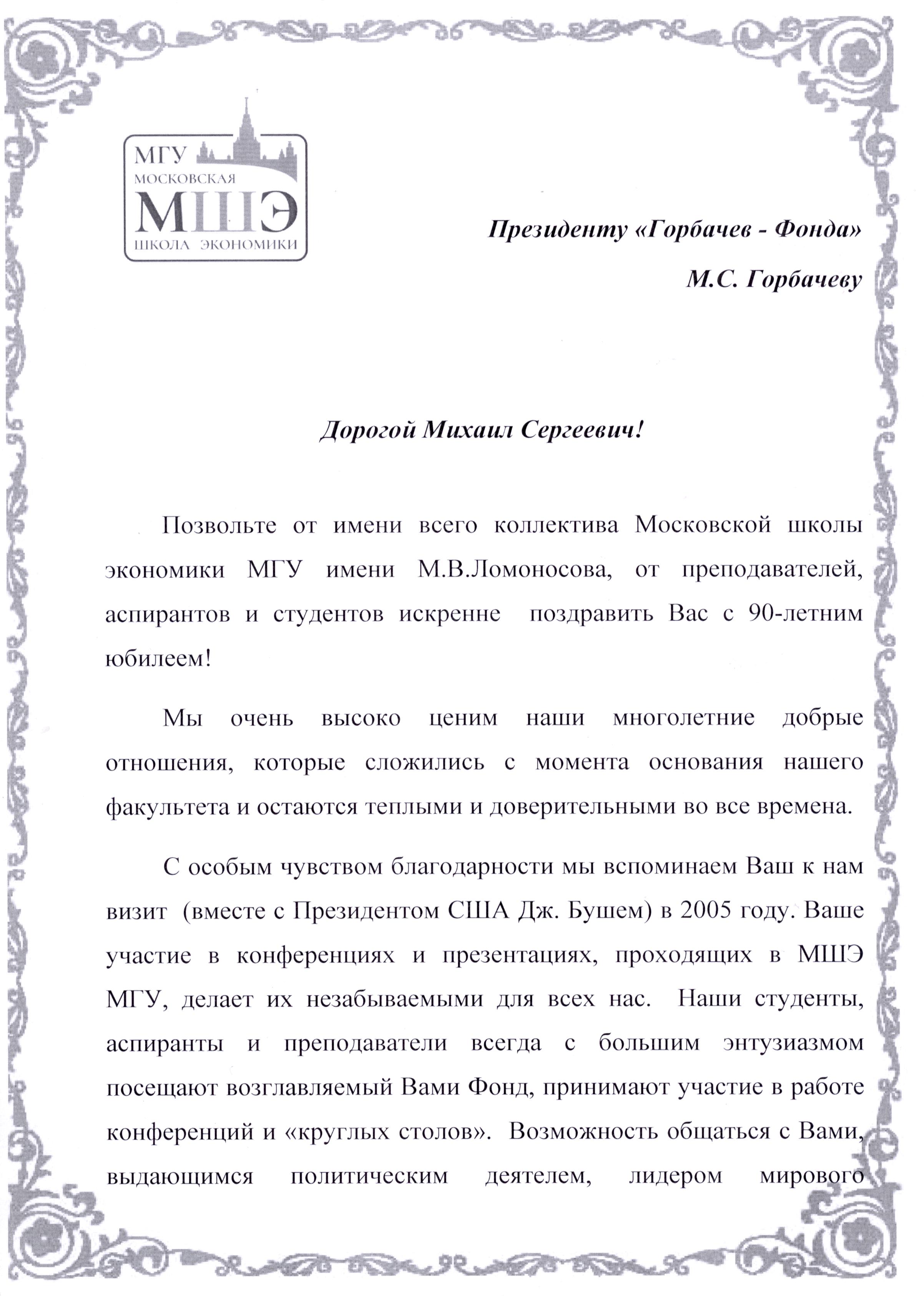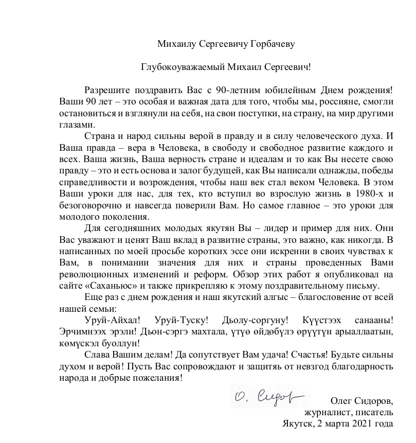 Глубокоуважаемый господин Президент, дорогой Михаил Сергеевич!