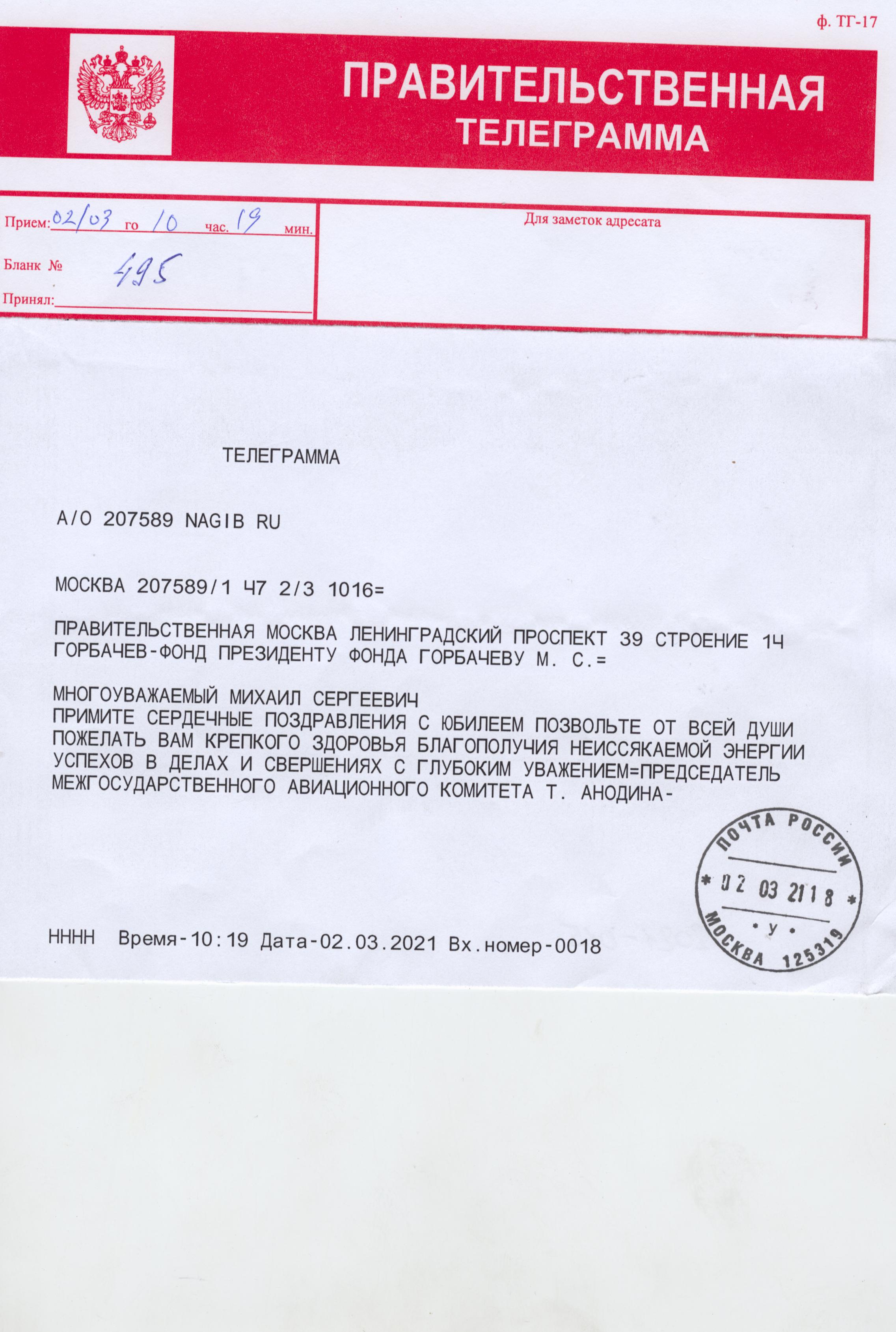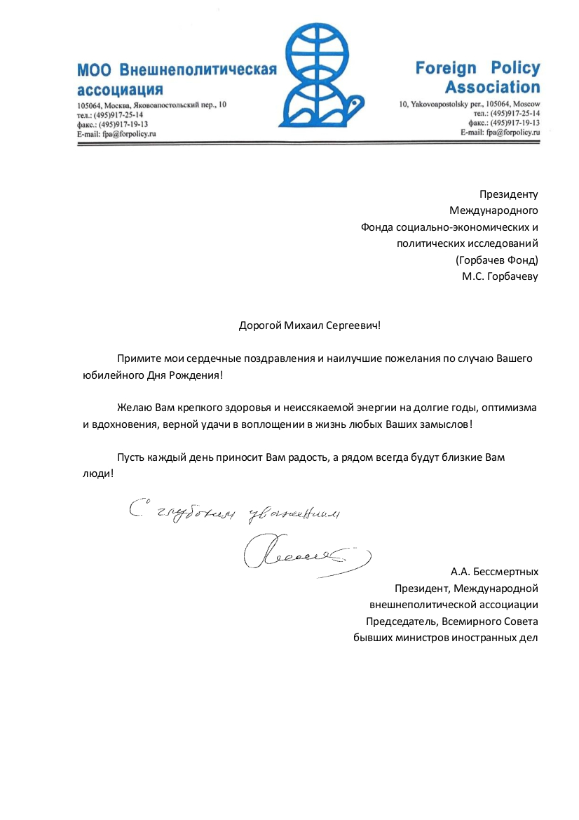 ![]() Поздравление бывшего министра иностранных дел СССР Бессмертных А.А.
