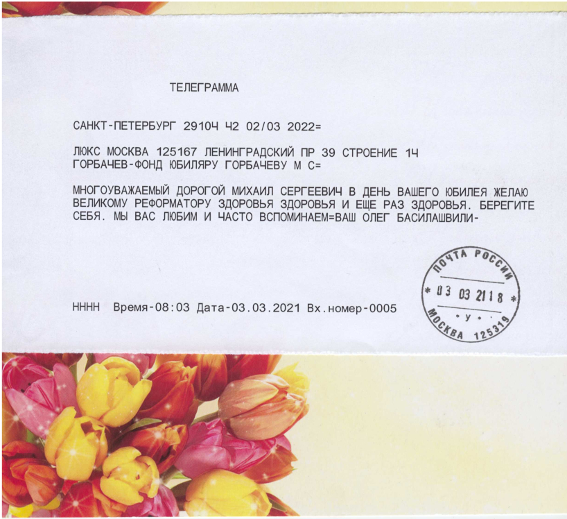 С Днём рождения! Более 30 лет вместе с Раисой Максимовной и Вами мы начали борьбу с детским раком. Мы открыли первый международный благотворительный фонд «Гематологи мира -детям и с его помощью организовали беспрецедентную подготовку врачей и медицинских сестёр за рубежом технологиям лечения детей, больных онкологическими заболеваниями. Вы были моральной и материальной опорой организации первого публичного отделения трансплантации костного мозга и банка крови в Российской детской клинической больницы в Москве и Института детской гематологии, онкологии и трансфузиология в Санкт-Петербурге, носящий имя Раисы Максимовны Горбачевой. Я был счастлив работать с Вами , видеть Вас в роли творца, идеолога перестройки, глубинного демократа, трибуна, руководителя Фонда , семьянина- мужа отца и деда. Ваш гуманистический вклад в борьбу с детским раком в нашей стране неоценим. В 1990 году выживаемость детей с онкологическими заболеваниями составляла 7% а 2000 она уже была равна 70%, а сейчас она превышает 82%! Ваша удивительная скромность никогда не давала повода использовать эту информацию публично. Но это истинная правда и об этом знает наше врачебное сообщество и , главное благодарные взрослые , излеченные от рака, живущие полноценной жизнью и воспитывающие своих детей, Спасибо Вам за эпоху Горбачева, за распахнутую дверь в удивительный мир, за возможность воплотить свою мечту в Жизнь! Здоровья и благополучия Вам и Вашей семье, Ирине, внучкам и правнукам!