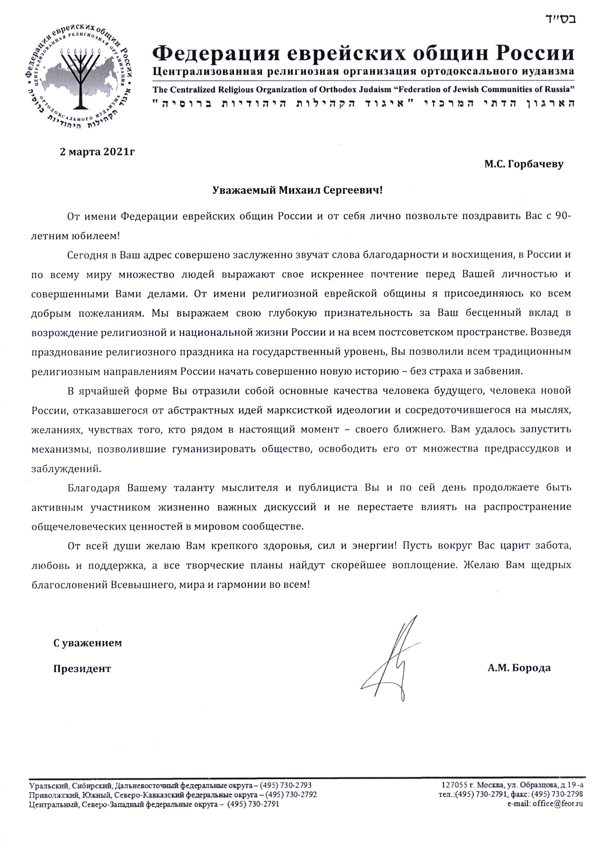 ![]() Поздравление президента Федерации еврейских общин России Бороды А.М.