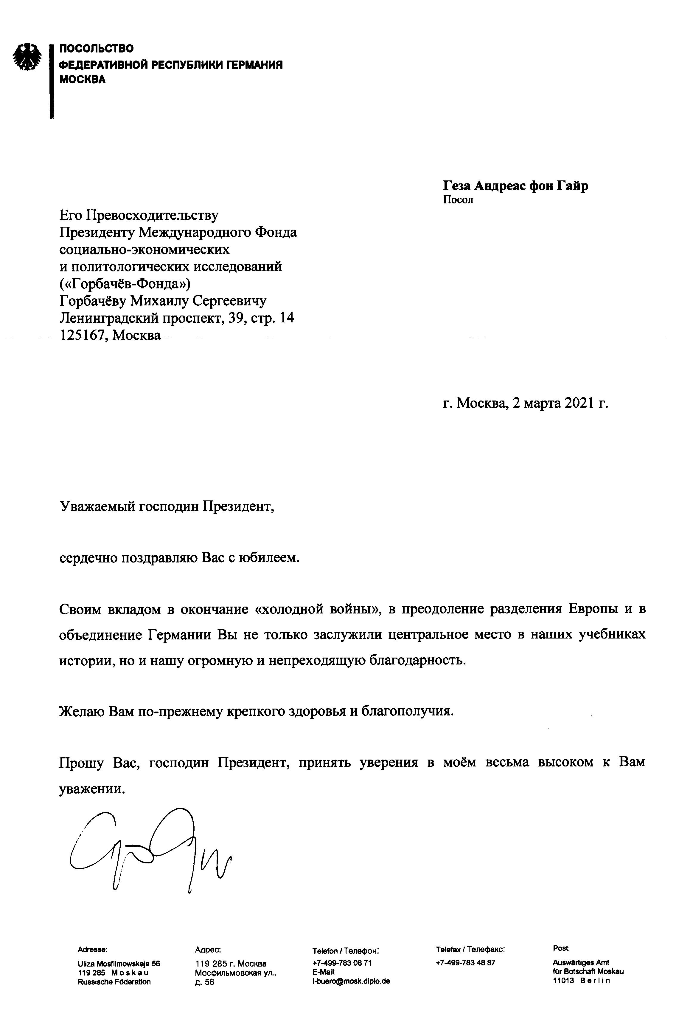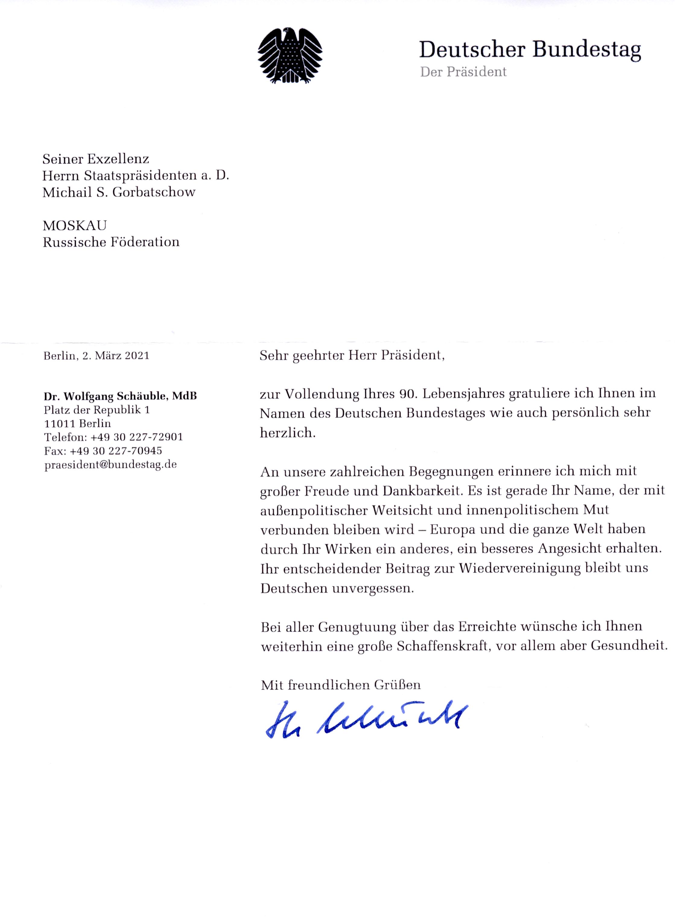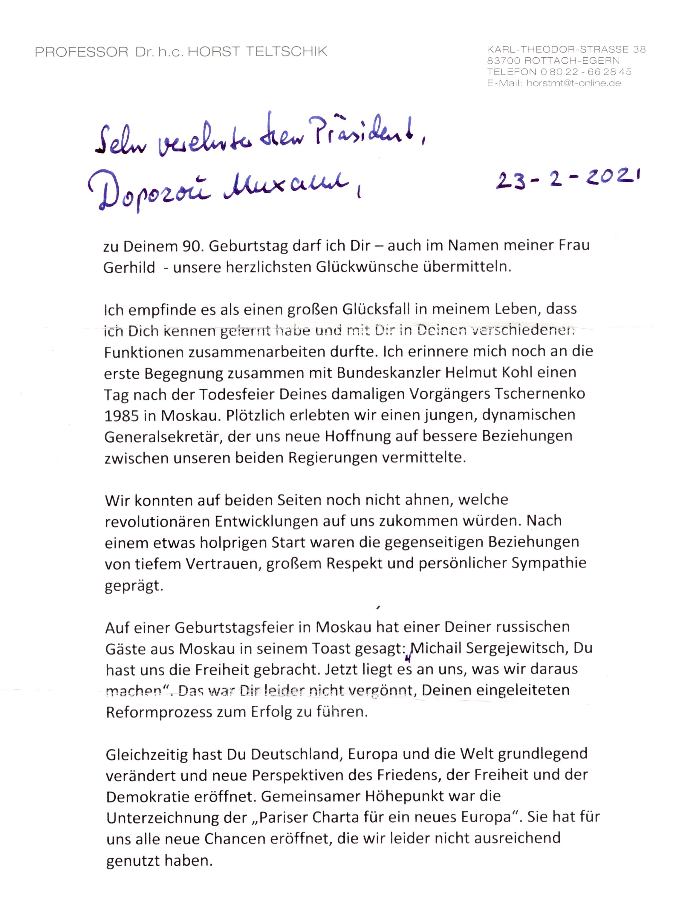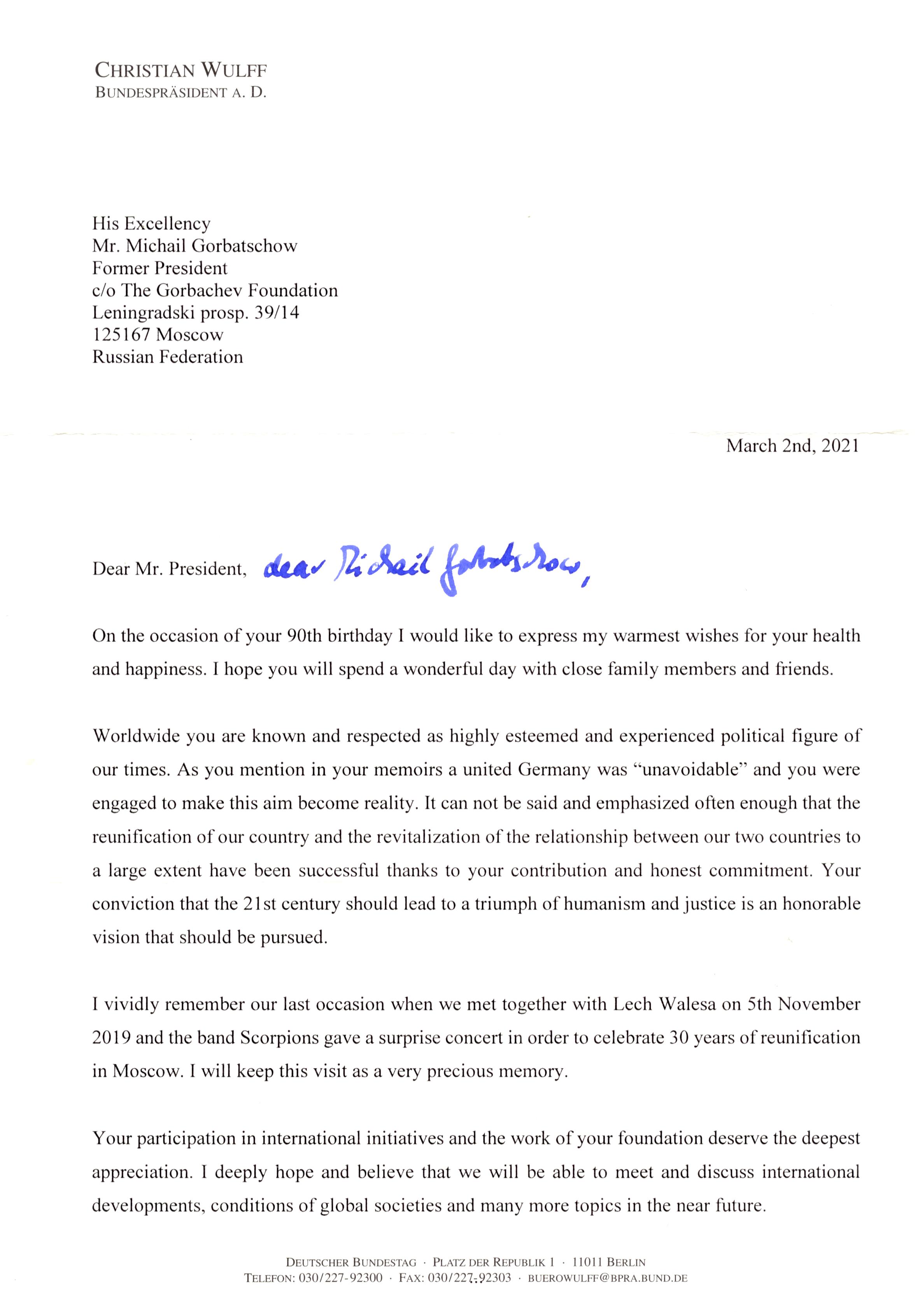 По случаю Вашего 90-летия я хотел бы от всего сердца пожелать Вам крепкого здоровья и счастья. Я надеюсь, что свой день рождения Вы чудесно проведете в кругу своих близких и друзей. Вас знают и уважают во всем мире как высоко почитаемого и очень опытного политика наших времен. Как вы отметили в своих мемуарах, объединенная Германия была «неизбежна», и благодаря Вашему участию эта цель стала реальностью. Успех в деле воссоединения нашей страны и обновления отношений между двумя нашими государствами был во многом предопределен Вашим вкладом и Вашим искренней твердой позицией — об этом следует помнить и говорить всегда. Ваша убежденность в том, что XXI век должен привести к победе человечности и справедливости, — благородное видение, к реализации которого нужно стремиться. Я хорошо помню нашу последнюю встречу, когда мы собрались с Лехом Валенсой 5 ноября 2019 г., и концерт группы «Скорпионз» стал сюрпризом в программе празднования 30-летия воссоединения Германии в Москве. Этот визит я храню в памяти как очень ценное воспоминание. Ваше участие в международных инициативах и работа Вашего фонда заслуживают высочайшей похвалы. Я очень надеюсь и верю, что мы в ближайшем будущем мы сможем встретиться и обсудить международные события, состояние общества в мире и многие другие темы. Я желаю Вам и Вашей семье душевного равновесия и благоденствия — особенно в этот тяжелый период испытаний. Искренне Ваш, (ПОДПИСЬ) Кристиан Вульф, Бывший Президент Германии 2 марта 20201
