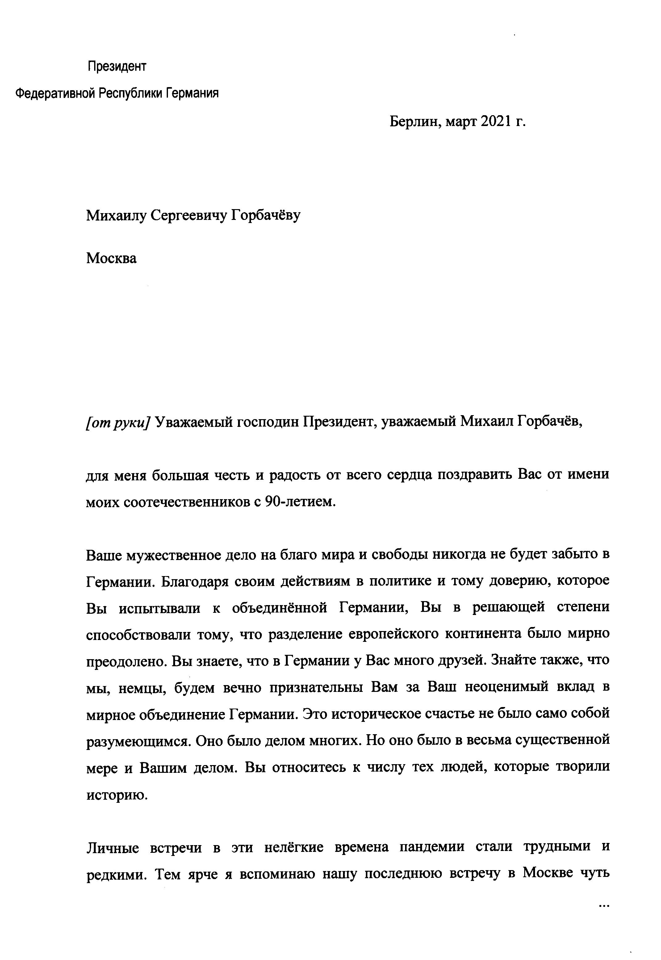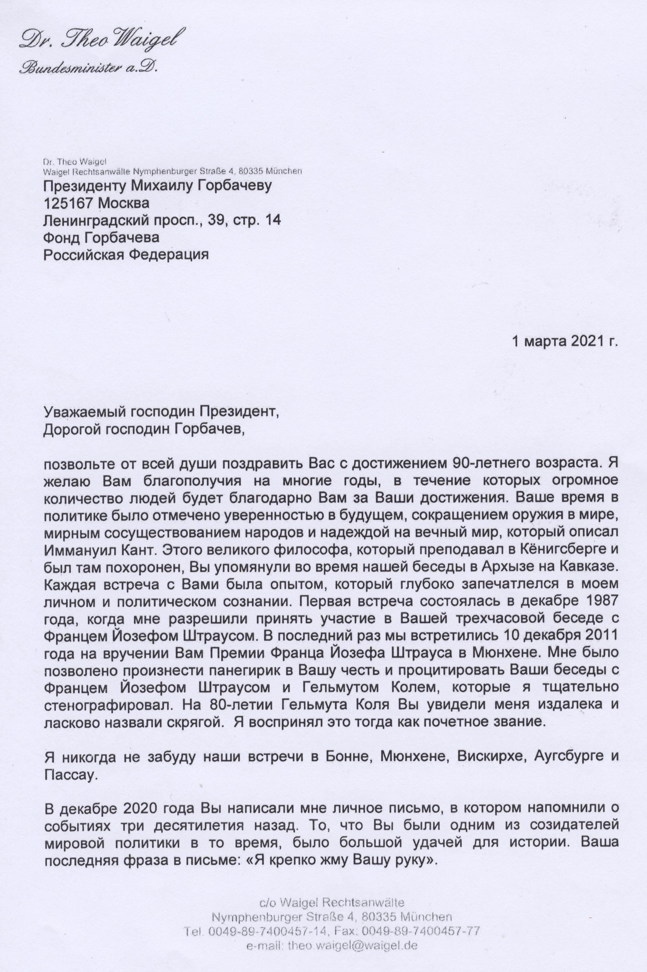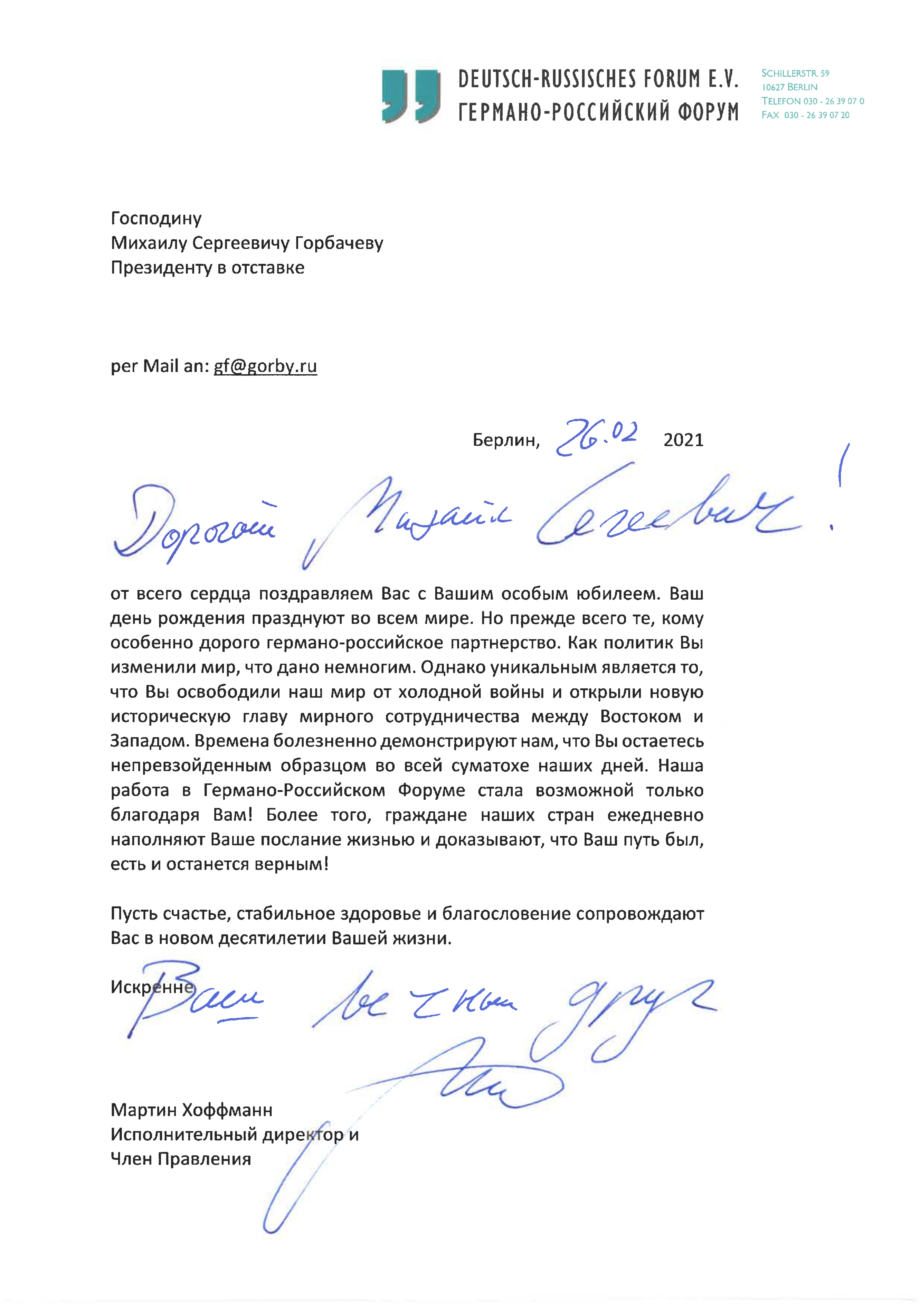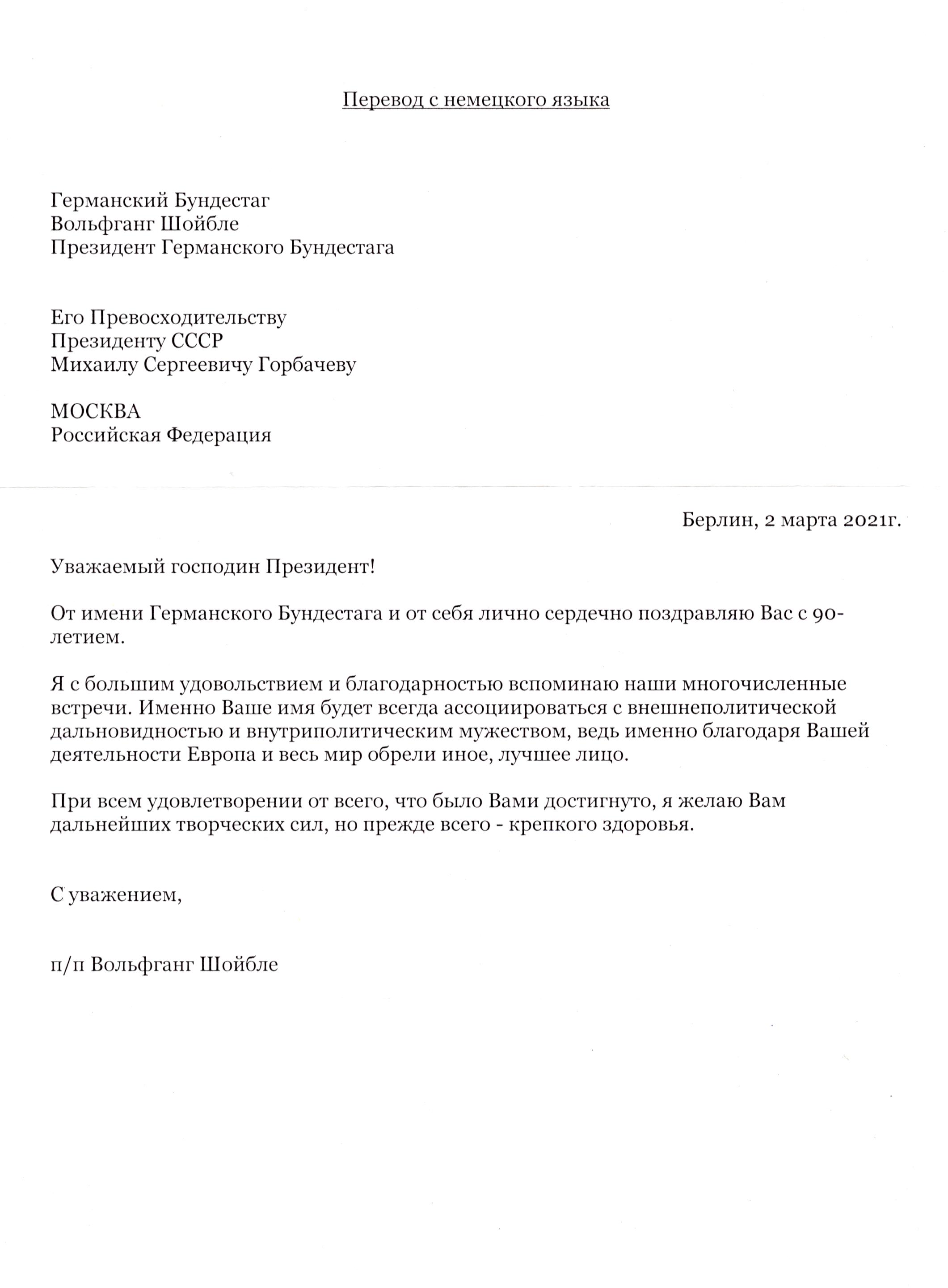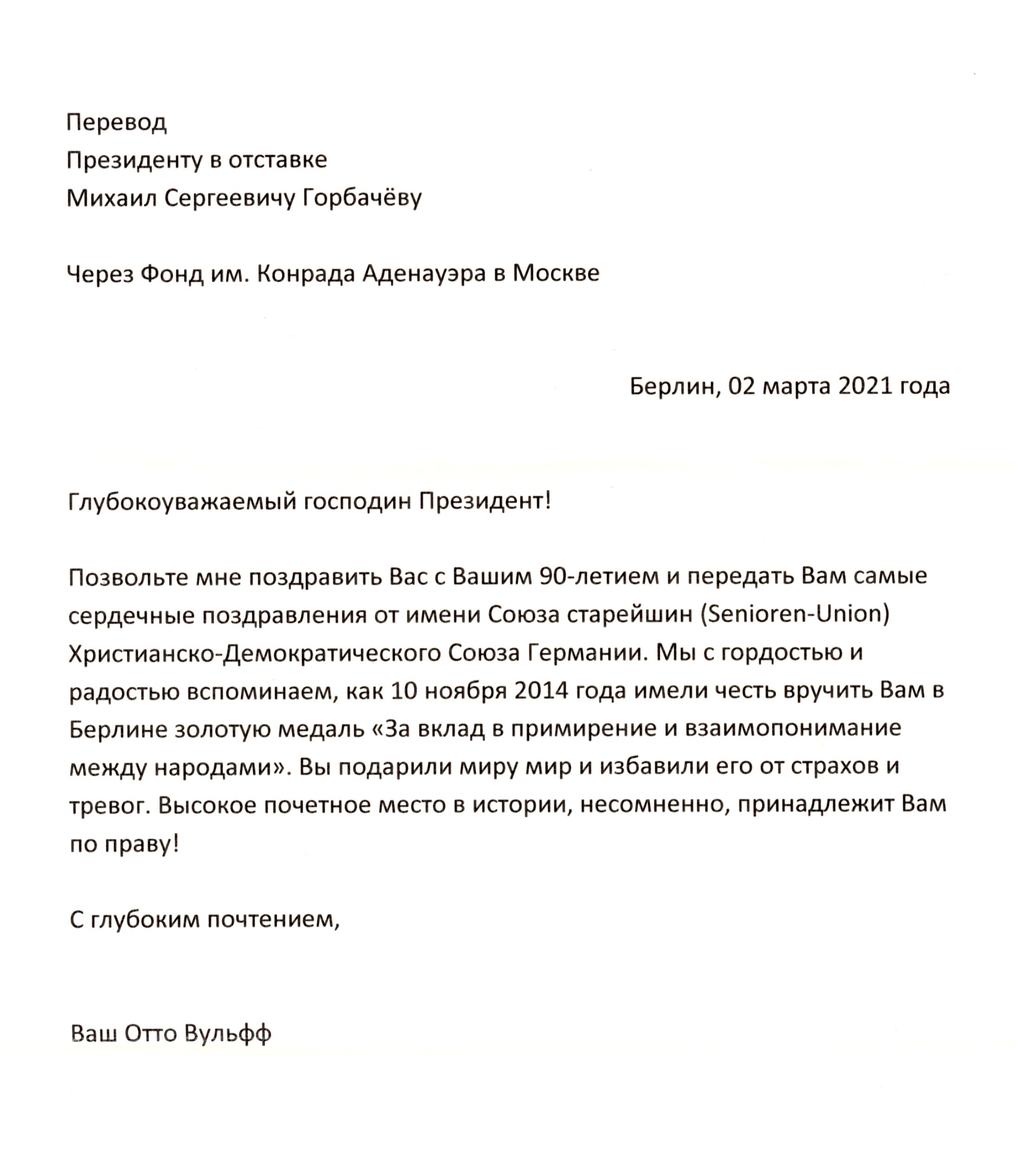 По случаю Вашего 90-летия я хотел бы от всего сердца пожелать Вам крепкого здоровья и счастья. Я надеюсь, что свой день рождения Вы чудесно проведете в кругу своих близких и друзей. Вас знают и уважают во всем мире как высоко почитаемого и очень опытного политика наших времен. Как вы отметили в своих мемуарах, объединенная Германия была «неизбежна», и благодаря Вашему участию эта цель стала реальностью. Успех в деле воссоединения нашей страны и обновления отношений между двумя нашими государствами был во многом предопределен Вашим вкладом и Вашим искренней твердой позицией — об этом следует помнить и говорить всегда. Ваша убежденность в том, что XXI век должен привести к победе человечности и справедливости, — благородное видение, к реализации которого нужно стремиться. Я хорошо помню нашу последнюю встречу, когда мы собрались с Лехом Валенсой 5 ноября 2019 г., и концерт группы «Скорпионз» стал сюрпризом в программе празднования 30-летия воссоединения Германии в Москве. Этот визит я храню в памяти как очень ценное воспоминание. Ваше участие в международных инициативах и работа Вашего фонда заслуживают высочайшей похвалы. Я очень надеюсь и верю, что мы в ближайшем будущем мы сможем встретиться и обсудить международные события, состояние общества в мире и многие другие темы. Я желаю Вам и Вашей семье душевного равновесия и благоденствия — особенно в этот тяжелый период испытаний. Искренне Ваш, (ПОДПИСЬ) Кристиан Вульф, Бывший Президент Германии 2 марта 20201