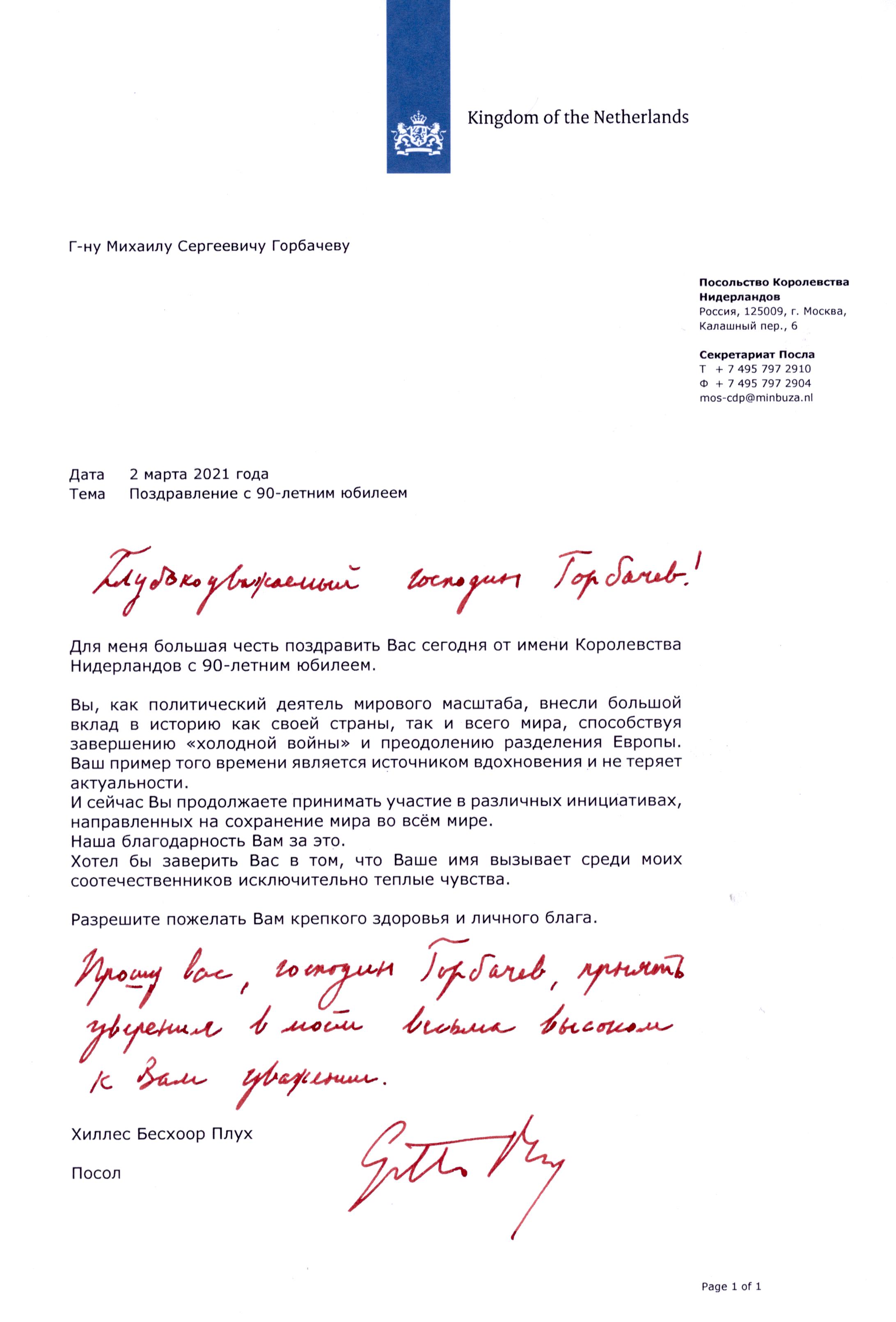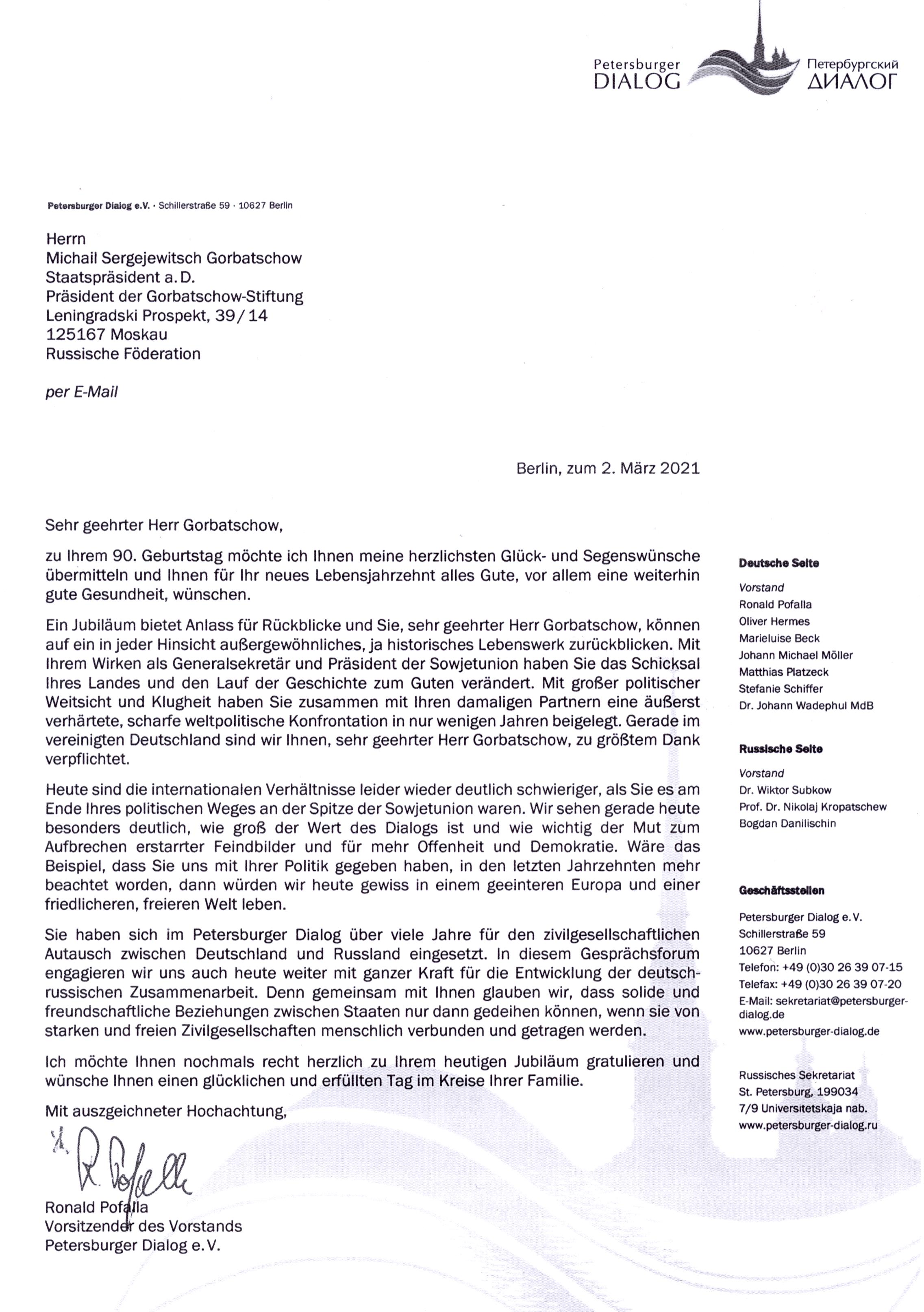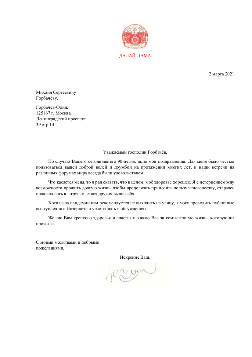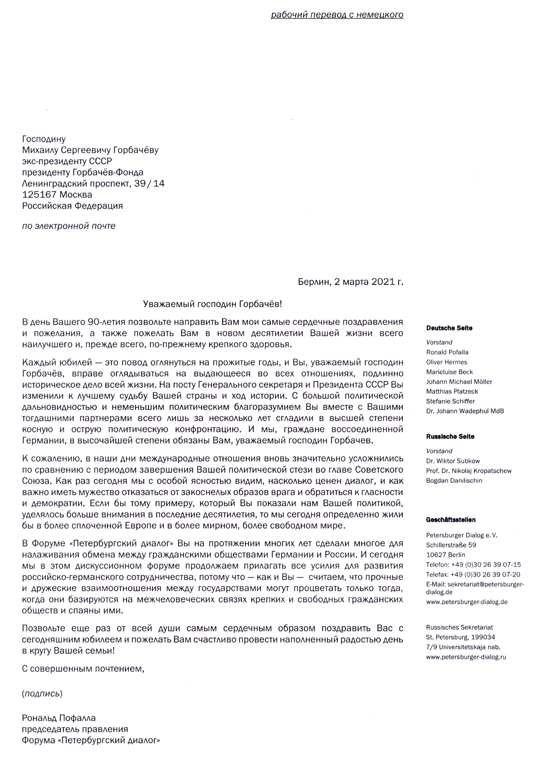 По случаю Вашего 90-летия я хотел бы от всего сердца пожелать Вам крепкого здоровья и счастья. Я надеюсь, что свой день рождения Вы чудесно проведете в кругу своих близких и друзей. Вас знают и уважают во всем мире как высоко почитаемого и очень опытного политика наших времен. Как вы отметили в своих мемуарах, объединенная Германия была «неизбежна», и благодаря Вашему участию эта цель стала реальностью. Успех в деле воссоединения нашей страны и обновления отношений между двумя нашими государствами был во многом предопределен Вашим вкладом и Вашим искренней твердой позицией — об этом следует помнить и говорить всегда. Ваша убежденность в том, что XXI век должен привести к победе человечности и справедливости, — благородное видение, к реализации которого нужно стремиться. Я хорошо помню нашу последнюю встречу, когда мы собрались с Лехом Валенсой 5 ноября 2019 г., и концерт группы «Скорпионз» стал сюрпризом в программе празднования 30-летия воссоединения Германии в Москве. Этот визит я храню в памяти как очень ценное воспоминание. Ваше участие в международных инициативах и работа Вашего фонда заслуживают высочайшей похвалы. Я очень надеюсь и верю, что мы в ближайшем будущем мы сможем встретиться и обсудить международные события, состояние общества в мире и многие другие темы. Я желаю Вам и Вашей семье душевного равновесия и благоденствия — особенно в этот тяжелый период испытаний. Искренне Ваш, (ПОДПИСЬ) Кристиан Вульф, Бывший Президент Германии 2 марта 20201