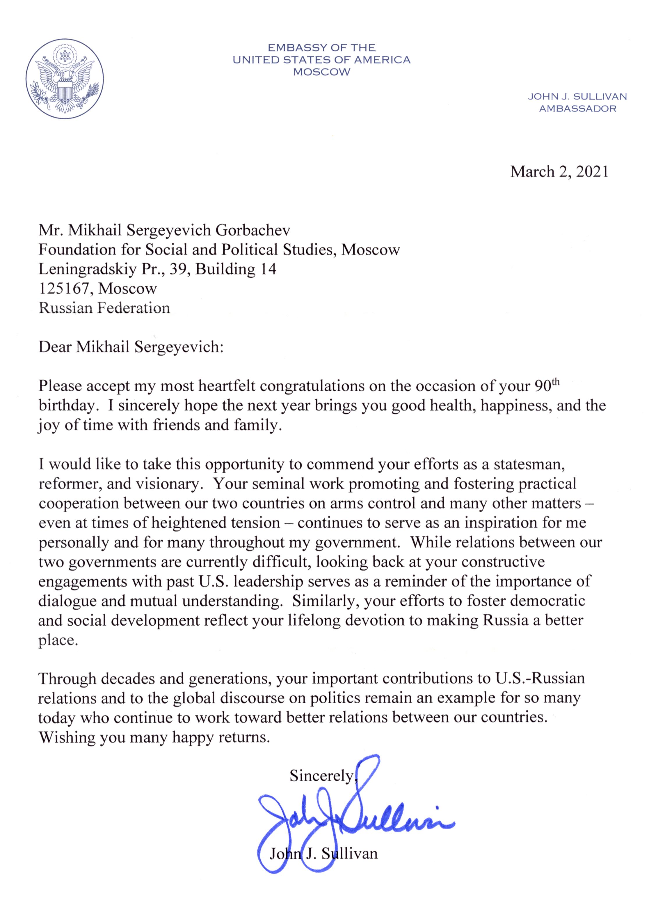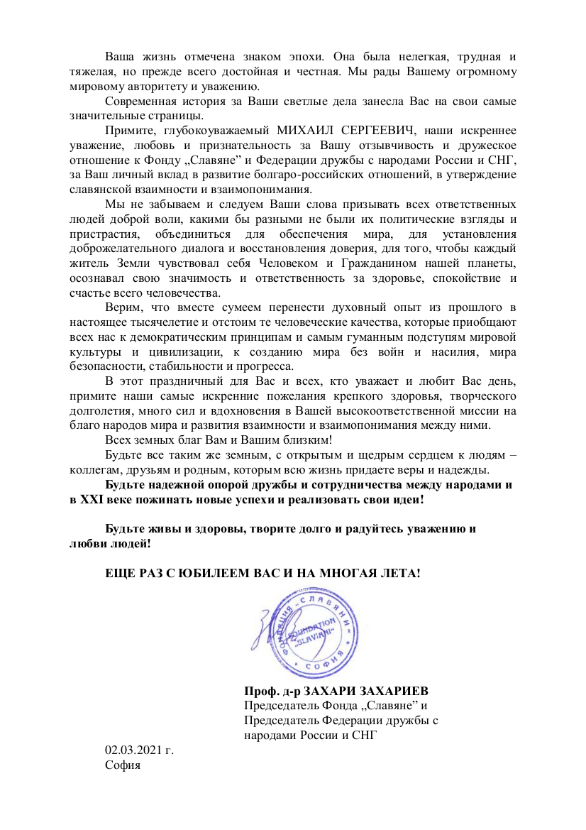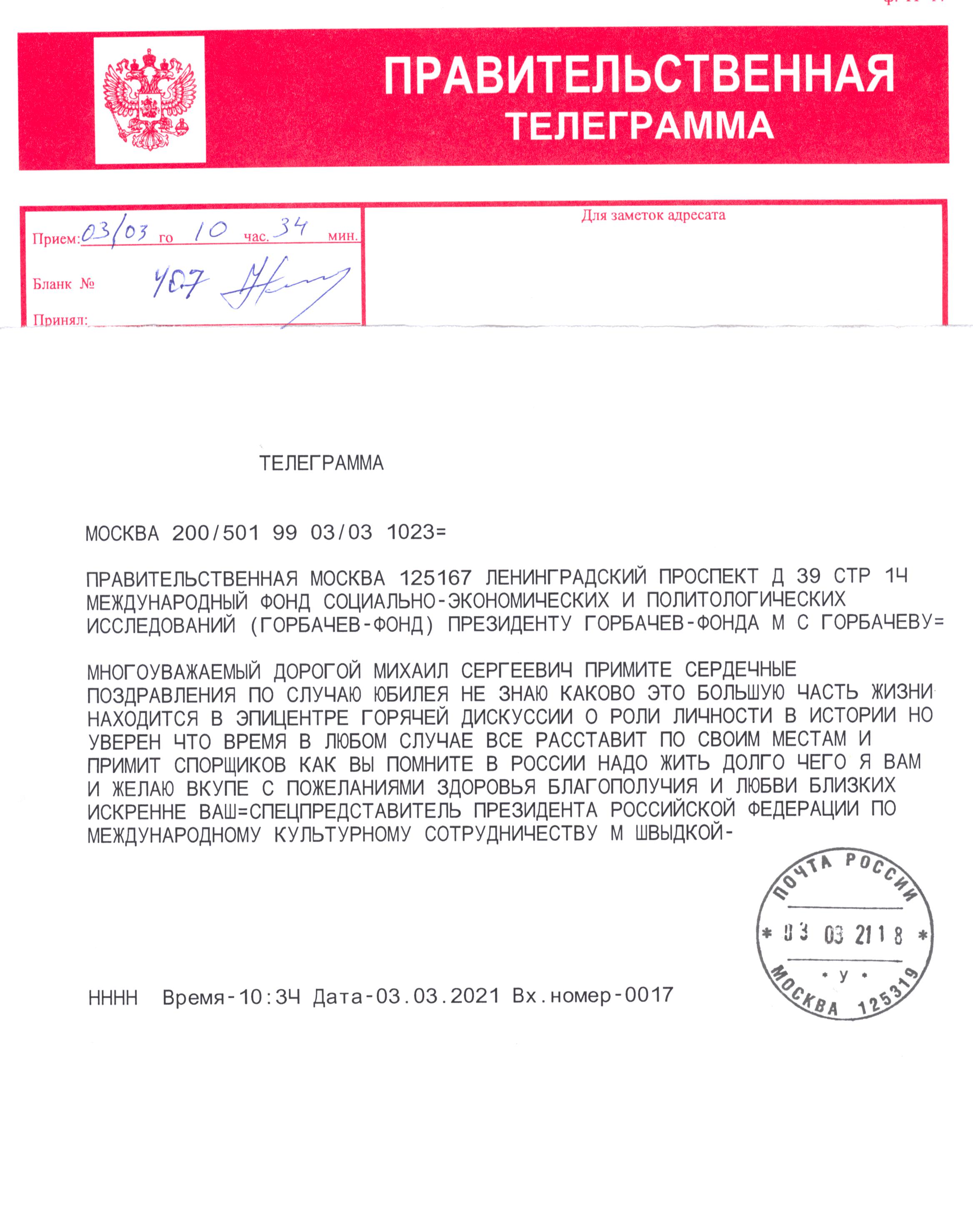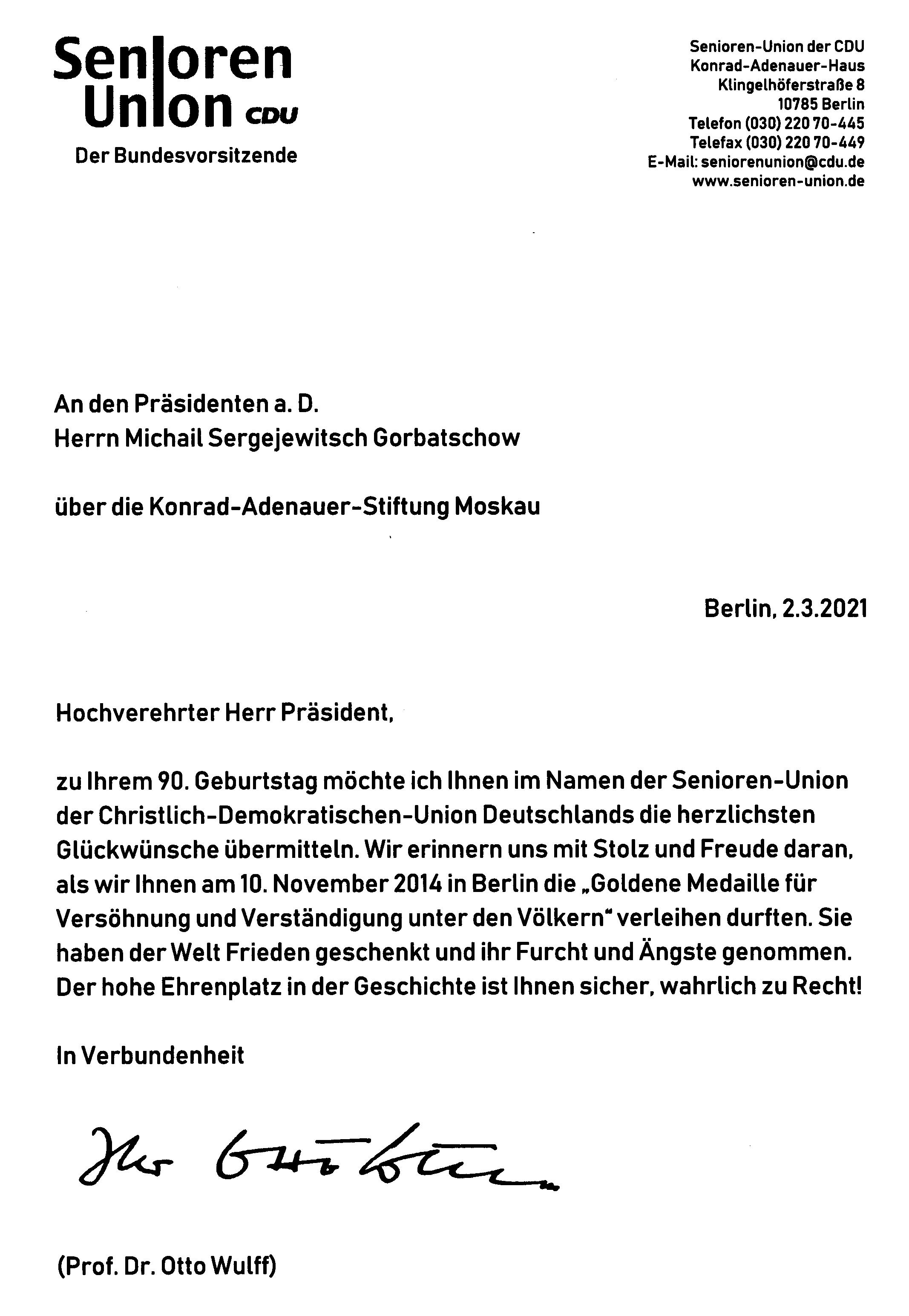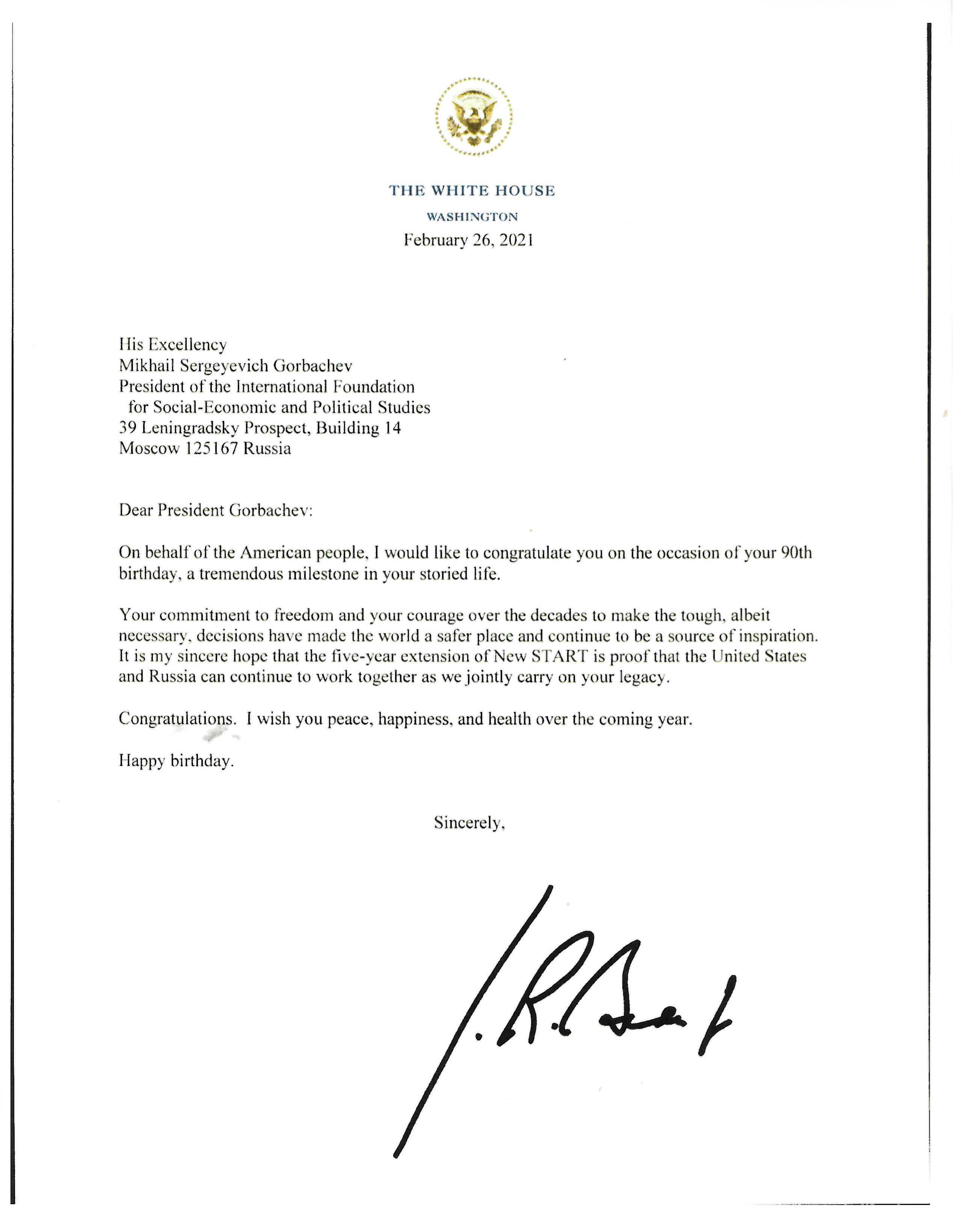 По случаю Вашего 90-летия я хотел бы от всего сердца пожелать Вам крепкого здоровья и счастья. Я надеюсь, что свой день рождения Вы чудесно проведете в кругу своих близких и друзей. Вас знают и уважают во всем мире как высоко почитаемого и очень опытного политика наших времен. Как вы отметили в своих мемуарах, объединенная Германия была «неизбежна», и благодаря Вашему участию эта цель стала реальностью. Успех в деле воссоединения нашей страны и обновления отношений между двумя нашими государствами был во многом предопределен Вашим вкладом и Вашим искренней твердой позицией — об этом следует помнить и говорить всегда. Ваша убежденность в том, что XXI век должен привести к победе человечности и справедливости, — благородное видение, к реализации которого нужно стремиться. Я хорошо помню нашу последнюю встречу, когда мы собрались с Лехом Валенсой 5 ноября 2019 г., и концерт группы «Скорпионз» стал сюрпризом в программе празднования 30-летия воссоединения Германии в Москве. Этот визит я храню в памяти как очень ценное воспоминание. Ваше участие в международных инициативах и работа Вашего фонда заслуживают высочайшей похвалы. Я очень надеюсь и верю, что мы в ближайшем будущем мы сможем встретиться и обсудить международные события, состояние общества в мире и многие другие темы. Я желаю Вам и Вашей семье душевного равновесия и благоденствия — особенно в этот тяжелый период испытаний. Искренне Ваш, (ПОДПИСЬ) Кристиан Вульф, Бывший Президент Германии 2 марта 20201