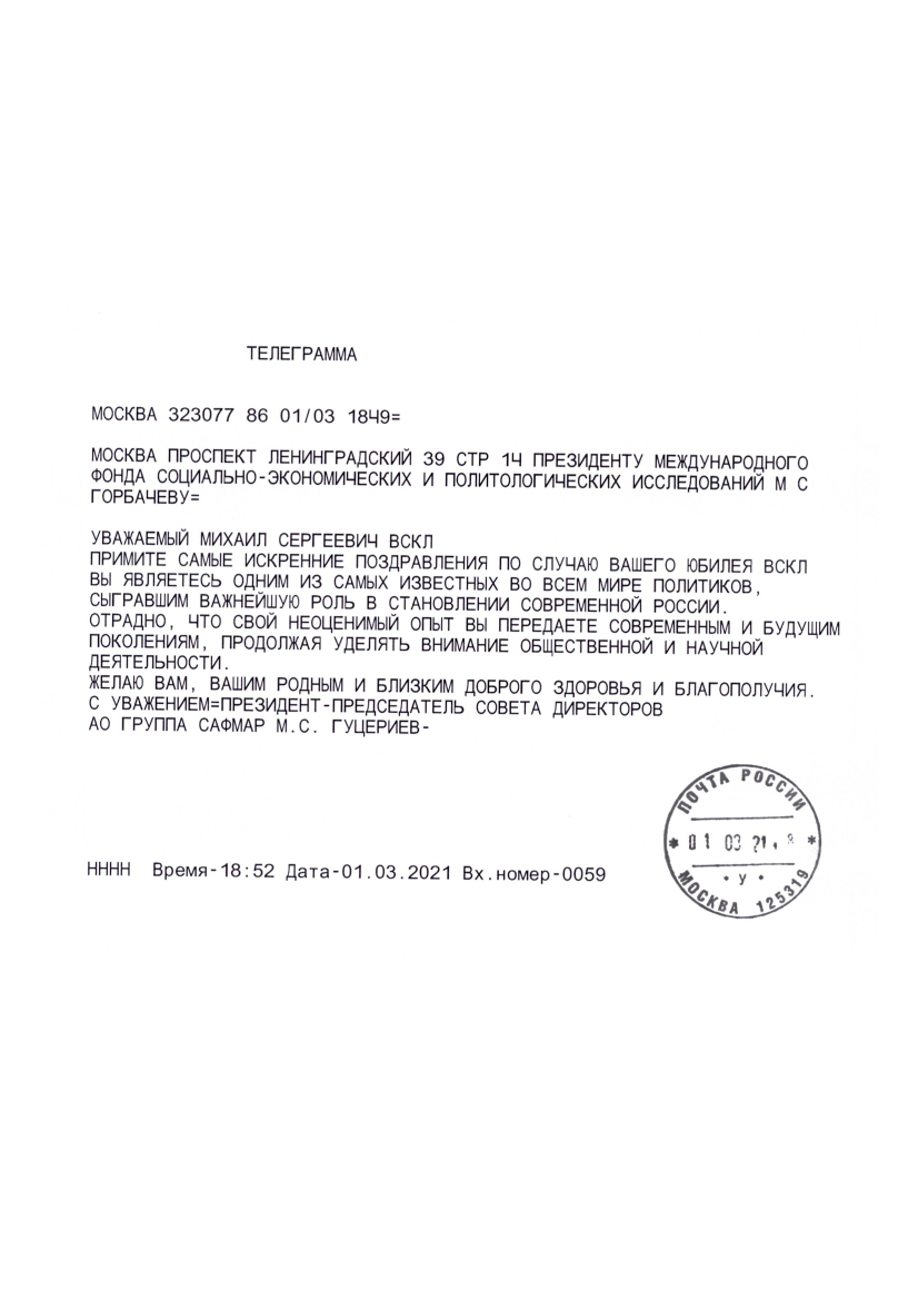 ![]() Поздравление председателя совета директоров промышленно-финансовой группы «Сафмар» Гуцериева М.С.