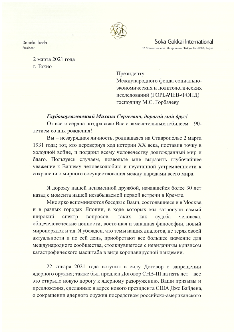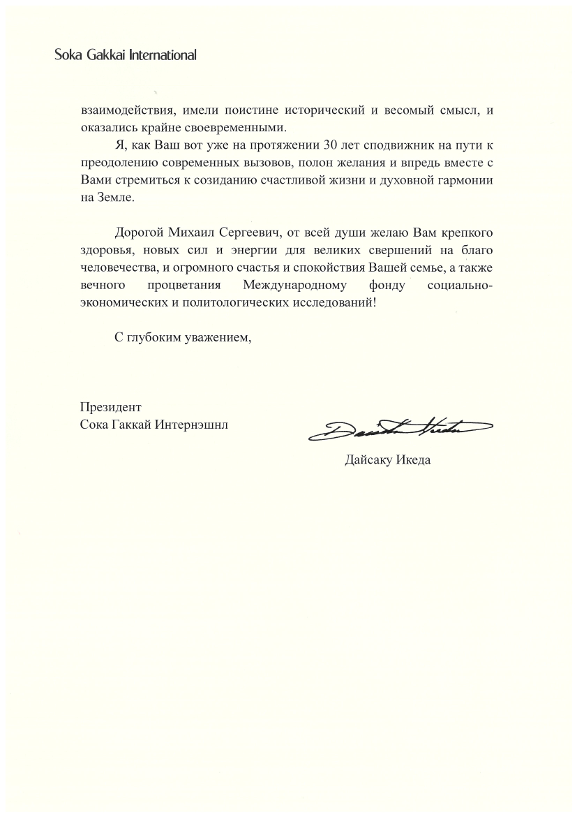 ![]() Поздравление президента Сока Гаккай Интернэшнл Дайсаку Икеды (Япония)