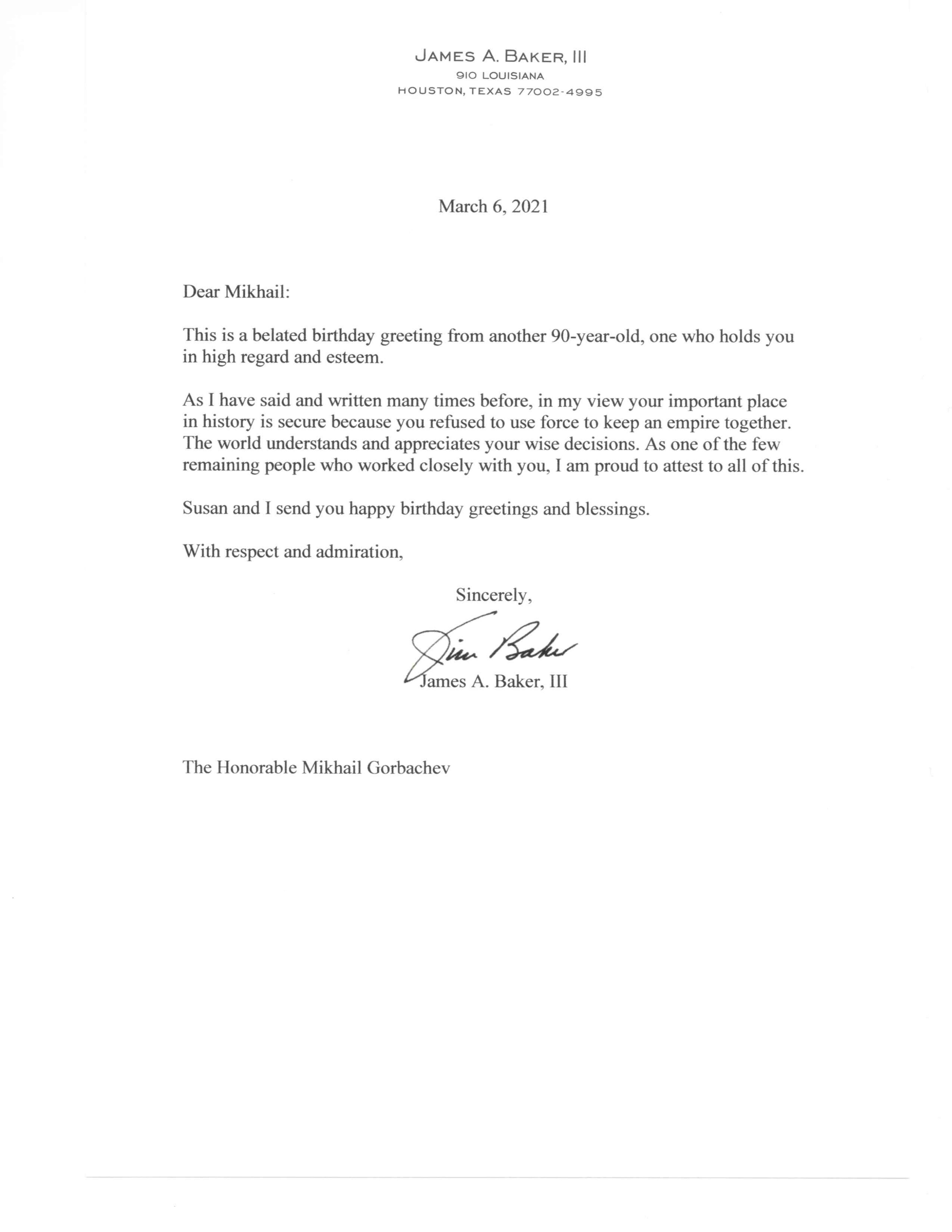 Поздравление бывшего госсекретаря США Джеймса Бейкера