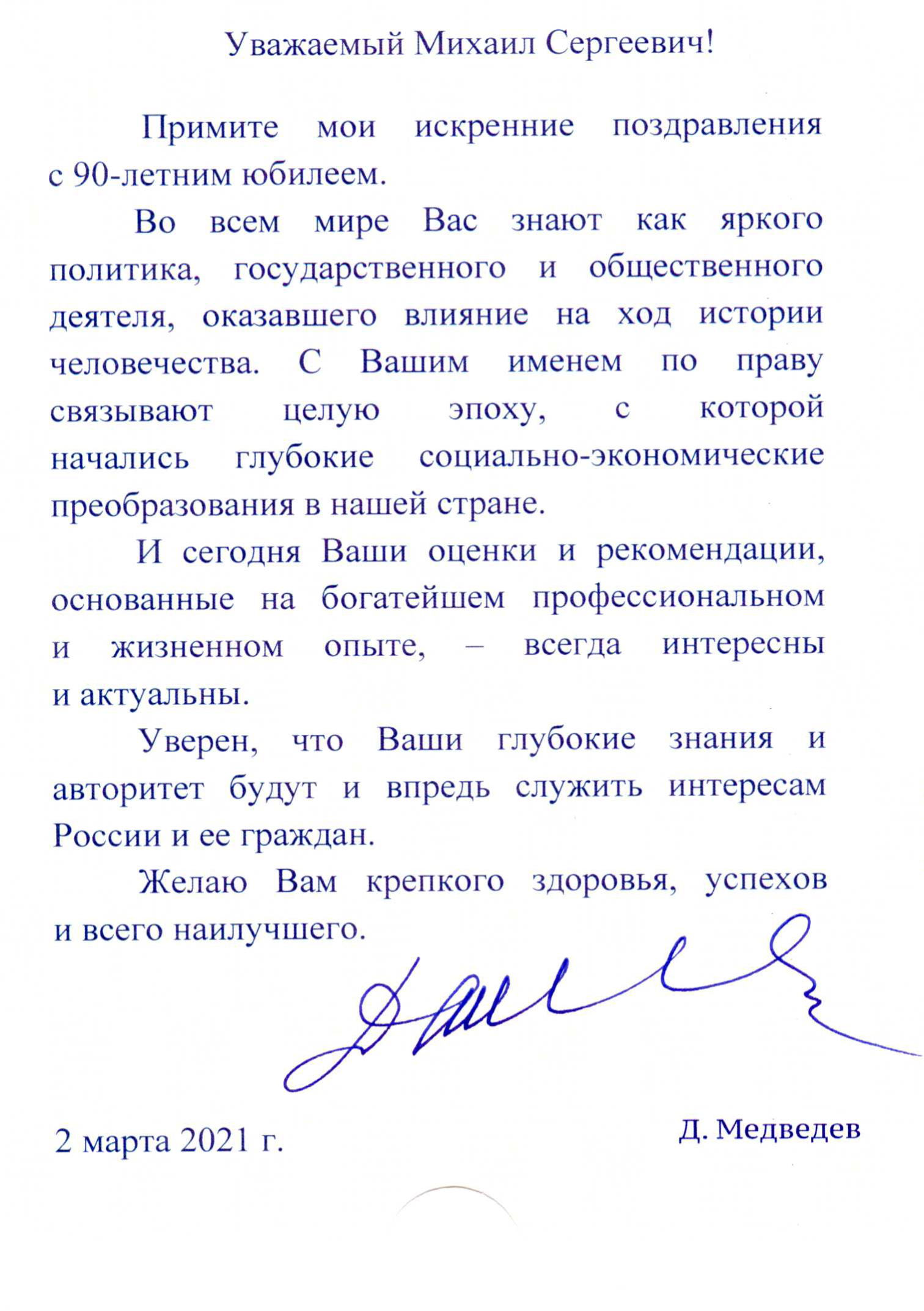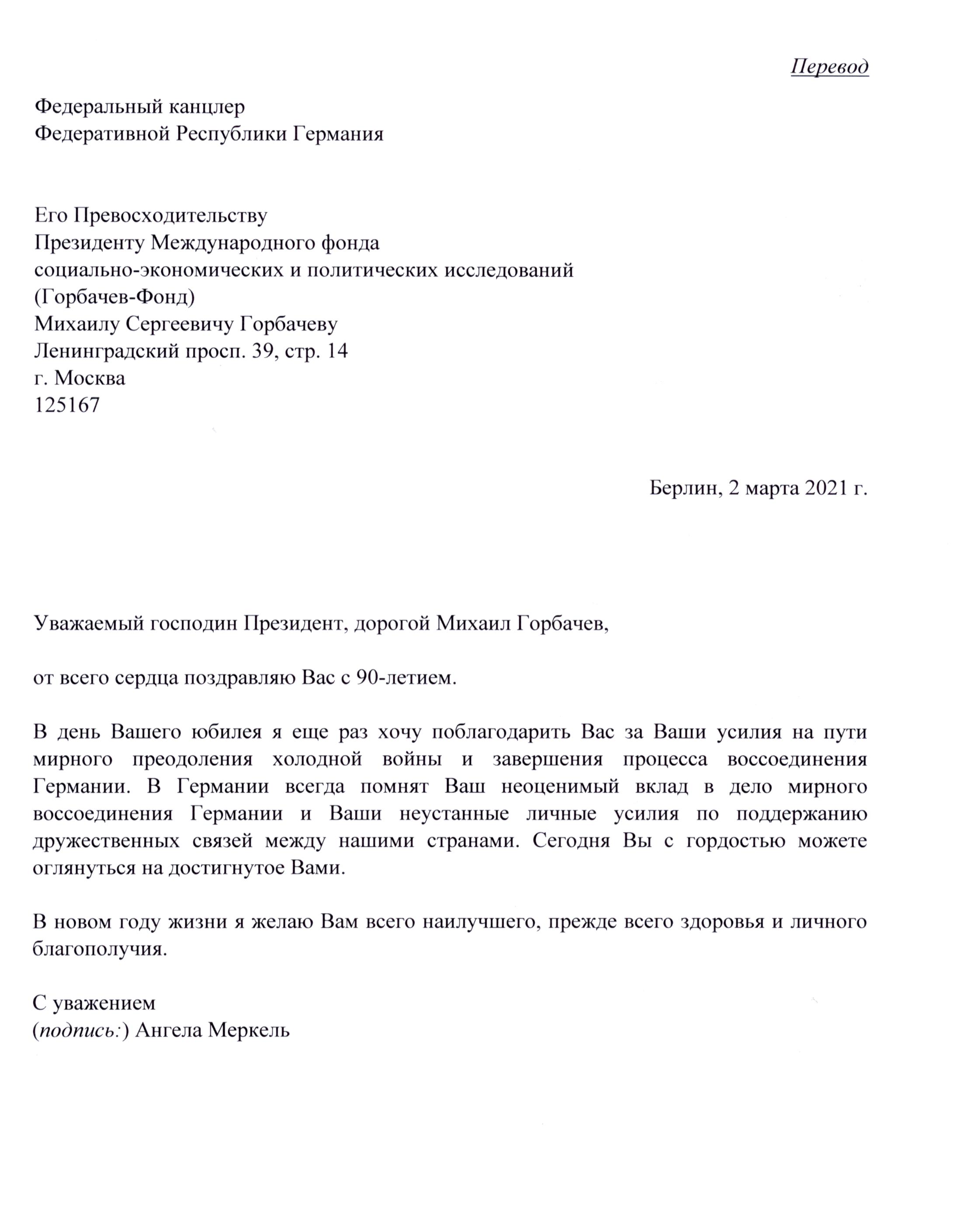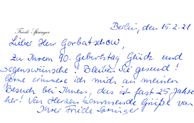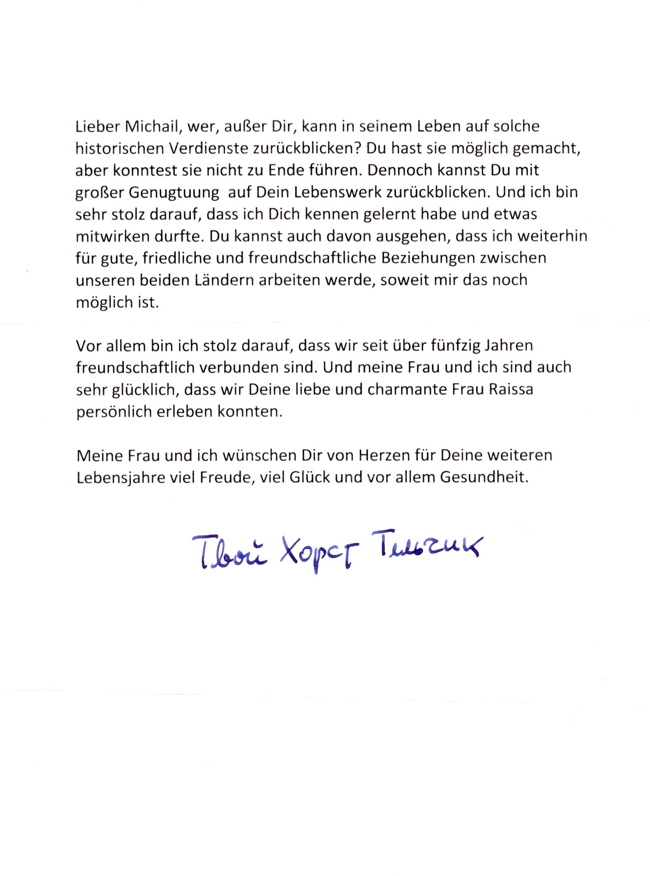 В день твоего 90-летия я хотел бы еще раз выразить благодарность и мое огромное восхищение свершениями твой жизни, без которых мир не был бы таким, каков он сегодня. Сотни миллионов людей присоединятся к моей благодарности и моему восхищению. Ибо ты в середине 80-х годов, идя путем Гласности и перестройки, воспламенил ту искру, благодаря которой твоя родина и моя родина, и прежде всего моя нынешняя родина, Германия, смогли положить начало переменам к лучшему, и уже благодаря только этому ты предоставил миллионам людей возможность самоопределиться, самим взять на себя ответственность за свою жизнь и вместе со своими семьями жить в условиях свободы.