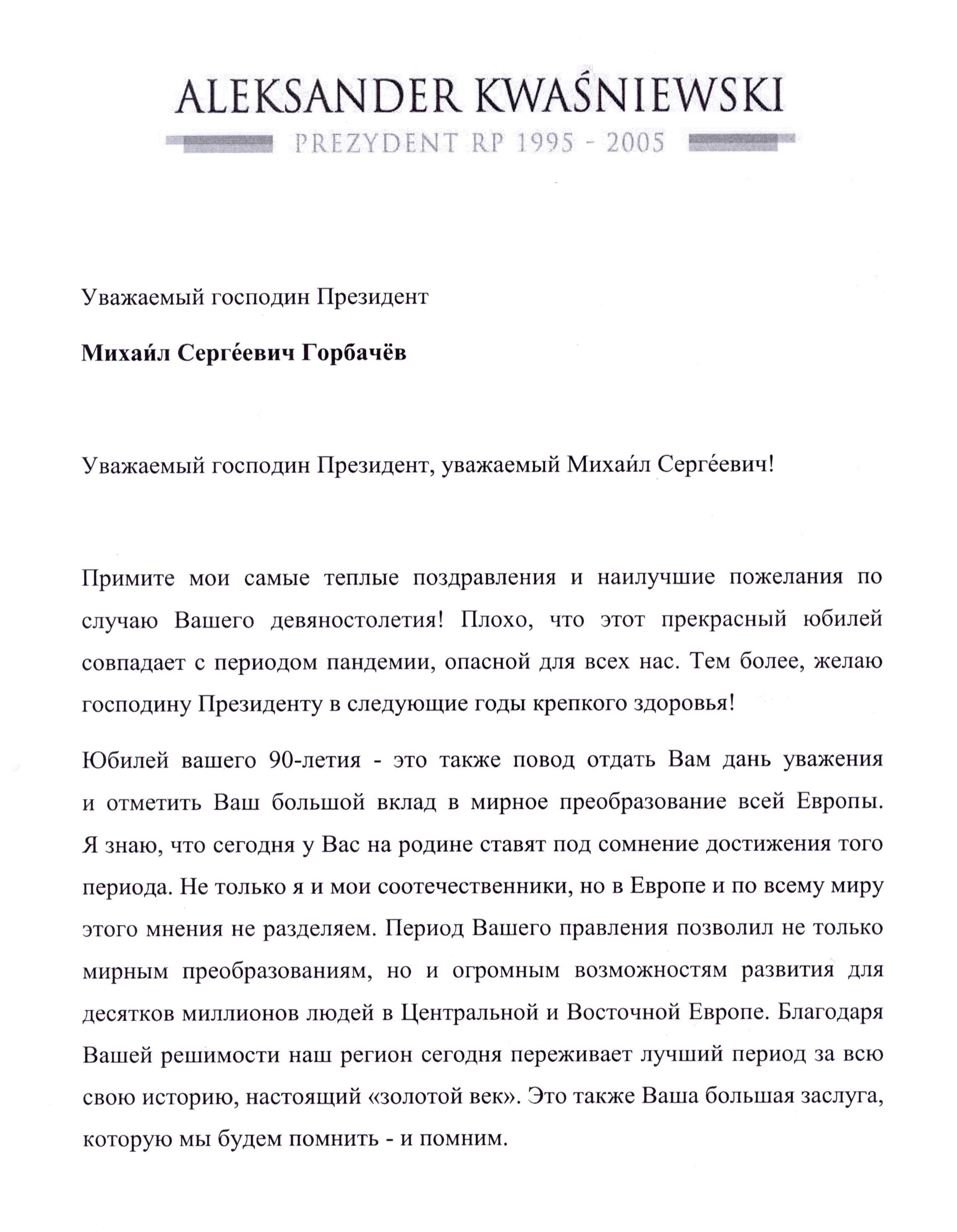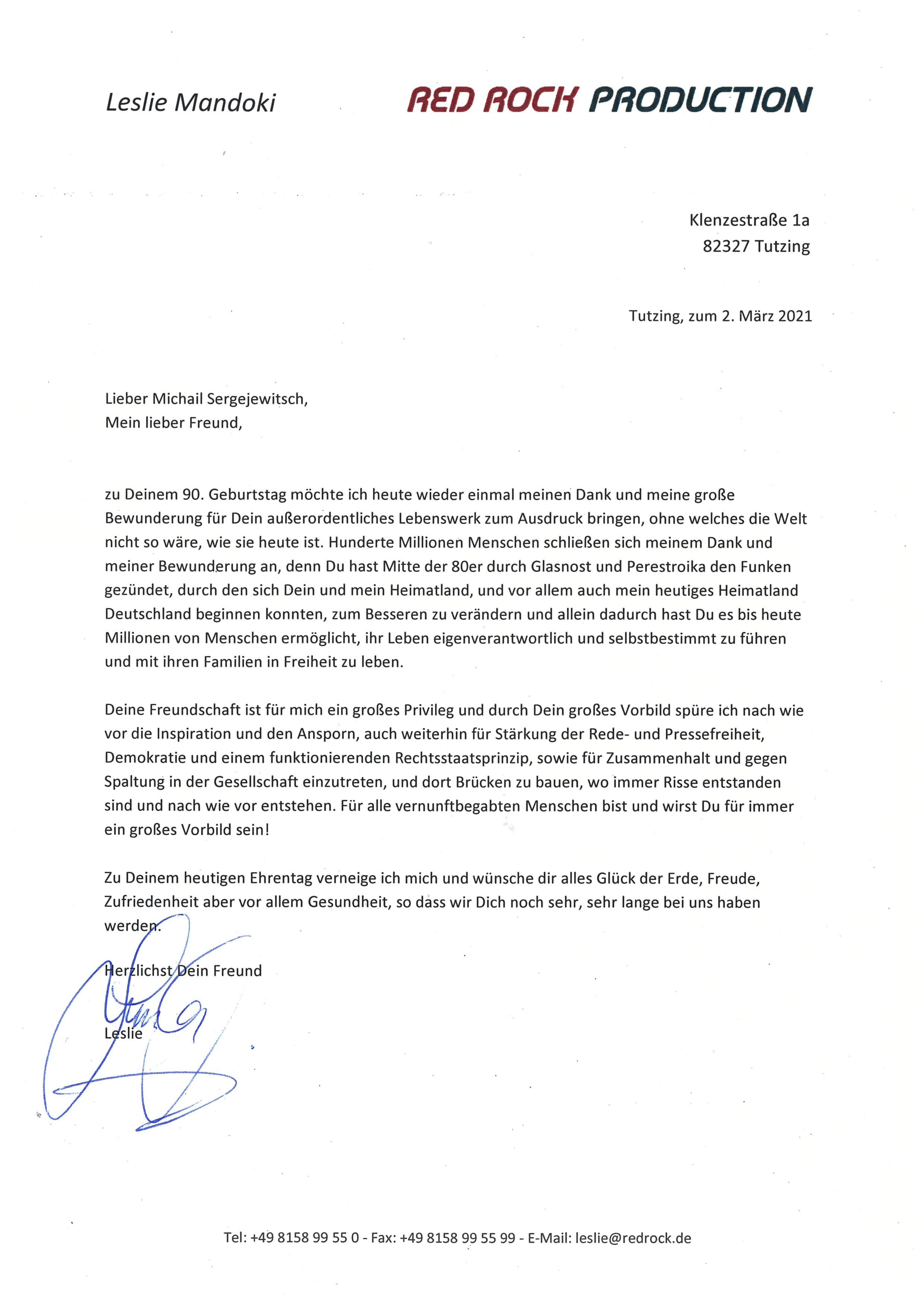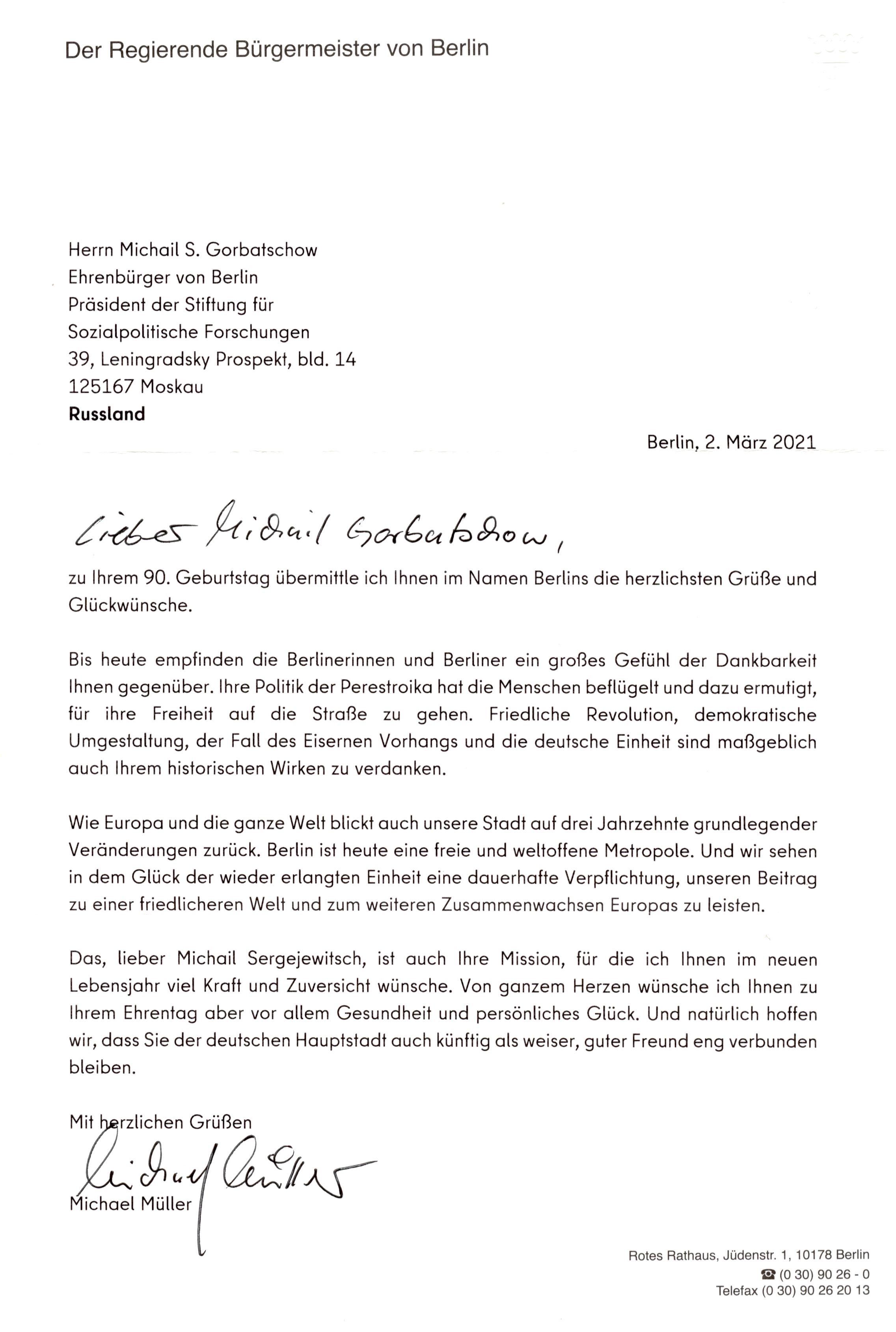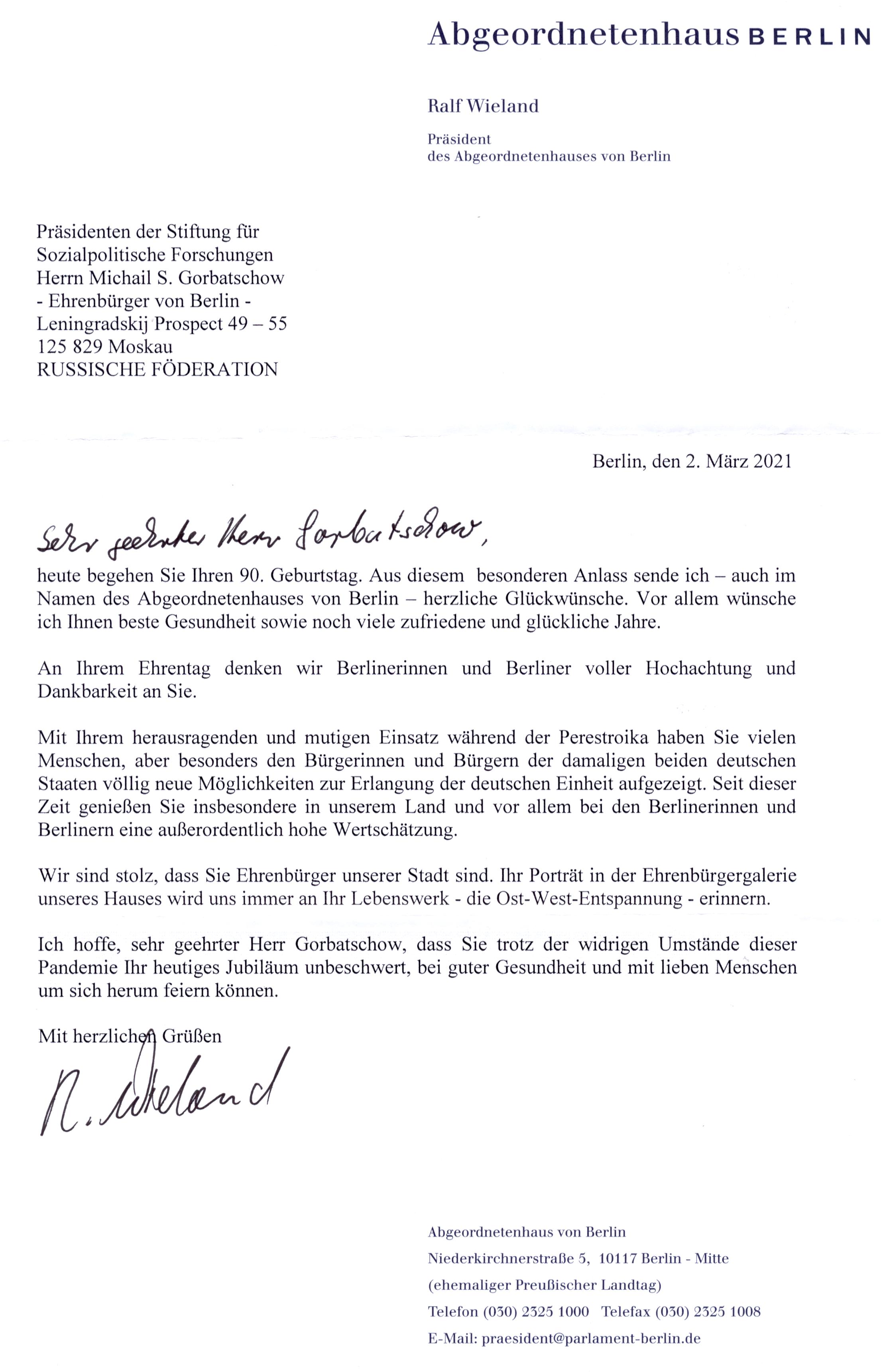 В день твоего 90-летия я хотел бы еще раз выразить благодарность и мое огромное восхищение свершениями твой жизни, без которых мир не был бы таким, каков он сегодня. Сотни миллионов людей присоединятся к моей благодарности и моему восхищению. Ибо ты в середине 80-х годов, идя путем Гласности и перестройки, воспламенил ту искру, благодаря которой твоя родина и моя родина, и прежде всего моя нынешняя родина, Германия, смогли положить начало переменам к лучшему, и уже благодаря только этому ты предоставил миллионам людей возможность самоопределиться, самим взять на себя ответственность за свою жизнь и вместе со своими семьями жить в условиях свободы.