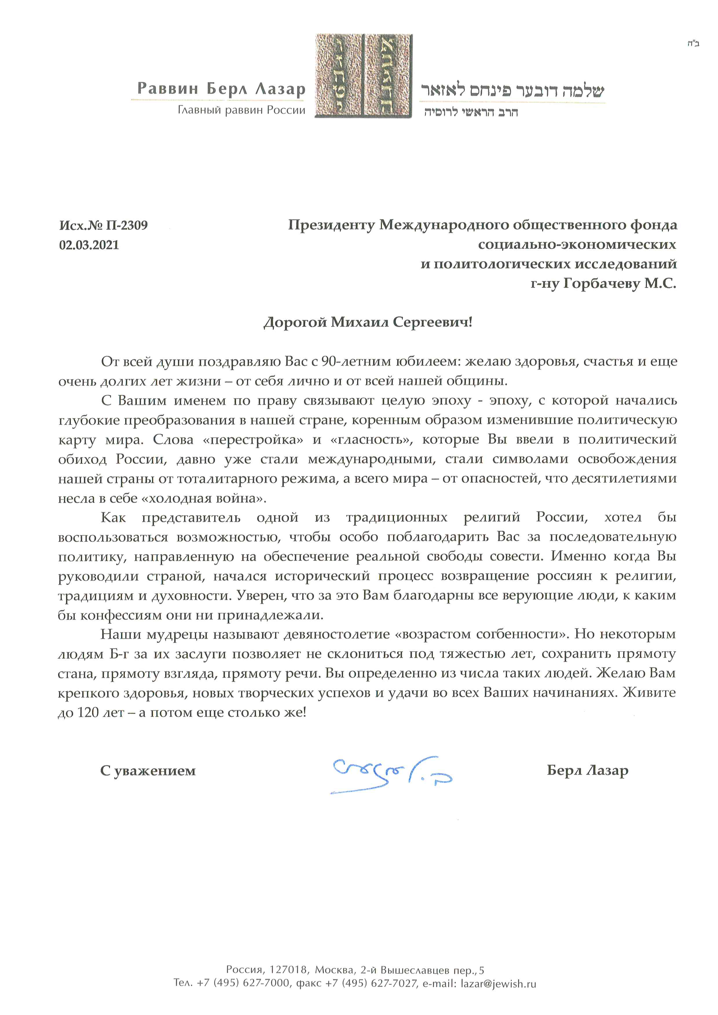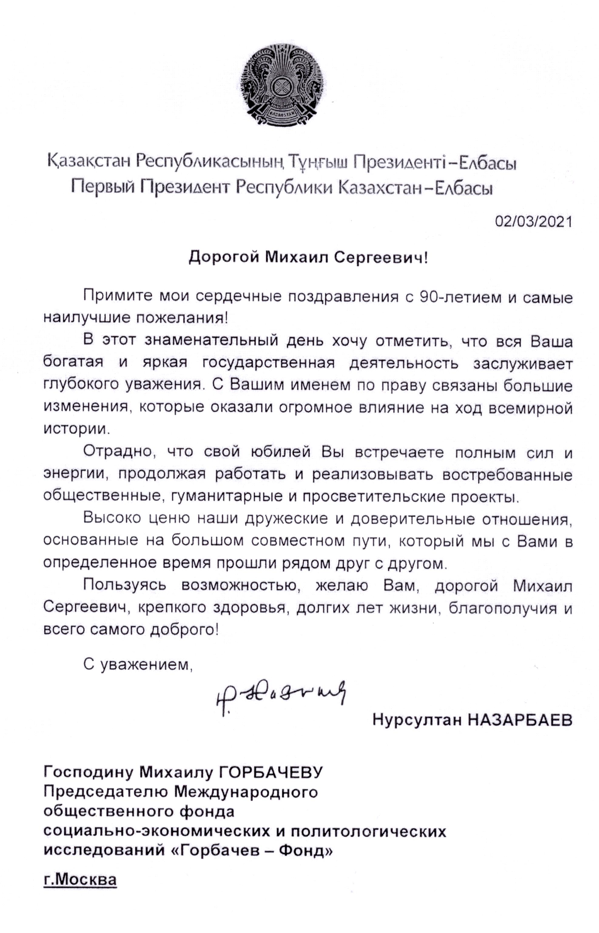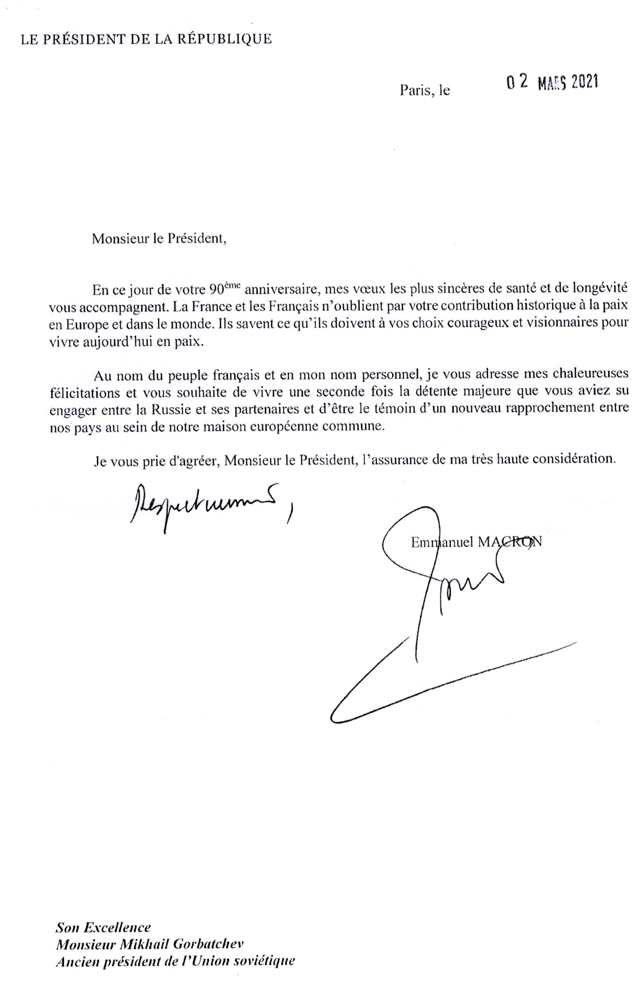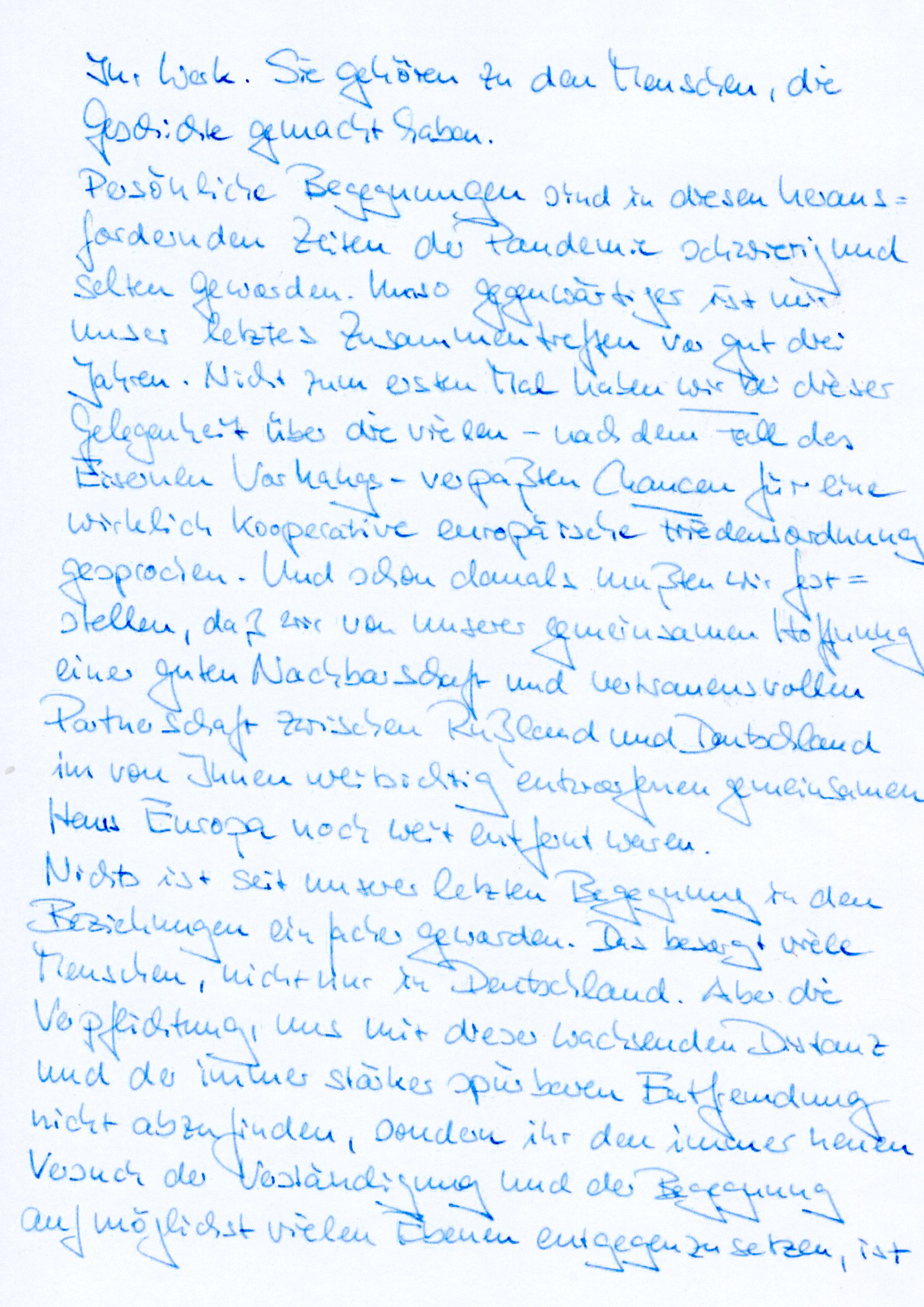 В день твоего 90-летия я хотел бы еще раз выразить благодарность и мое огромное восхищение свершениями твой жизни, без которых мир не был бы таким, каков он сегодня. Сотни миллионов людей присоединятся к моей благодарности и моему восхищению. Ибо ты в середине 80-х годов, идя путем Гласности и перестройки, воспламенил ту искру, благодаря которой твоя родина и моя родина, и прежде всего моя нынешняя родина, Германия, смогли положить начало переменам к лучшему, и уже благодаря только этому ты предоставил миллионам людей возможность самоопределиться, самим взять на себя ответственность за свою жизнь и вместе со своими семьями жить в условиях свободы.