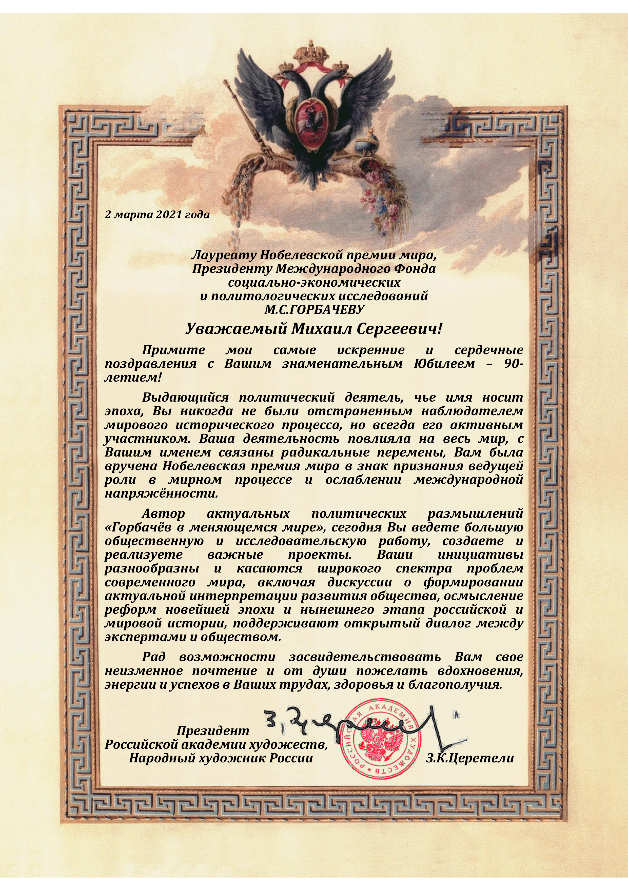![]() ![]() Поздравление Президента российской академии художеств Зураба Церетели