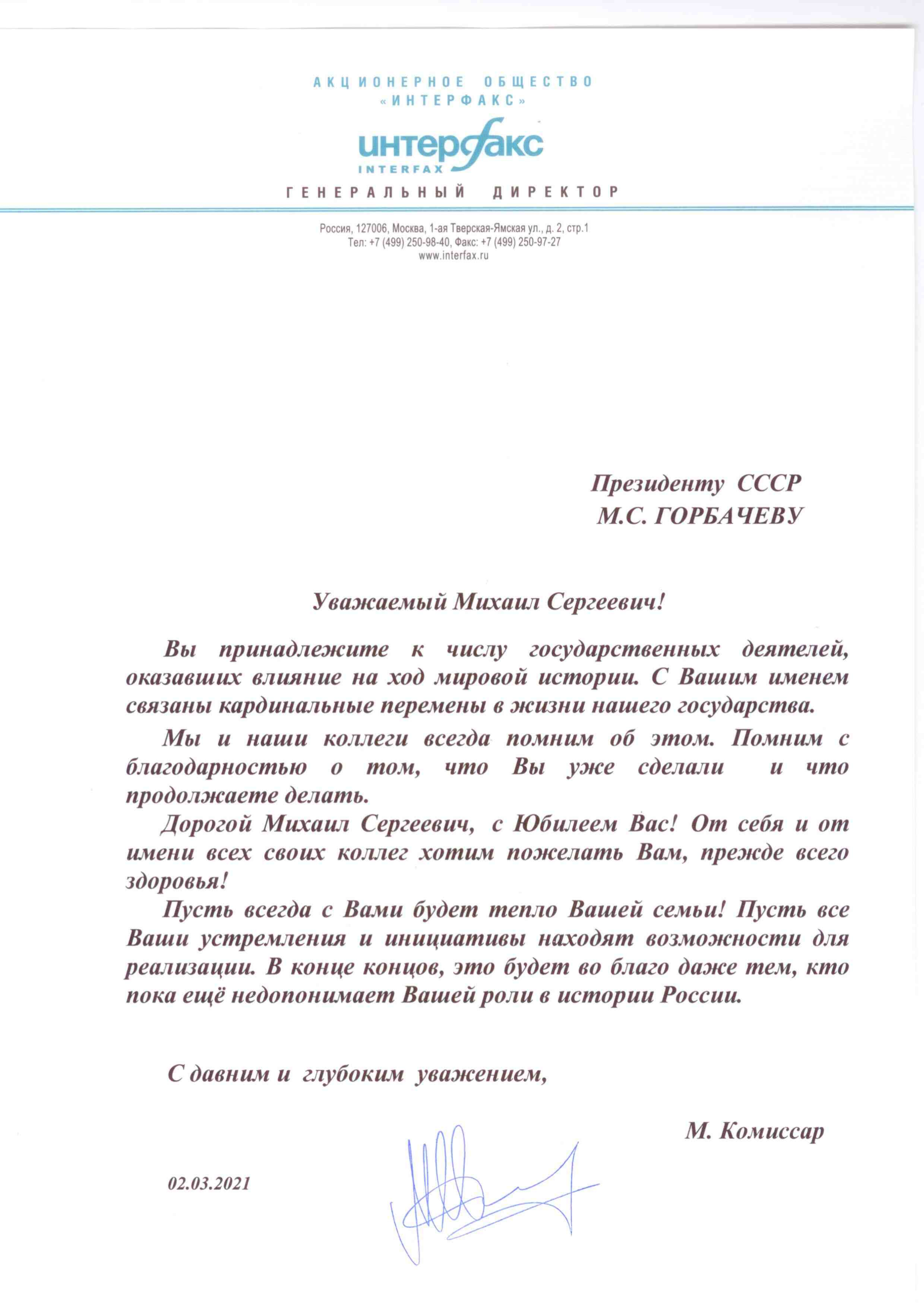 ![]() Поздравление Генерального директора «Интерфакс» Комиссара М.В.