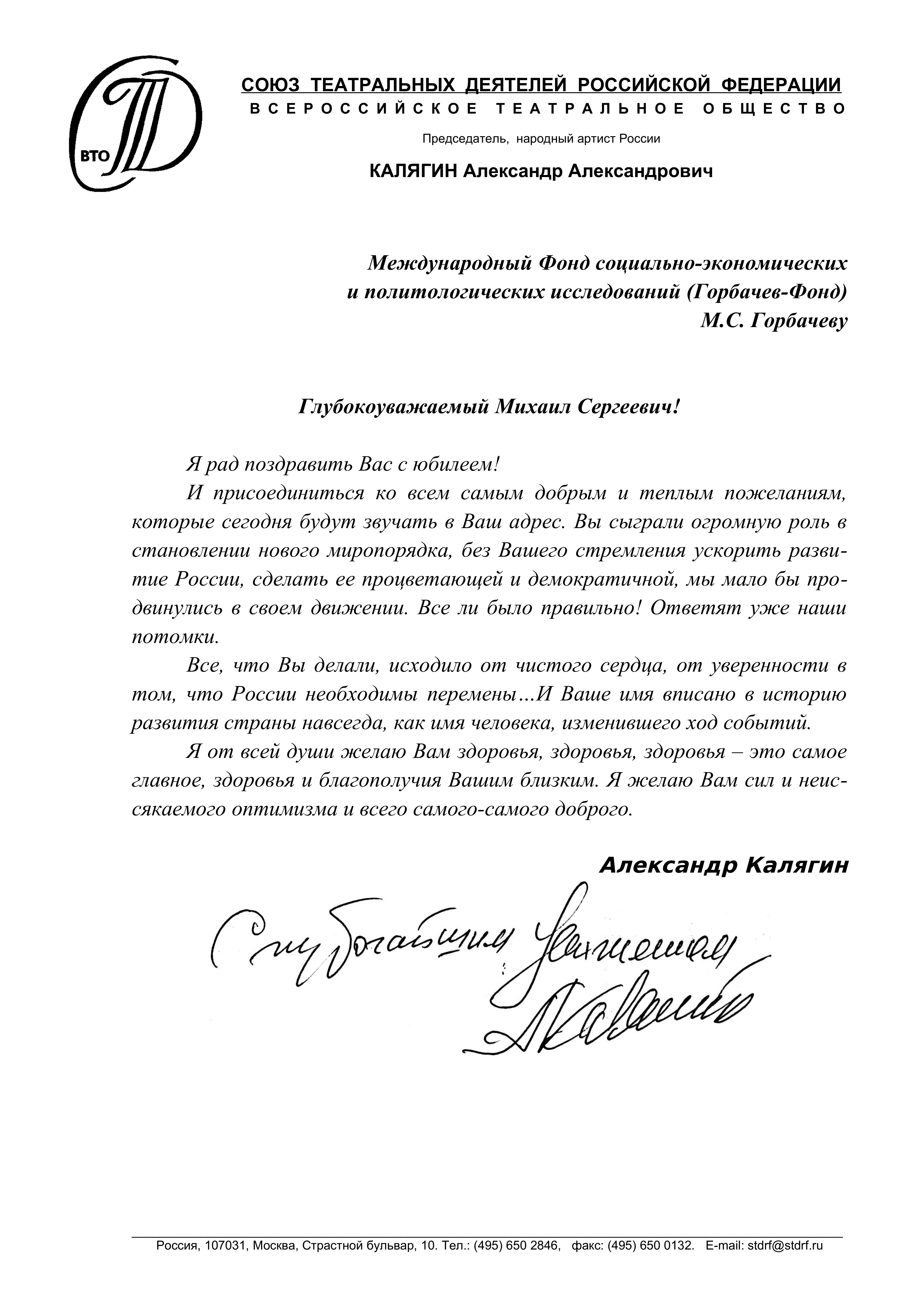 Поздравление Председателя Союза театральных деятелей РФ Калягина А.А.