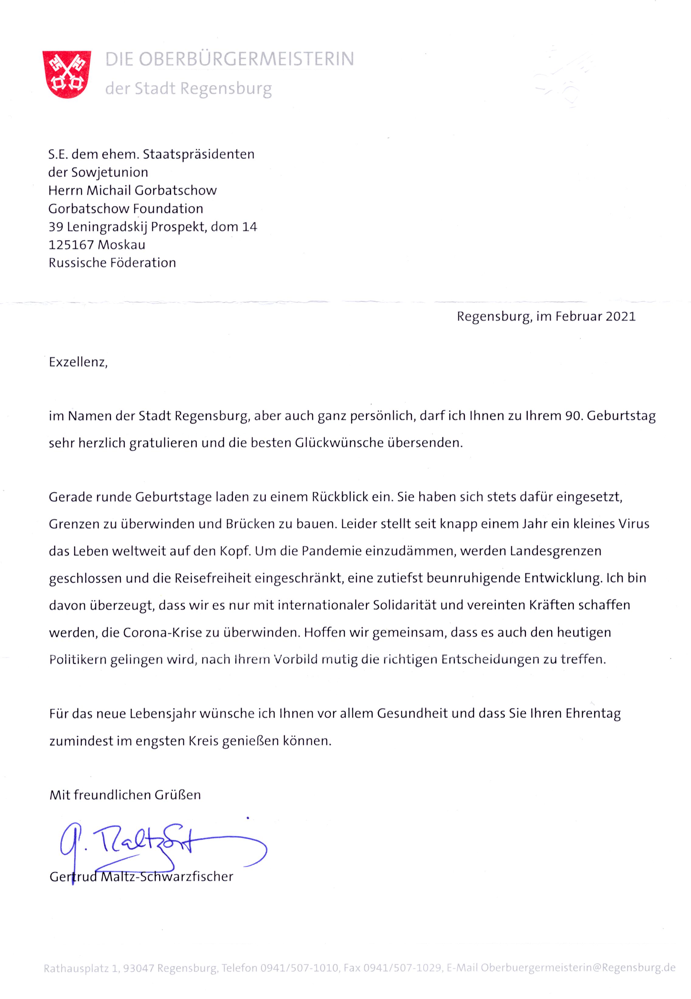 Для меня большая радость поздравить Вас с 90-летием от имени города Аугсбурга и от себя лично и передать Вам самые лучшие пожелания на новый год Вашей жизни.