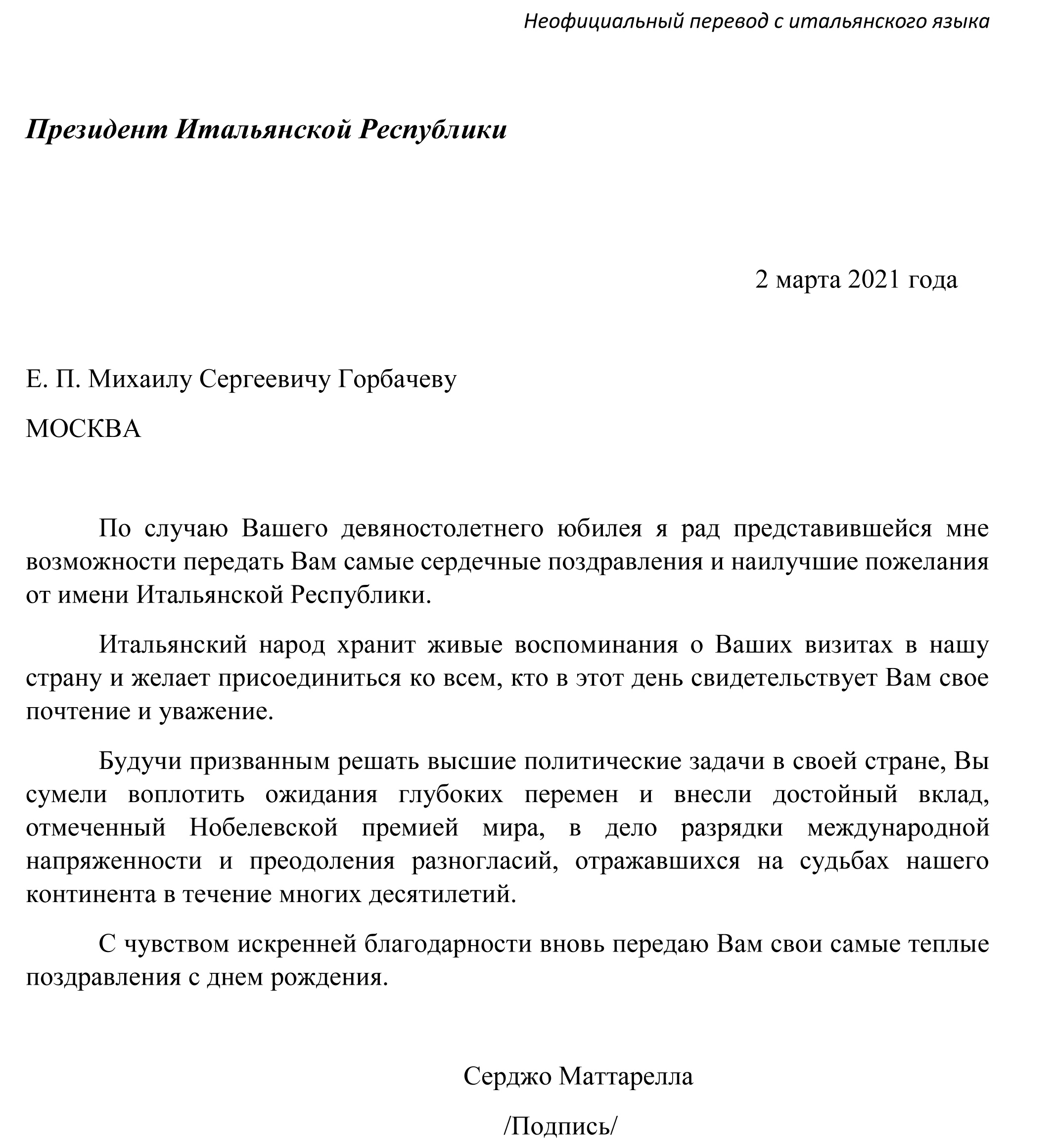 ![]() ![]() Поздравление Президента Итальянской Республики Серджо Маттареллы
