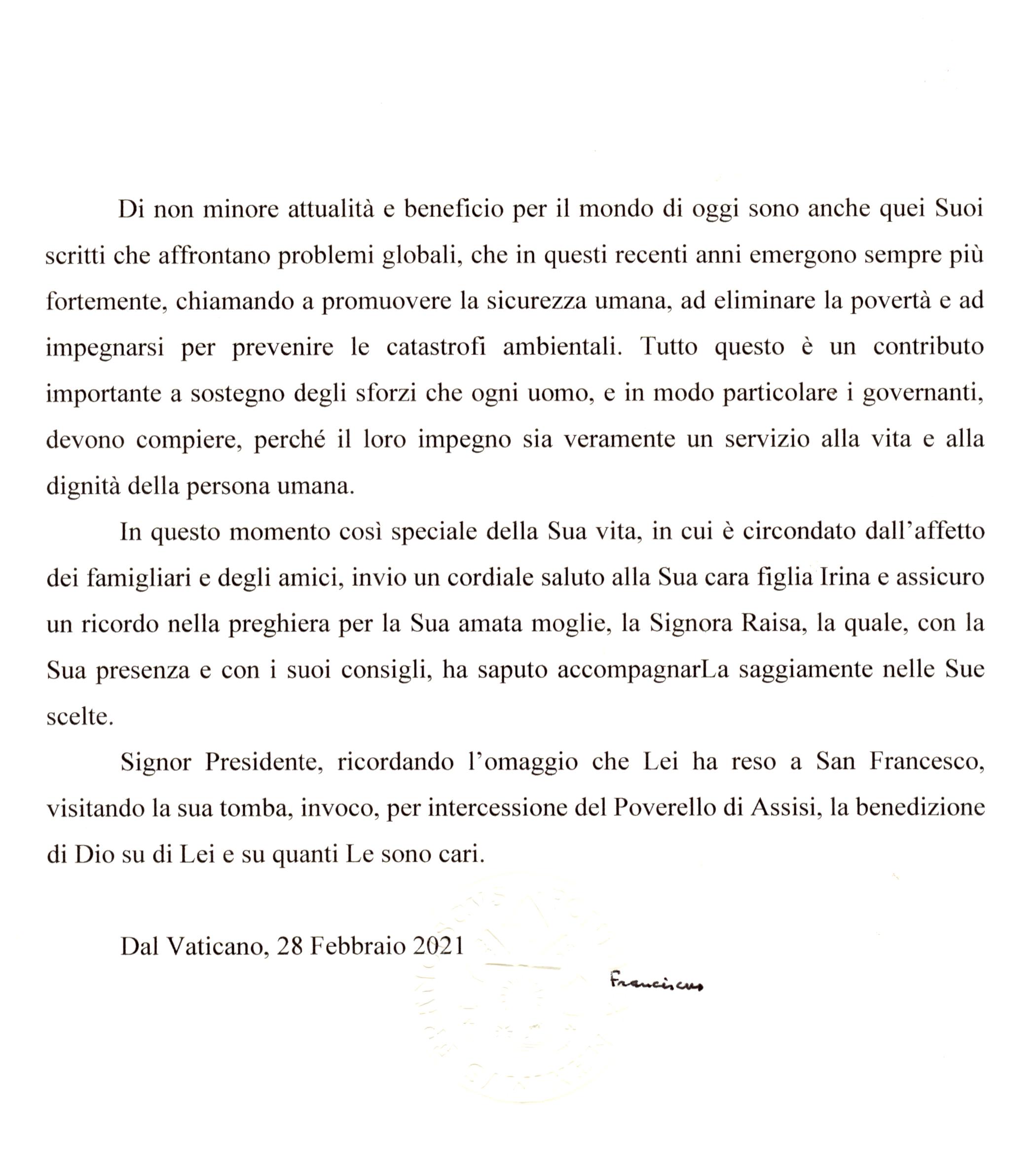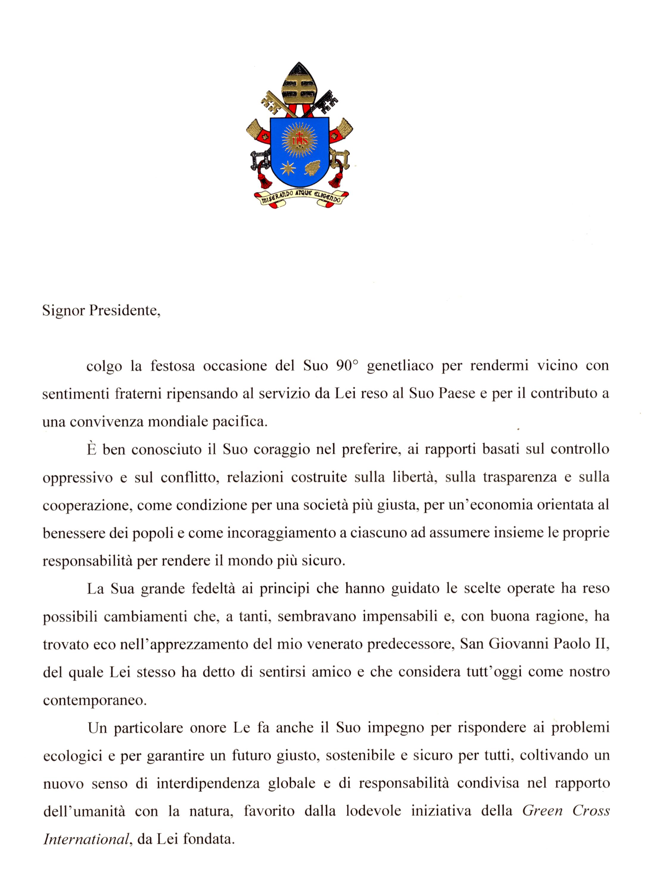 Господин Президент, вспоминая о том почтении, которое вы оказали Святому Франциску, посетив его могилу, через заступничество Бедняка из Ассизи, испрашиваю Божье благословение для Вас и для всех тех, кто Вам дорог.