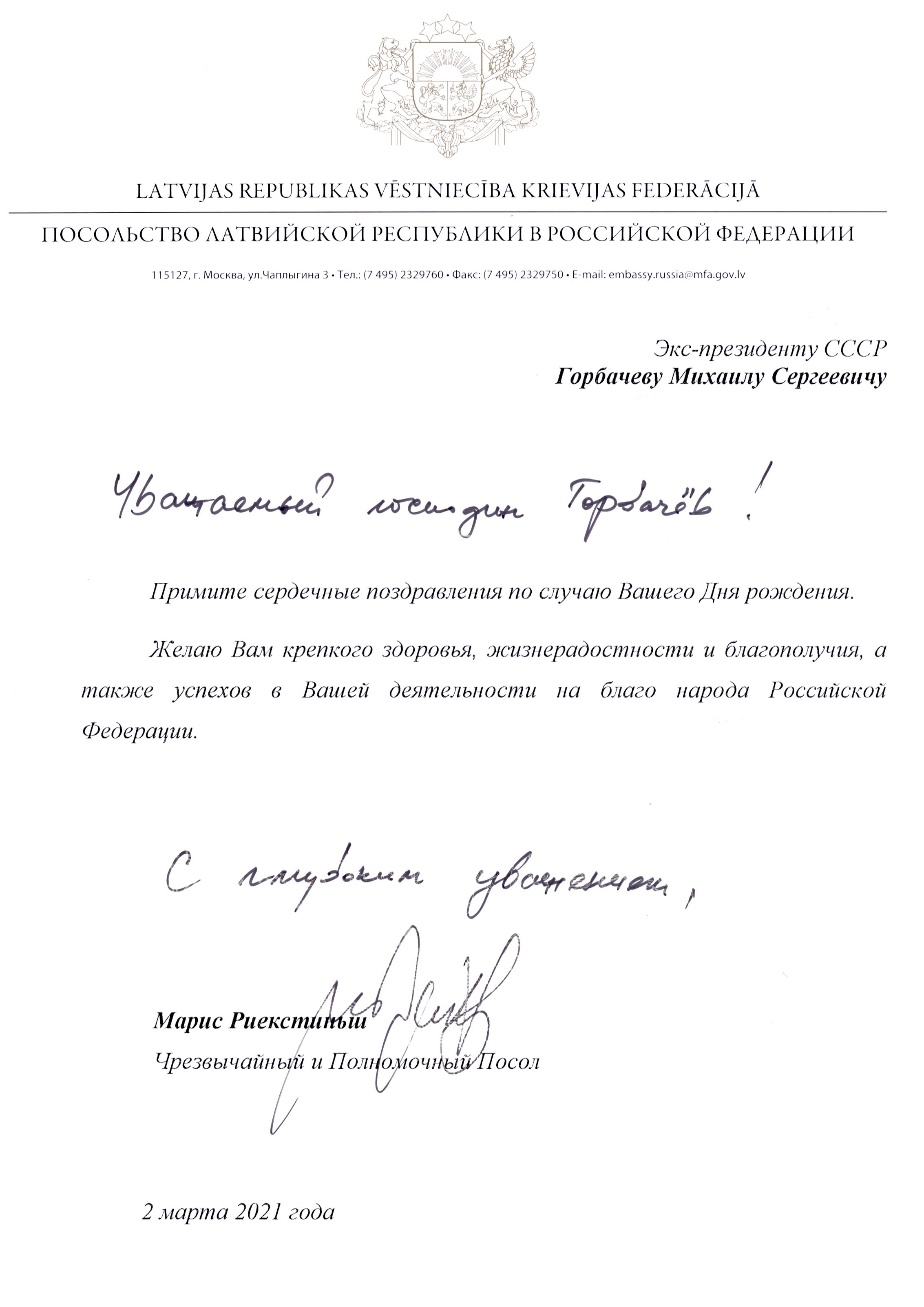 ![]() Поздравление посла Латвийской Республики в РФ Мариса Риекстиньша