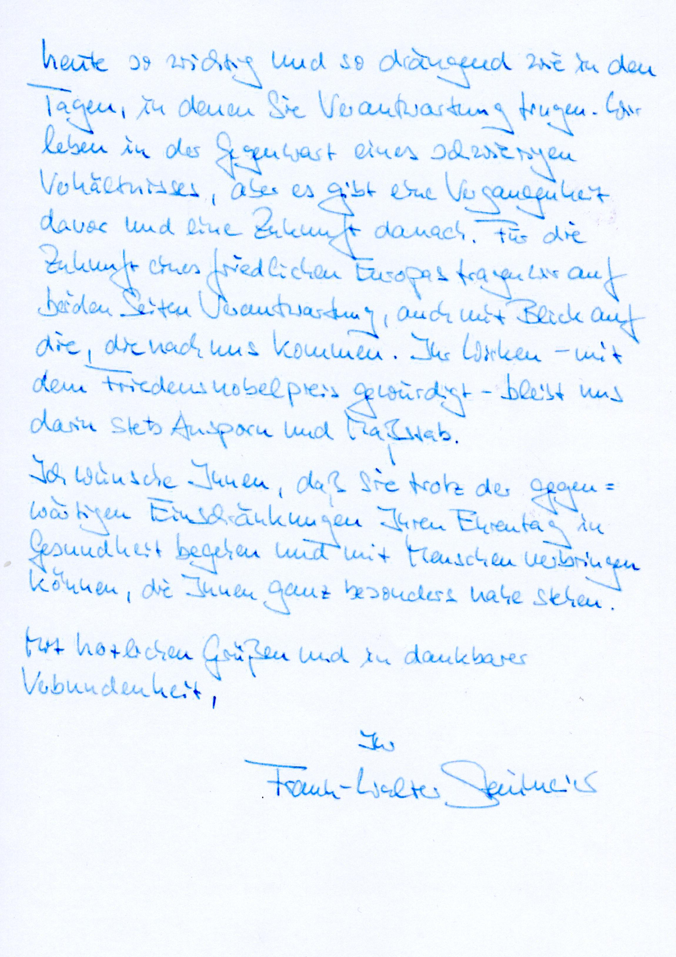 Именно те Дни рождения, которые являются «круглыми датами», побуждают окинуть взором недавнее прошлое. Вы постоянно прилагали усилия, чтобы преодолевать границы и наводить мосты. К сожалению, вот уже около года маленький вирус ставит жизнь во всем мире с ног на голову. Чтобы подавить пандемию, закрываются границы между странами, ограничивается свобода передвижения – это крайне тревожный процесс. Я убеждена, что только международная солидарность и объединенные усилия помогут нам одержать верх над корона-вирусом. Будем вместе надеяться, что и сегодняшним деятелям, следуя Вашему примеру, удастся, проявив смелость, принять правильные решения.