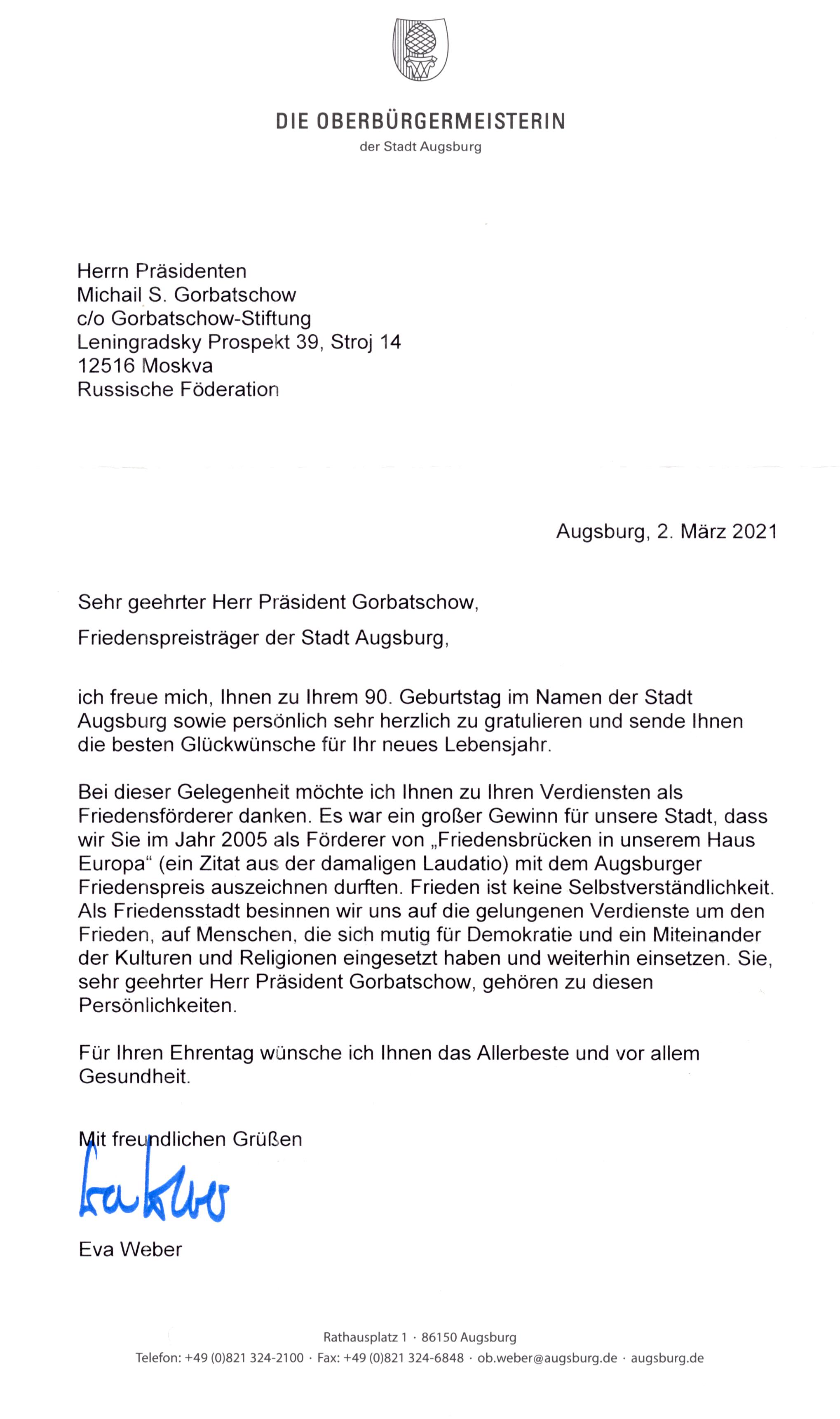 Пользуясь случаем, хочу поблагодарить Вас за Ваши заслуги в отстаивании дела мира. Для нашего города стало огромной удачей, что мы получили возможность в 2005 году наградить Вас Аугсбургской премией мира как человека «наводящего мосты в нашем европейском доме» (это цитата из тогдашней речи произнесенной в Вашу честь). Мир не есть нечто само собою разумеющееся. Как граждане города мира мы помним замечательные заслуги людей, которые смело вступали в борьбу за демократию и взаимодействие культур и религий и продолжают бороться за это. Вы, глубокоуважаемый господин Президент Горбачев, принадлежите к этим личностям.