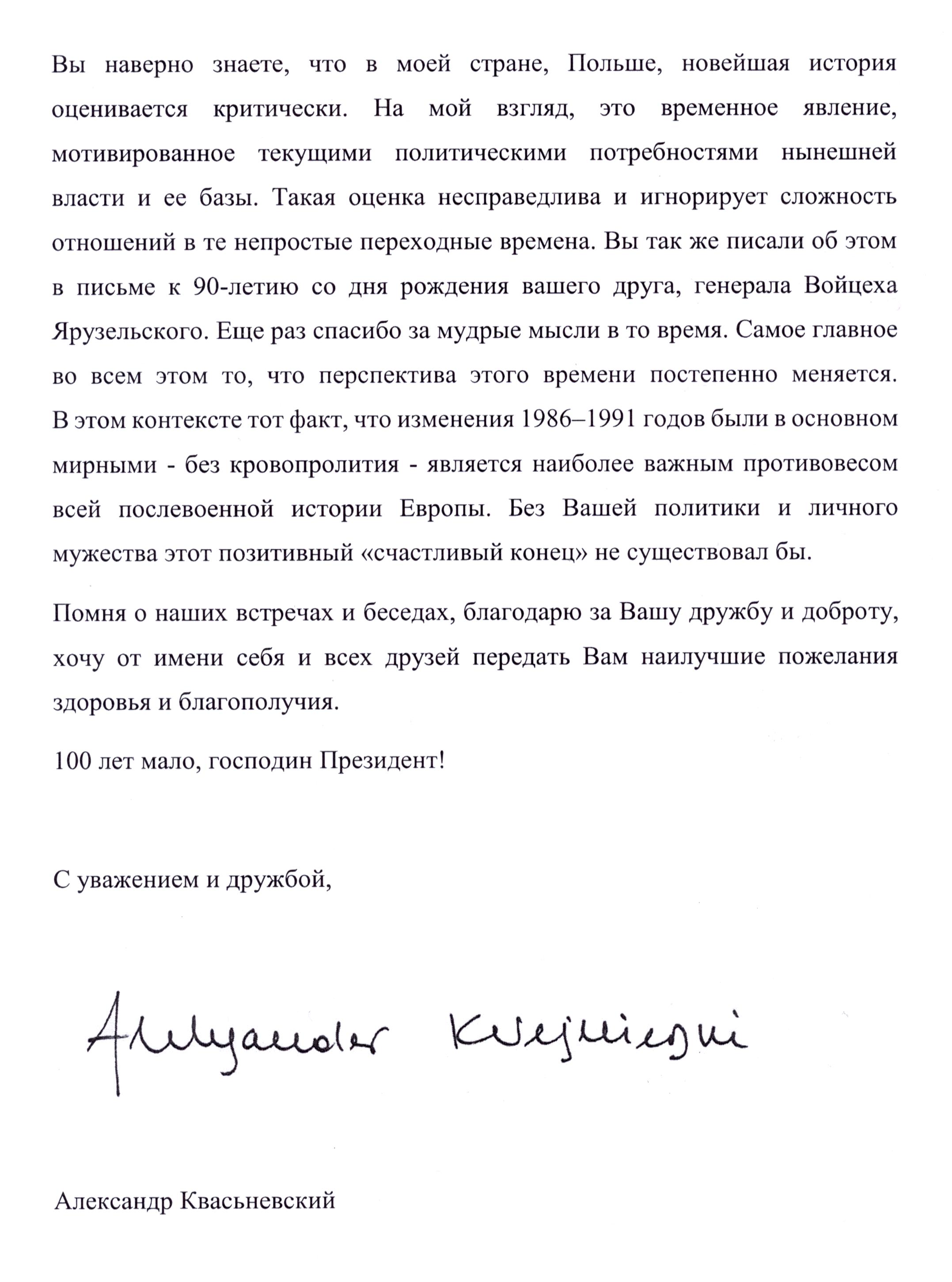 Как я не раз говорил и писал, я уверен, что ты займешь почетное место в истории как человек, который отказался применить силу ради того, чтобы удержать империю. В мире понимают и ценят мудрость твоих решений. Сегодня осталось уже немного людей, которые тесно взаимодействовали с тобой, и как один из них, я с гордостью об этом свидетельствую.