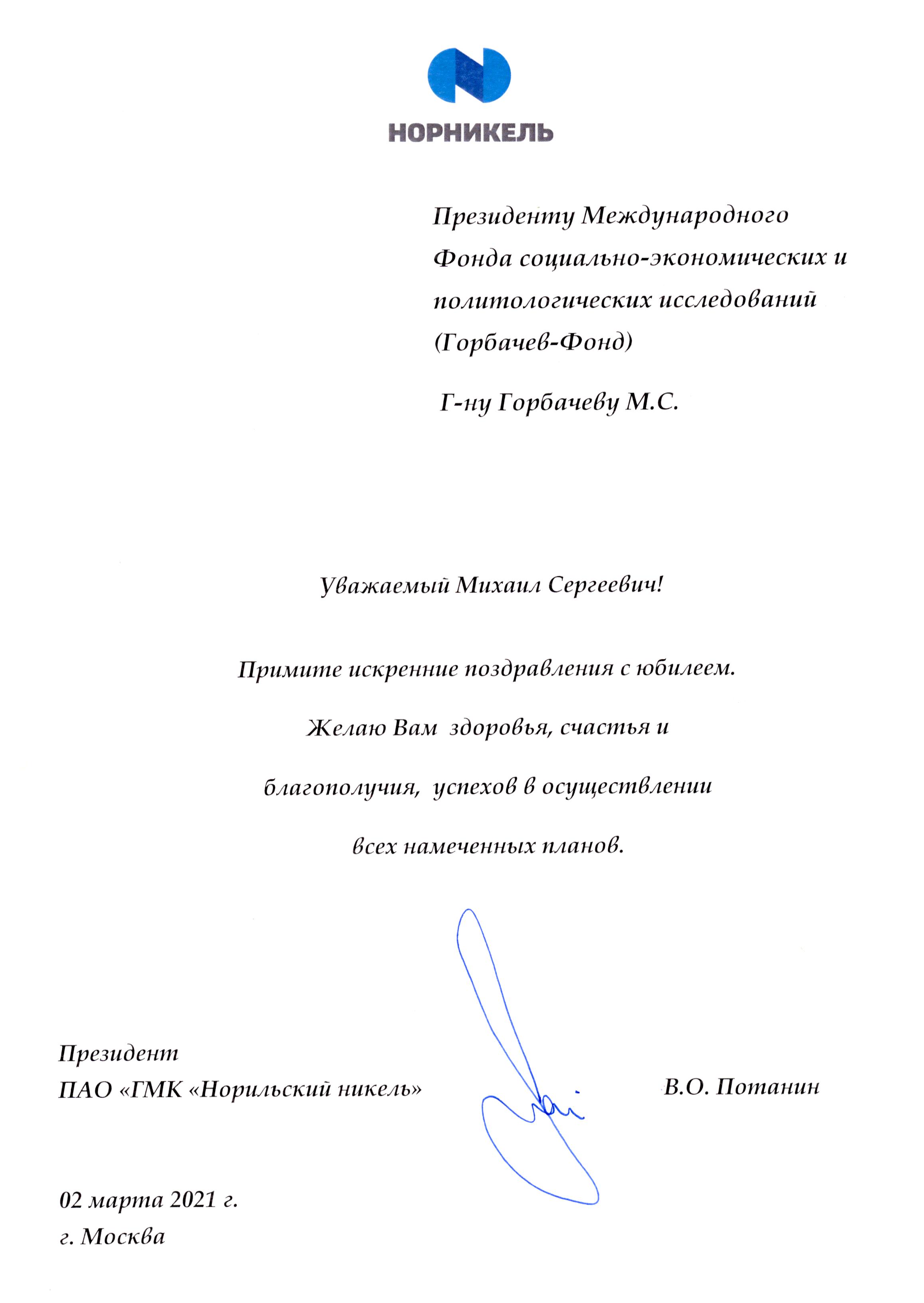 ![]() ![]() Поздравление президента ПАО «ГМК «Норильский никель» Потанина В.О.