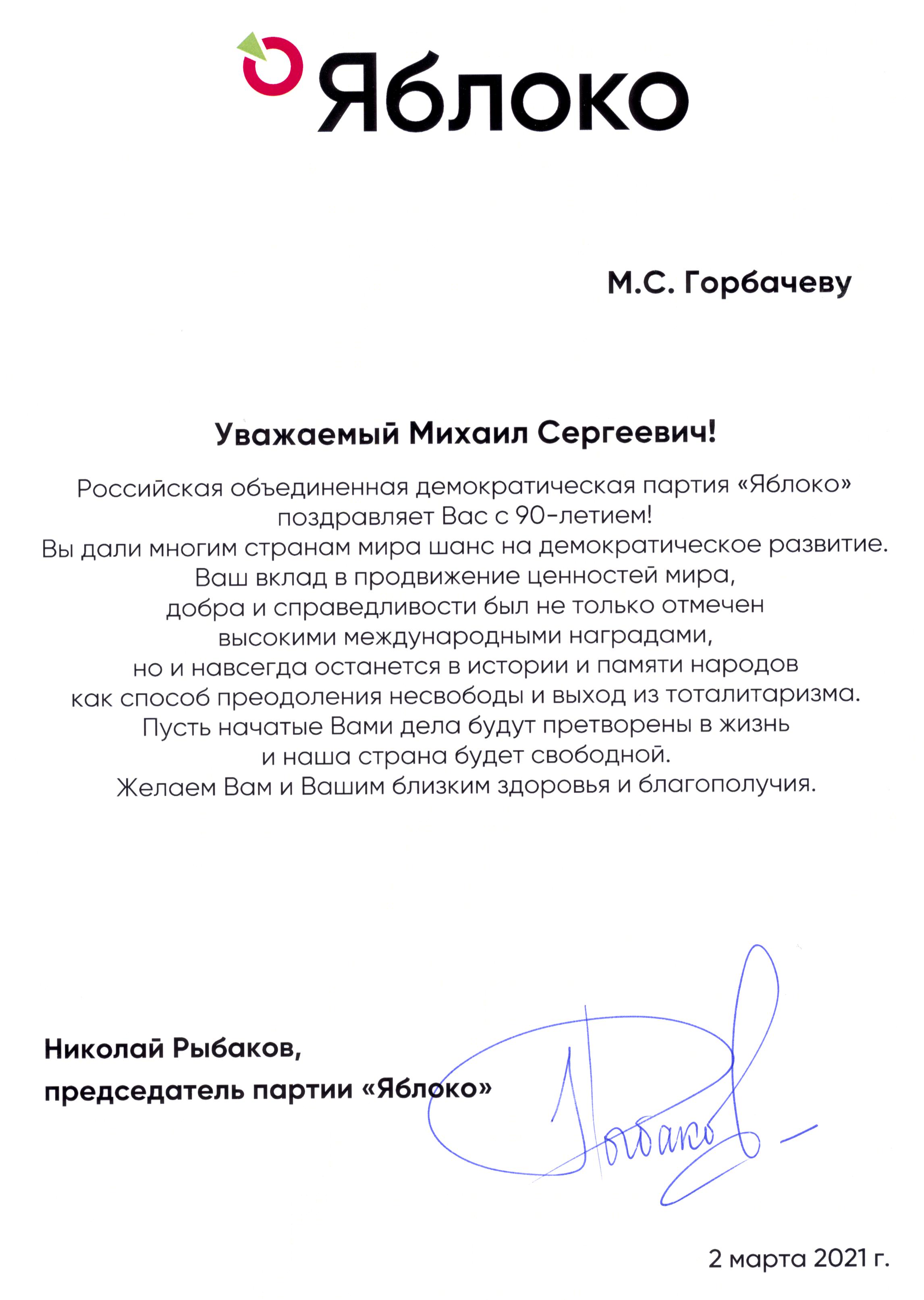 ![]() Поздравление председателя партии «Яблоко» Рыбакова Н.И.