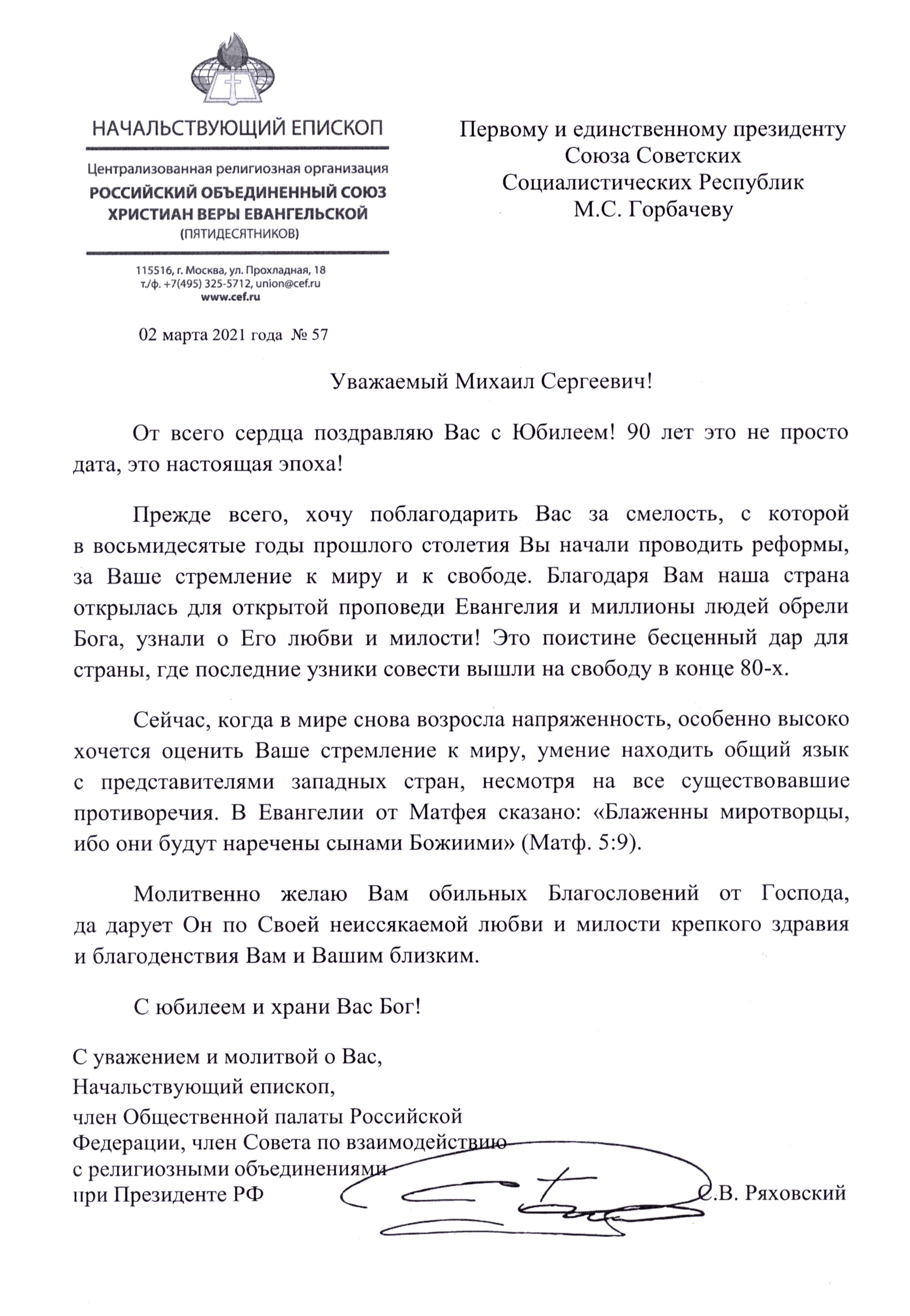 ![]() Поздравление начальствующего епископа Российского объединенного союза христиан веры евангельской Ряховского С.В.