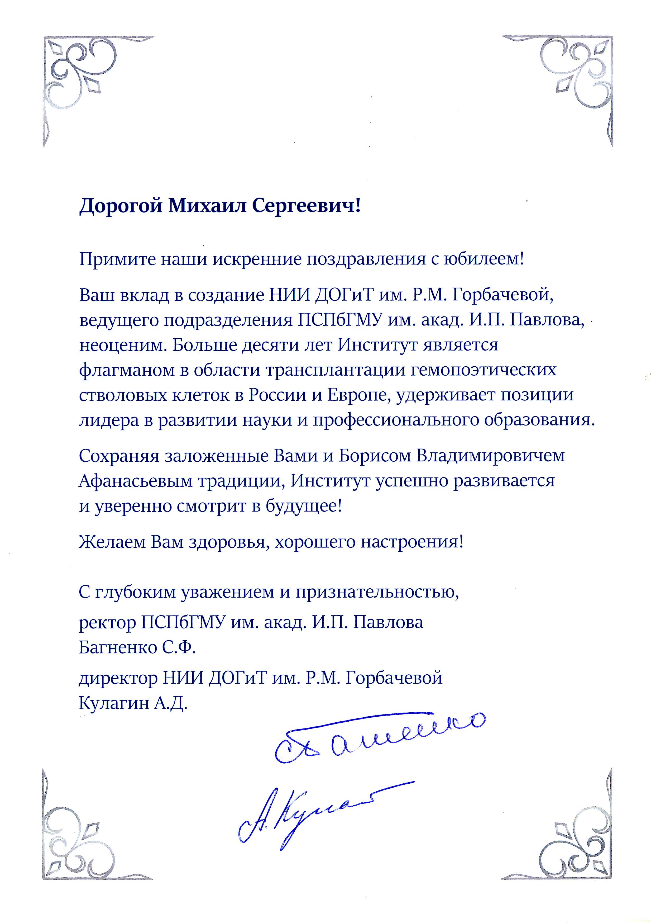 ![]() Поздравление НИИ детской гематологии и трансплантологии им.Р.М.Горбачевой