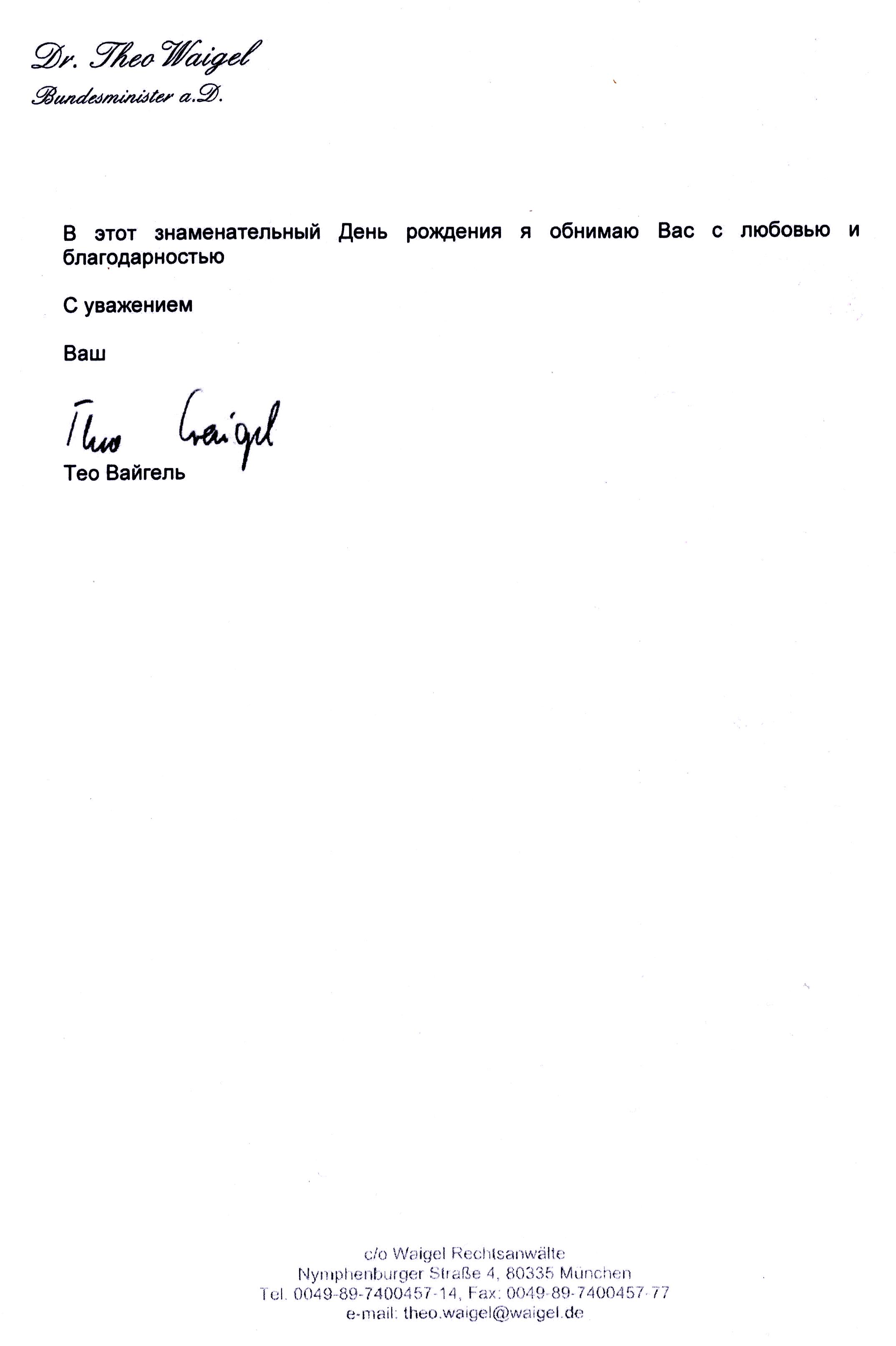 ![]() ![]() Поздравление бывшего министра финансов ФРГ Тео Вайгеля