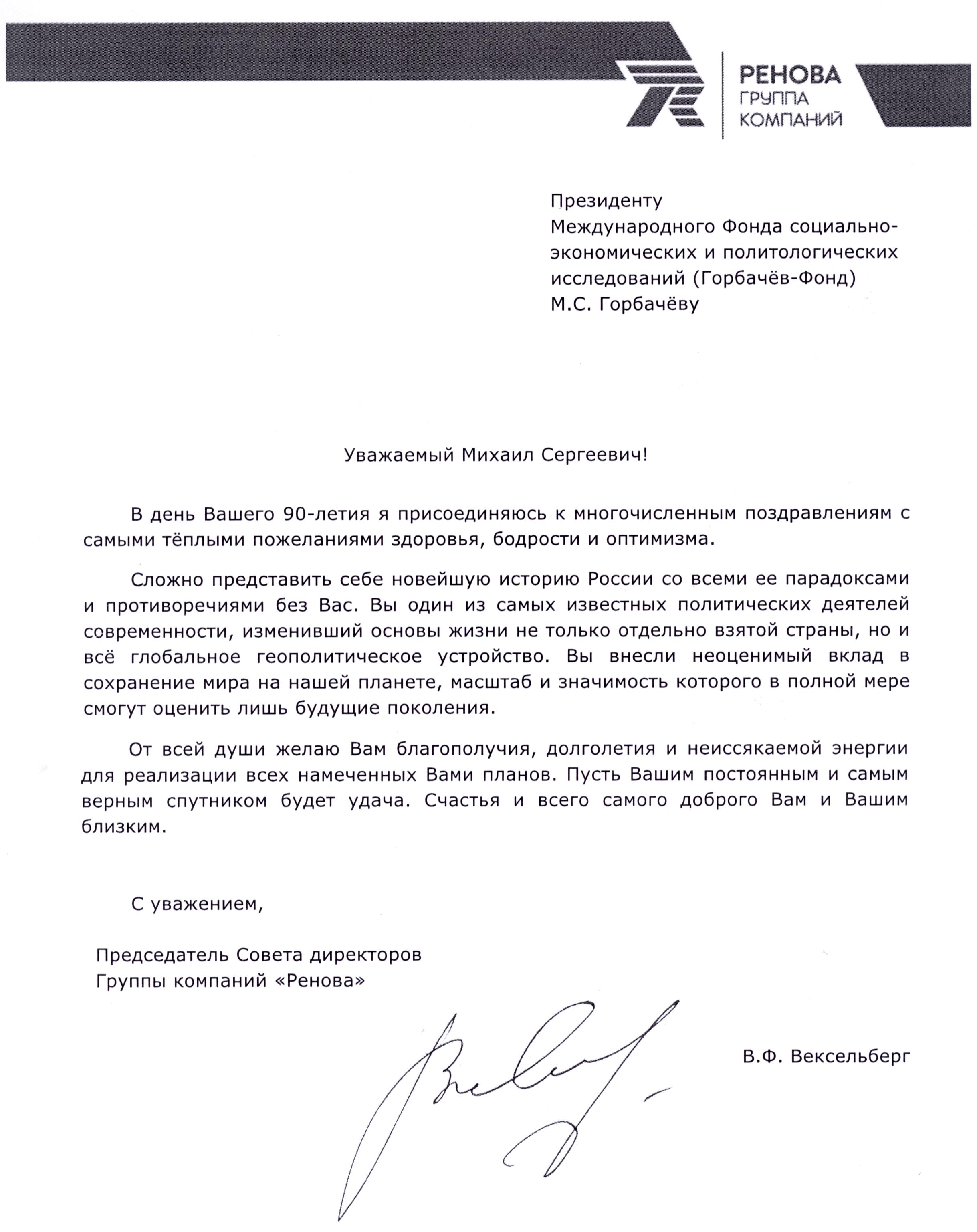 ![]() Поздравление председателя Совета директоров группы компаний «Ренова» Вексельберга В.Ф.