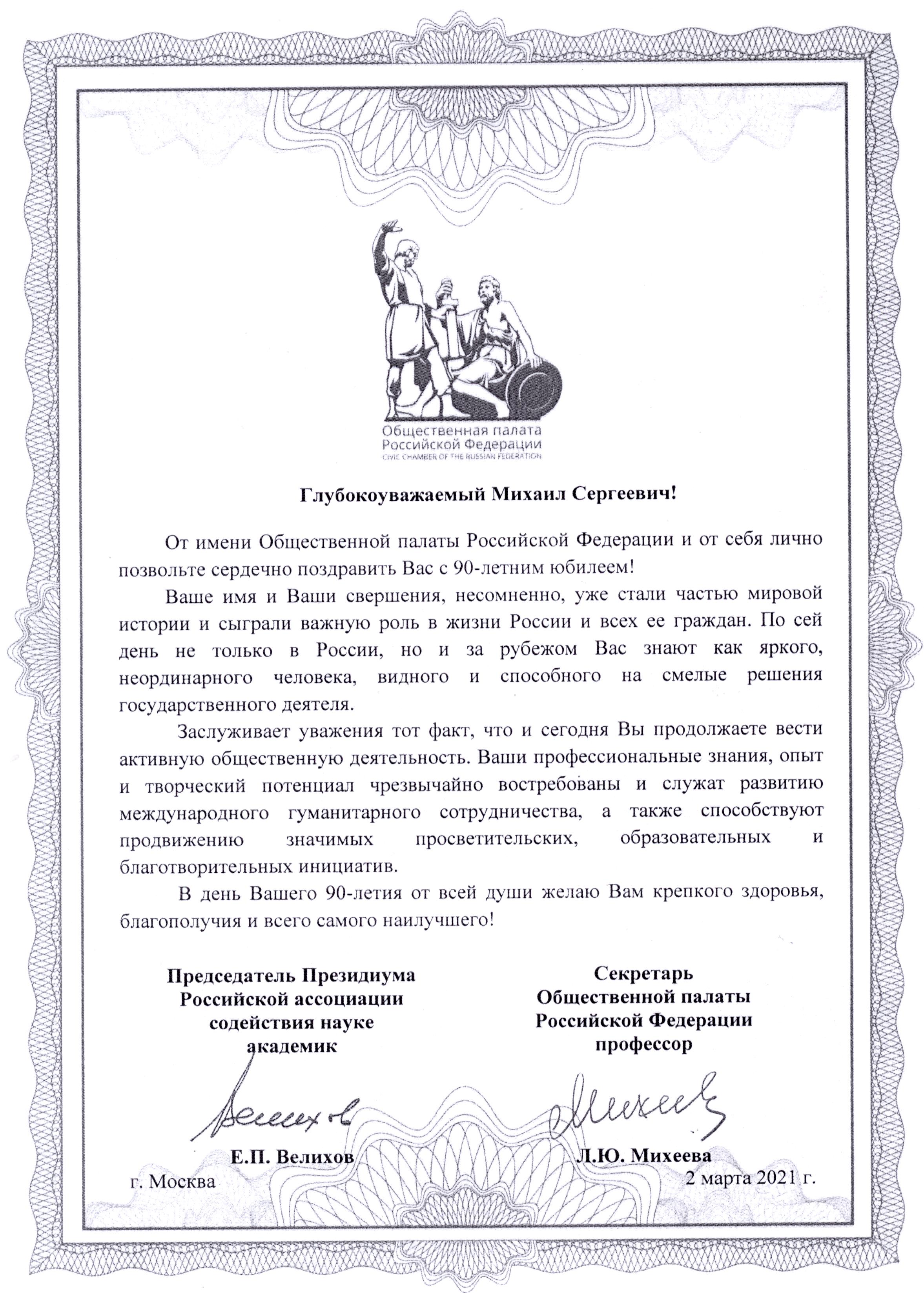 ![]() Поздравление от имени Общественной палаты РФ (Велихов)